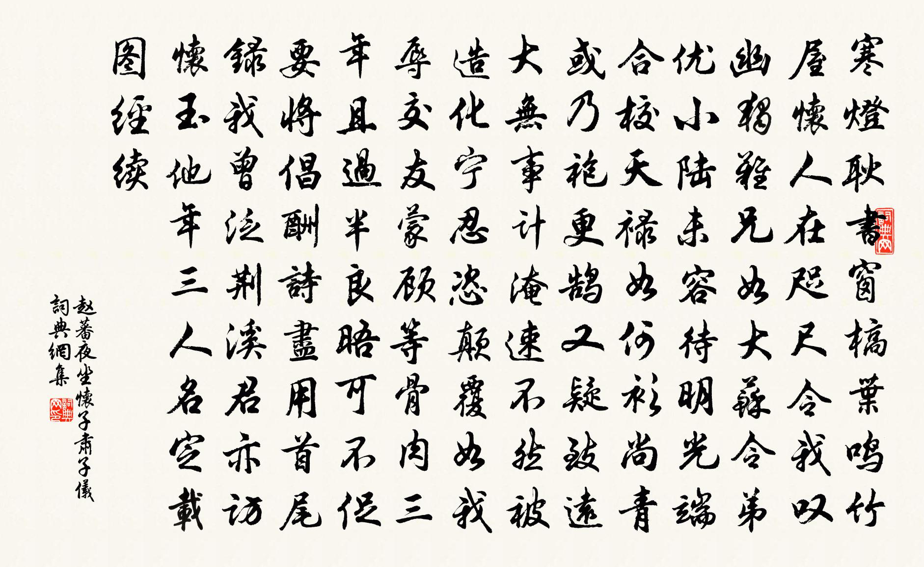 詩詞名句歷史字典書法欣賞書法字典國語詞典說文解字康熙字典古漢語字典標 題 作 者 詩 句 夜坐懷子肅子儀作者:趙蕃 朝代:宋代夜坐懷子肅子儀原文寒燈耿書窗,槁葉鳴竹屋。懷人在咫尺,令我嘆幽獨。難兄如大蘇,令弟優小陸。未容待明光,端合校天祿。如何衫尚青,或乃袍更鵠。又疑致遠大,無事計淹速。不然被造化,寧忍恣顛覆。如我辱交友,蒙顧等骨肉。三年且過半,良晤可不促。要將倡酬詩。盡用首尾錄。我曾泛荊溪,君亦訪懷玉。他年三人名,定載圖經續。詩詞問答問:夜坐懷子肅子儀的作者是誰?答:趙蕃問:夜坐懷子肅子儀寫於哪個朝代?答:宋代趙蕃夜坐懷子肅子儀書法欣賞夜坐懷子肅子儀書法作品詩詞推薦酬裴相公見寄二絕白居易〔唐代〕習靜心方泰,勞生事漸稀。可憐安穩地,舍此欲何歸?一雙垂翅鶴,數首解嘲文。總是迂閒物,爭堪伴相君?題馬遠畫冊五首宋高宗〔宋代〕月午江空桂花落,華陽道士雲衣薄。石壇香散步虛聲,杉露清泠滴棲鶴。殺氣不在邊孟郊〔唐代〕殺氣不在邊,凜然中國秋。道險不在山,平地有摧輈。河南又起兵,清濁俱鎖流。豈唯私客艱,擁滯官行舟。況余奉和夏日游山應制蔡文恭〔唐代〕首夏林壑清,薄暮煙霞上。連岩聳百仞,絕壑臨千丈。照灼晚花鮮,潺湲夕流響。悠然動睿思,息駕尋真賞。掞彼江城子(擬蒲江)周密〔宋代〕羅窗曉色透花明。靘瑤笙。按瑤箏。試訊東風,能有幾分春。二十四闌憑玉暖,楊柳月,海棠陰。依依愁翠沁雙顰少年游楊 * 〔宋代〕金爐噴獸枕欹山。衾帳不知寒。數片飛花,初臨窗外,猶作墜梅看。明年此際應東去,藤轎逐征鞍。山水屏中,鶯調雲岑鄭清之〔宋代〕戲將鶡弁博緇衣,般若叢中剩作痴。鵝頸肯為羅隱笑,雞林能辨樂天詩。好從休處求安逸,莫向閒中覓住持。覺際次韻和劉京兆石林亭之作石本唐苑中物散流民蘇軾〔宋代〕都城日荒廢,往事不可還。惟余故苑石,漂散向人間。公來始購蓄,不憚道里艱。盡從塵埃中,來對冰雪顏。瘦骨道中劉子翬〔宋代〕微風收宿靄,細路繞平皋。石亂春溪急,山寒曉月高。鳥聲時出樹,花氣欲侵袍。行役兼清賞,驅馳未覺勞。扇子詩李石〔宋代〕眠界琉璃鳥度,腹中沉瀣蟬清。猗蘭羲獻父子,瘦竹夷齊弟兄。陽山道中佚名〔元代〕雨余春澗水爭分,野雉雙飛過古墳。眼見人家住深塢,梅花繞屋不開門。和魏公洗硯釋寶曇〔宋代〕麝煤鼠尾要鐫汝,頮面沃心誰似吾。老子胸中十萬讀,莫年相喣復相濡。餞趙可齋朝京楊公遠〔宋代〕秋高秣馬理征鞍,琴鶴相隨上帝關。已有聲名聞草木,又將詩句動夷蠻。金鑾未賜金蓮炬,玉陛將催玉筍班。管取讀五代史李新〔宋代〕瓜割溝分幾戰場,坎蛙穴蟻自侯王。鐵槍妄謂千人敵,溺器猶須七寶粧。諸國豈能臣癩子,九龍那得貯歸郎。堪悲贈呂三校書元稹〔唐代〕同年同拜校書郎,觸處潛行爛熳狂。共占花園爭趙辟,競添錢貫定秋娘。七年浮世皆經眼,八月閒宵忽並床。語到頌古七首釋祖璇〔宋代〕指出長生地不迷,造成無縫塔巍巍。大家從此無餘事,渴飲飢餐且度時。搗衣曲張玉孃〔宋代〕入夜玷聲滿四婁,一天霜月秋雲輕。自煌歲歲衣裁就,欲寄無因到遠人。又游靈岩祖無擇〔宋代〕紅塵滿馬三回到,青嶂迎人萬疊開。卻被野僧相顧笑,區區還是舊時來。酬曾景建李壁〔宋代〕新有千絲明曉鏡,舊無一畫贊宵衣。閒吟此外惟須飲,老覺人間萬事非。古壽人至聞五郎頗有老態作長句自遣陸游〔宋代〕齒落髮斑兒亦老,志衰力惰我寧悲?埋盆便可為池看,折竹何妨作馬騎。點誦內篇莊叟語,長歌半格白公詩。此身名句推薦心以啟智,智以啟財,財以啟眾,眾以啟賢,賢之有啟,以王天下。姜子牙《六韜·武韜·三疑》 驪山語罷清宵半,淚雨霖鈴終不怨。納蘭性德《木蘭詞·擬古決絕詞柬友》 遊人日暮相將去,醒醉喧譁。歐陽修《採桑子·清明上巳西湖好》 瑕不掩瑜、瑜不掩瑕戴聖《禮記·聘義》 罪不自招,密而舉之則顯。來俊臣《羅織經·問罪卷第十》 滿則慮嗛,平則慮險,安則慮危荀子《荀子·仲尼》 爭教清淚不成冰?好處便輕別。納蘭性德《好事近·簾外五更風》 漠漠輕寒上小樓,曉陰無賴似窮秋。淡煙流水畫屏幽秦觀《浣溪沙·漠漠輕寒上小樓》 幾硯昔年游,於今成十秋。司馬光《送龔章判官之衛州·新及第》 風定落花深,簾外擁紅堆雪。李清照《好事近·風定落花深》
