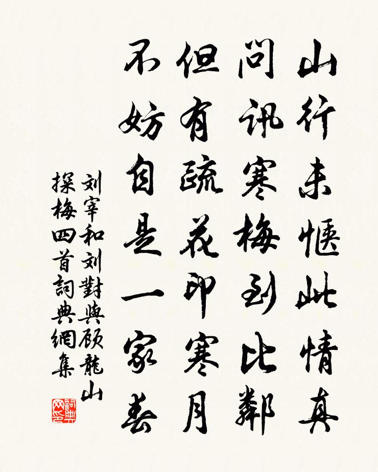 詩詞名句歷史字典書法欣賞書法字典國語詞典說文解字康熙字典古漢語字典標 題 作 者 詩 句 和劉對與顧龍山探梅四首作者:劉宰 朝代:宋代和劉對與顧龍山探梅四首原文山行未愜此情真,問訊寒梅到比鄰。但有疏花印寒月,不妨自是一家春。詩詞問答問:和劉對與顧龍山探梅四首的作者是誰?答:劉宰問:和劉對與顧龍山探梅四首寫於哪個朝代?答:宋代劉宰和劉對與顧龍山探梅四首書法欣賞和劉對與顧龍山探梅四首書法作品詩詞推薦恨妝成元稹〔唐代〕曉日穿隙明,開帷理妝點。傅粉貴重重,施朱憐冉冉。柔鬟背額垂,叢鬢隨釵斂。凝翠暈蛾眉,輕紅拂花臉。滿頭沁園春 送趙彥伯御史張之翰〔元代〕君按西秦,我走東秦,一尊共開。恨匆匆行色,無多款曲,區區別語,未易安排。百二關河,三千道路,前歲如今冷泉堂宋孝宗〔宋代〕山中秀色何佳哉,一峰獨立名飛來。參差翠麓儼如畫,石骨蒼潤神所開。忽開彷像來宮囿,指顧已驚成列岫。規模春晚客懷 其二王冕〔元代〕落落窮途客,年年不在家。寄眠聽夜雨,借景看春華。空著三山帽,難防兩鬢華。清晨覽明鏡,載笑復咨嗟。立春日禊亭偶成張栻〔宋代〕律回歲晚冰霜少,春到人間草木知。便覺眼前生意滿,東風吹水綠差差。送嚴明府入關謁黎京兆皎然〔唐代〕春日異秋風,何為怨別同。潮回芳渚沒,花落晝山空。旅候聞嘶馬,殘陽望斷鴻。應思右內史,相見直城中。次韻曹提管梅洪咨夔〔宋代〕凌寒峭立向庭除,晉宋淵明漢二疏。面冷不堪相嫵媚,心清聊為一軒渠。月來月去香仍在,春少春多意自如。皎潔和花村趙希逢〔宋代〕格是而今老有餘,行行真欠瘦筇扶。不將心絮隨風起,一恁閒花有似無。過許村方回〔宋代〕長安才上堰,風物似微饒。野老能相認,輕船不待招。炊菱開甑熱,秤鯽滿籃跳。偶前樽中物,何為靳一澆。端午三首趙蕃〔宋代〕年年端午風兼雨,似為屈原陳昔冤。我欲於誰論許事,舍南舍北鵓鳩喧。頌石頭和尚草庵歌釋印肅〔宋代〕玉殿瓊樓未為對,引慈眾生增渴愛。放出溈山水牯牛,熒熒露地難遮蓋。夏日山居种放〔宋代〕陰陰林木靜,寂寂無人境。紅綻紫葳香,嵐沈玉膏冷。看雲時獨坐,慎事常中省。何客馭風來,新篁動疏影。壽皇孫趙彥端〔宋代〕前星炳煥領孫星,環拱中天日兩輪。四葉重光同聖世,千秋佳節近生辰。本支秀茂旦復旦,典學熙明新又新。喜入贈不欺信公監總餘杭建接待釋道生〔宋代〕衲僧自有通人愛,笑捏空拳開接待。十字縱橫古路頭,做成不知計潑天大。阿呵呵,也奇怪,是聖是凡俱捉敗。接臨江仙姬翼〔元代〕醞釀長生天上酒,人間此味誰知。玉壺旋貯碧玻璃。時時供小飲,神彩更忘疲。好會襟期方外友,同餐火棗交梨。和宋永兄罷官還家途中見寄四絕黃公度〔宋代〕不比人心驚歲移,且看雁影逐春歸。明朝已辦椒花頌,相對一尊忘是非。游定林寺即荊公讀書處四首楊萬里〔宋代〕蹈月敲門訪病夫,問來還是雪堂蘇。不知把燭高談許,曾舉烏台詩帳無。雜劇·雁門關存孝打虎佚名〔元代〕楔子(殿頭官上,雲)只將忠義報皇朝。要竭身心不憚勞。但得舉賢勤政事,同扶社稷輔神堯。小官乃殿頭官是也憶弟二首曾國藩〔清代〕無端繞室思茫茫,明月當天萬瓦霜。可惜良宵空兀坐,遙憐諸弟在何方。紛紛書帙誰能展,艷艷燈花有底忙?出戶頌古三十一首釋如本〔宋代〕百丈野狐,兩耳卓朔。脫兮不昧,墮兮不落。不昧不落,何是何錯。若於當處不留情,萬里晴空步寥廓。名句推薦城門失火,殃及池魚。司馬光《資治通鑑·梁紀·梁紀十六》 不知何處火,來就客心然。沈佺期《寒食》 強整繡衾,獨掩朱扉,枕簟為誰鋪設。阮逸女《花心動·春詞》 謀先事則昌,事先謀則亡。劉向《說苑·談叢》 樓前柳,憔悴幾秋風。賀鑄《小重山·花院深疑無路通》 人惡人怕天不怕,人善人欺天不欺。佚名《增廣賢文·上集》 驪山四顧,阿房一炬,當時奢侈今何處?張養浩《山坡羊·驪山懷古》 聖人不法古,不脩今。法古則後於時,脩今則塞於勢。商鞅《商君書·開塞》 到家應是,童稚牽衣,笑我華顛。吳激《訴衷情·夜寒茅店不成眠》 萬里無人收白骨,家家城下招魂葬。張籍《征婦怨》