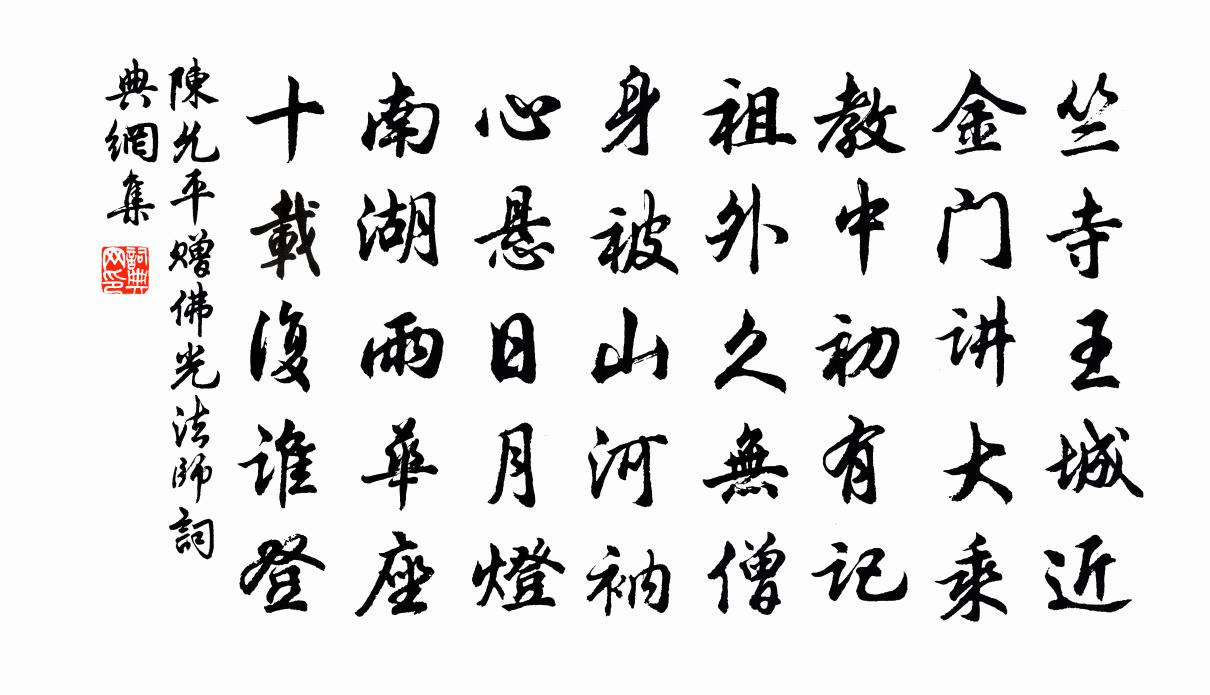 詩詞名句歷史字典書法欣賞書法字典國語詞典說文解字康熙字典古漢語字典標 題 作 者 詩 句 贈佛光法師作者:陳允平 朝代:宋代贈佛光法師原文竺寺王城近,金門講大乘。教中初有記,祖外久無僧。身被山河衲,心懸日月燈。南湖雨華座,十載復誰登。詩詞問答問:贈佛光法師的作者是誰?答:陳允平問:贈佛光法師寫於哪個朝代?答:宋代陳允平贈佛光法師書法欣賞贈佛光法師書法作品詩詞推薦程存虛夢與六人飲酒賦詩餘亦焉而眉長夾鼻下汪炎昶〔宋代〕莫是阿羅漢,前身住化城。夢獨形法相,來未得詩情。矧復論修短,真當外死生。世人寬作計,端欲俟河清。是夕有懷斯遠二首趙蕃〔宋代〕塞郭衣冠匪乏人,步能送我獨情真。幾思覓句相料理,風月溪山不易親。漁歌子 樵夫四首周巽〔元代〕春山漠漠淡煙橫。陰壑丁丁伐木聲。啼鳥靜,落花輕。看棋松下暮雲送陳明府歸衡陽黃滔〔唐代〕雛鶴兼留下,腳踏車出柳煙。三年兩殊考,一日數離筵。久別湖波綠,相思岳月圓。翠蘿曾隱處,定恐卻求仙。雜興張鎡〔宋代〕言貌難取人,宣尼竊丁寧。如何汝南許,輒擅月旦評。觀其察曹瞞,一言盡生平。勿謂鑒裁乏,一門稱弟兄。紹興二十八年祀圜丘學士院〔宋代〕躬展盛人,天步逡巡。樂備禮交,嘉玉既陳。神方安坐,牙祉紛綸。陟降有容,皇心載勤。正月二十日夢在京師張耒〔宋代〕客睡何展轉,青燈暗又明。春雲藏澤國,夜雨嘯山城。許國有寸鐵,耕田無一成。朦朧五更夢,俄頃踏王京。依韻和叔治晚春梅花梅堯臣〔宋代〕楚人住處將為援,越使傳時合有詩。常是獵前混雪色,卻驚春半見瓊姿。笛吹遠曲還多怨,風送清香似可期。我欲送趙正夫使江東孔武仲〔宋代〕酌我酒一樽酒,送酒君千里行酒。青天酒連上黨,秋雁回汾並。戍壘鞠芳草,耕夫歌太平。庶獄須照膽,多士在提游張山人園蘇軾〔宋代〕壁間一軸煙蘿子,盆里千枝錦被堆。慣與先生為酒伴,不嫌刺史亦顏開。纖纖入麥黃花亂,颯颯催詩白雨來。聞道送李堪釋希晝〔宋代〕要地無深托,飄然又出關。秋聲動群木,暮色起千山。岸草隨秋遠,江雲入望間。何宵發孤詠,月冷洞庭間。阮郎歸朱敦儒〔宋代〕柳花陌上拈明璫。嬌紅新樣妝。匆匆曾貯一襟香。月痕金縷涼。分淚扇,掩離觴。春殘人斷腸。錦書難寄雁飛忙。醉蓬萊(送湯)王千秋〔宋代〕正歌塵驚夜,斗乳回甘,暫醒還醉。再煮銀瓶,試長松風味。玉手磨香,鏤金檀舞,在壽星光里。翠袖微揎,冰瓷試筆張耒〔宋代〕學館虀鹽驚歲晚,寒窗書史伴身閒。年來轗軻甘言命,老去追隨厭強顏。海棠花方回〔宋代〕錦城春色萬人迷,飯顆無心著品題。實不如華謾濃艷,秋霜誰覷海棠梨。畫贊劉克莊〔宋代〕雖則丹青妙,其如齒髮衰。遠孫元未識,認作古鐘馗。題余文叔山間四時之樓舒岳祥〔宋代〕輕財好事余文叔,磊落襟期端不俗。外方避地客來多,我亦從君借書屋。屋前曲徑繞淪漪,池上高樓新結束。一條扈從溫泉奉和姚令公喜雪蘇頲〔唐代〕清道豐人望,乘時漢主游。恩暉隨霰下,慶澤與雲浮。泉暖驚銀磧,花寒愛玉樓。鼎臣今有問,河伯且應留。九十用喜雪韻四首吳潛〔宋代〕臘中三白瑞非虛,不慮無冰魯史書。苔長新蔬蒙賜後,根舒宿麥受恩初。憑陵敗絮寒能重,撲蔌斜窗曉漸疎。林杪病起荊江亭即事十首黃庭堅〔宋代〕閉門覓句陳無己,對客揮毫秦少游。正字不知溫飽未,西風吹淚古藤州。名句推薦請君試問東流水,別意與之誰短長。李白《金陵酒肆留別》 山有木兮木有枝,心悅君兮君不知。佚名《越人歌》 鷫鸘換美酒,舞衣罷雕龍。李白《怨歌行》 皮之不存,毛將安傅?左丘明《左傳·僖公·僖公十四年》 夜如何其夜漫漫,鄰雞未鳴寒雁度。劉禹錫《更衣曲》 朱顏那有年年好,逞艷游、贏取如今韓疁《高陽台·除夜》 今日雲景好,水綠秋山明。李白《九日》 智者千慮,必有一失;愚者千慮,必有一得。司馬遷《史記·淮陰侯列傳》 洞庭葉未下,瀟湘秋欲生徐禎卿《在武昌作》 夫為將者,必有腹心、耳目、爪牙。諸葛亮《將苑·卷一·腹心》