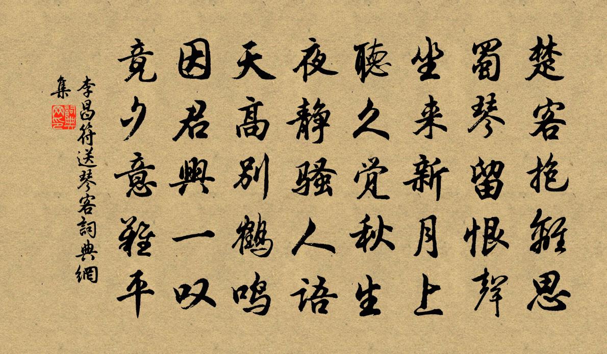 詩詞名句歷史字典書法欣賞書法字典國語詞典說文解字康熙字典古漢語字典標 題 作 者 詩 句 送琴客作者:李昌符 朝代:唐代送琴客原文楚客抱離思,蜀琴留恨聲。坐來新月上,聽久覺秋生。夜靜騷人語,天高別鶴鳴。因君興一嘆,竟夕意難平。詩詞問答問:送琴客的作者是誰?答:李昌符問:送琴客寫於哪個朝代?答:唐代問:送琴客是什麼體裁?答:五律李昌符送琴客書法欣賞送琴客書法作品注釋全唐詩:卷601-15詩詞推薦睡起錢時〔宋代〕雨浥蒲風晚更涼,數花檐卜淨生香。高眠深穩清無夢,盡覺人間白晝長。浣溪沙(清和風)韓淲〔宋代〕買得船兒去下湖。這些天氣近來無。清和風裡綠陰初。酒不為渠閒放蕩,詩應嫌我太粗疏。酒徒詩社復何如。蜀國偶題錢〔唐代〕忽憶明皇西幸時,暗傷潛恨竟誰知。佩蘭應語宮臣道,莫向金盤進荔枝。冬日曉思寄楊二十七鍊師竇群〔唐代〕雨霜地如雪,松桂青參差。鶴警晨光上,步出南軒時。所遇各有適,我懷亦自怡。願言緘素封,昨夜夢瓊枝。次漕庾兩使者絕句韻六首劉克莊〔宋代〕廉使端如秤樣平,行台非以刻為明。未論漢吏搖山力,且聽堯民擊壤聲。即事陶夢桂〔宋代〕桂花香處麝臍破,楓葉丹時錦帳開。天遣年華隨水去,山將野色入簾來。鑷殘白髮愁無跡,割盡黃雲酒有材。不歲和成父過寶應縣韻袁說友〔宋代〕趁得花封八月涼,相家有子綰銅章。習華指日神京路,此地方知寶應祥。醉桃源·柳翁元龍〔宋代〕千絲風雨萬絲晴。年年長短亭。暗黃看到綠成陰。春由他送迎。鶯思重,燕愁輕。如人離別情。繞湖煙冷罩波明。獨游寄衛長林司空曙〔唐代〕草綠春陽動,遲遲澤畔游。戀花同野蝶,愛水劇江鷗。身外唯須醉,人間儘是愁。那知鳴玉者,不羨賣瓜侯。春歸王柏〔宋代〕春來春去果何心,靜坐焚香細細評。太極流行千古事,一元發育四時情。黃堆稼穡誰勳業,綠到桑麻已老成。舒慘戲贈詹安世楊時〔宋代〕彩舟書駐閶門,書初與子相書識。長空書翥秋隼,爽氣橫八極。摛辭鏤圭璋,吐論森劍戟。鄧侯不願仕,志在書竹題友人屋李昌符〔唐代〕松底詩人宅,閒門遠岫孤。數家分小徑,一水截平蕪。竹節偶相對,鳥名多自呼。愛君真靜者,欲去又踟躕。途中雜題六首趙蕃〔宋代〕石有千年蘚,崖懸百尺藤。只疑雲尚合,忽見日初升。送智雄上人李中〔唐代〕忽起遊方念,飄然不可留。未知攜一錫,乘興向何州。古岸春雲散,遙天晚雨收。想應重會面,風月又清秋。晚皈再度西橋四首楊萬里〔宋代〕朝過溪頭聽水鳴,似哀如怨百般聲。皈來依舊鳴未了,知向何人訴不平。宮詞宋白〔宋代〕天子今朝就食遲,延英徵得逸人歸。靈台監里知嘉瑞,隔月先曾奏少微。入峽詩張嵲〔宋代〕微王大峽何崢嶸,疊嶂層巒礙飛鳥。石壁排空何可鑿,拽雲蒸霧無昏曉。凝思天地始胚胎,清川一道何從來。聯峰舟次崇德葉紹翁〔宋代〕倦身只合臥家林,客里消磨感慨心。水國逢春梅未見,山城到午霧猶深。地名不記維舟問,酒味曾諳入巷尋。泛宅送張侍郎歸省林季仲〔宋代〕時時去弄老萊衣,也似何蕃歲一歸。相送江頭無一語,寸心遙與白雲飛。讀白樂天臨水坐詩陳師道〔宋代〕西方社裡收身早,白髮人中得計長。不作北門東掖客,更無閒事可思量。名句推薦有情不管別離久。情在相逢終有。晏幾道《秋蕊香·池苑清陰欲就》 嘆十年心事,休休莫莫。吳潛《滿江紅·豫章滕王閣》 話別情多聲欲戰,玉著痕留紅粉面。顧敻《玉樓春·拂水雙飛來去燕》 治國之道,愛民而已。劉向《說苑·政理》 夏起大土功,命曰絕理。犯禁絕理,天誅必至。佚名《黃帝四經·經法·亡論》 人有所不忍,而後能及其所忍;有所不為,而後可以有為。張廷玉《明史·列傳·卷一百零四》 酷暑天,葵榴發,噴鼻香十里荷花。白樸《得勝樂·夏》 穗帷飄井幹,樽酒若平生。謝朓《同謝諮議詠銅雀台》 贈遠虛盈手,傷離適斷腸。李商隱《十一月中旬至扶風界見梅花》 亂世用能,平則去患。來俊臣《羅織經·控權卷第四》