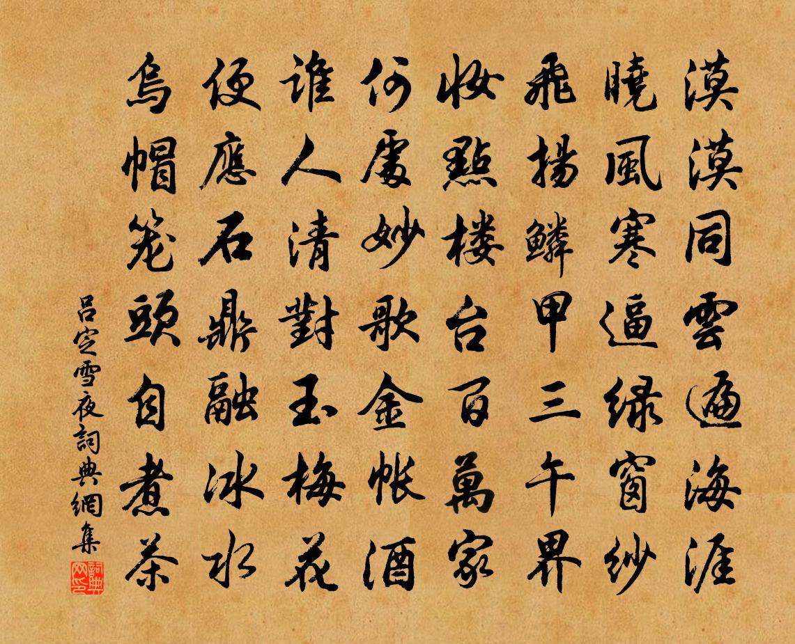 詩詞名句歷史字典書法欣賞書法字典國語詞典說文解字康熙字典古漢語字典標 題 作 者 詩 句 雪夜作者:呂定 朝代:宋代雪夜原文漠漠同雲遍海涯,曉風寒逼綠窗紗。飛揚鱗甲三午界,妝點樓台百萬家。何處妙歌金帳酒,誰人清對玉梅花。便應石鼎融冰水,烏帽籠頭自煮茶。詩詞問答問:雪夜的作者是誰?答:呂定問:雪夜寫於哪個朝代?答:宋代呂定雪夜書法欣賞雪夜書法作品詩詞推薦讀史學白體楊億〔宋代〕易牙昔日曾蒸子,翁叔當年亦殺兒。史筆是非空自許,世情真偽後誰知。上益公十絕為壽玄鶴劉過〔宋代〕緱山橘井與青田,驅策風雲友列仙。名號橫空心萬里,九皋聲動九重天。感懷詩二章奉使中原署館壁韓熙載〔唐代〕仆本江北人,今作江南客。再去江北游,舉目無相識。金風吹我寒,秋月為誰白。不如歸去來,江南有人憶。未到木蘭花慢(為靜春賦)張炎〔宋代〕幽棲身懶動,邃庭悄、日偏長。甚不隱山林,不喧車馬,不斷生香。澄心淡然止水,笑東風、引得落花忙。慵對魚又代孔明哭先主李山甫〔唐代〕鯨鬣翻騰四海波,始將天意用干戈。盡驅神鬼隨鞭策,全罩英雄入網羅。提劍尚殘吳郡國,垂衣猶欠魏山河。鼎湖閒居即事朱慶餘〔唐代〕深嶂多幽景,閒居野興清。滿庭秋雨過,連夜綠苔生。石面橫琴坐,松陰採藥行。超然塵事外,不似絆浮名。和段學士南亭春日對雨喻鳧〔唐代〕晨飛晚未休,蘭閣客吟愁。蕭颯柳邊掛,縈紆花底流。聲繁乍離籟,灑急不成漚。經夕江湖思,煙波一釣舟。臨江仙(茂叔兄生日)魏了翁〔宋代〕占斷人間閒富貴,長秋應是長春。前山推月上簾旌。緩觴燖舊友,勾拍按新聲。時倚晴空看過雁,幾州明月關情。久為塵事關懷因成一絕陳藻〔宋代〕讀書得趣是神仙,未若神仙斷火煙。解把老夫埋俗窟,多時不放上青天。雨後陸游〔宋代〕一夜茅檐雨,晨興乃爾涼。禽魚皆遂性,草木自吹香。微潤生琴藨,纖塵避筆床。悠然北窗興,真欲傲羲皇。和鮮于子駿益昌官舍八詠其一桐軒蘇轍〔宋代〕桐身青琅玕,桐葉蒲葵扇。落落出軒墀,亭亭奉閒燕。夜聲疏雨滴,午影微風轉。秋飆一凌亂,淅瀝驚蔥蒨。朝日八月十五日象自江東止田園移莊…詩三首(俱見王維集)盧象〔唐代〕謝病始告歸,依然入桑梓。家人皆佇立,相候衡門裡。疇類皆長年,成人舊童子。上堂家慶畢,願與親姻邇。論舊晚泊揚州楊萬里〔宋代〕揚子橋西轉彩航,粉城如練是維楊。百年舊觀兵戈後,近歲新開草木荒。傑閣高台雲上出,野梅官柳雪中香。史君將歸塗口,宿鬱林寺道玄上人院二首許渾〔唐代〕西岩一磬長,僧起樹蒼蒼。開殿灑寒水,誦經焚晚香。竹風雲漸散,杉露月猶光。無復重來此,歸舟凌夕陽。春尋處士妻十首劉克莊〔宋代〕王遣金駟聘,先生已許王。從家變名姓,非獨接輿狂。偈傾一百三十三首釋法薰〔宋代〕兩日晴,三日雨。衲僧皮草,無{左日右煞}{左日右良}處。雨陸游〔宋代〕家近蓬萊白玉京,草堂登望不勝清。初驚野色昏昏至,已見波紋細細生。殘醉頓消迎亂點,微吟漸苦入寒聲。只愁浣溪沙(八之三)鄧肅〔宋代〕宿雨潛回海宇春。曉風徐散日邊雲。熙熙人意一番新。破睡海棠能媚客,舞風垂柳似招人。春衫歸去馬蹄輕。醉眠夜聞霜風甚緊,起坐達旦二首楊萬里〔宋代〕玉酒醺人底昜醒,月底梅影恰三更。只嫌老眼清無睡,不道松聲聽到明。年老逢春十三首邵雍〔宋代〕年老逢春莫惜狂,惜狂無那興難當。園林恰到惡明媚,風雨便多閒中傷。花等半開宜速賞,酒聞才熟便先嘗。大都名句推薦織女牽牛送夕陽,臨看不覺鵲橋長。德容《七夕二首·其二》 草樹知春不久歸,百般紅紫斗芳菲。韓愈《晚春》 有三秋桂子,十里荷花。柳永《望海潮·東南形勝》 千點寒梅曉角中,一番春信畫樓東。楊慎《鷓鴣天·元宵後獨酌》 大漠西風急,黃榆涼葉飛。田錫《塞上曲》 愁無限,消瘦盡,有誰知?閒教玉籠鸚鵡念郎詩。納蘭性德《相見歡·落花如夢淒迷》 賞罰如加於身,賦斂如取己物。此愛民之道也。姜子牙《六韜·文韜·國務》 綠竹入幽徑,青蘿拂行衣。李白《下終南山過斛斯山人宿置酒》 軍合力不齊,躊躇而雁行。曹操《蒿里行》 夫孝者,善繼人之志,善述人之事者也。子思《中庸·第十九章》