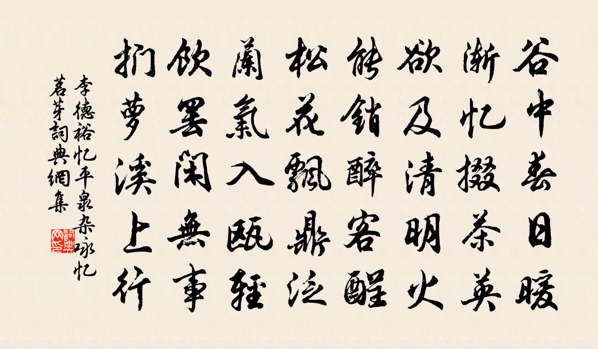 詩詞名句歷史字典書法欣賞書法字典國語詞典說文解字康熙字典古漢語字典標 題 作 者 詩 句 憶平泉雜詠憶茗芽作者:李德裕 朝代:唐代憶平泉雜詠憶茗芽原文谷中春日暖,漸憶掇茶英。欲及清明火,能銷醉客酲。松花飄鼎泛,蘭氣入甌輕。飲罷閒無事,捫蘿溪上行。詩詞問答問:憶平泉雜詠憶茗芽的作者是誰?答:李德裕問:憶平泉雜詠憶茗芽寫於哪個朝代?答:唐代李德裕憶平泉雜詠憶茗芽書法欣賞憶平泉雜詠憶茗芽書法作品注釋全唐詩:卷475-120詩詞推薦元符親郊五首仁宗〔宋代〕陟彼郊丘,大祀是承。其豆孔庶,其香始升。上帝時歆,以我齊明。卒事而入,福祿來鹹。江城子·乙卯正月二十日夜記夢蘇軾〔宋代〕十年生死兩茫茫,不思量,自難忘。千里孤墳,無處話淒涼。縱使相逢應不識,塵滿面,鬢如霜。夜來幽夢忽還鄉題趙大年小影趙孟堅〔宋代〕一行白鷺過前山,飛去沙鷗半復還。更有精能君見否,黃鸝兩兩綠楊間。偈頌三十首釋印肅〔宋代〕化藏經語,結般若因,度有緣眾。一卷一千,共亦不共,才出頭來,便得受用。此經無價,擬議不中。除非自肯,宿畢侍御宅錢起〔唐代〕交情頻更好,子有古人風。晤語清霜里,平生苦節同。心惟二仲合,室乃一瓢空。落葉寄秋菊,愁雲低夜鴻。薄寒海棠戴復古〔宋代〕十月園林不雨霜,朝曦赫赫似秋陽。夜來聽得遊人語,不見梅花見海棠。同李員外賀哥舒大夫破九曲之作高適〔唐代〕遙傳副丞相,昨日破西蕃。作氣群山動,揚軍大旆翻。奇兵邀轉戰,連孥絕歸奔。泉噴諸戎血,風驅死虜魂。頭飛約友秋賞衛宗武〔宋代〕秋霖盪殘暑,林飈鳴策策。乾坤灝氣浮,萬象互清發。望舒散天葩,拂拂余芬落。霽景行澄鮮,三五圓素魄。有園七日夜女歌·其一佚名〔〕三春怨離泣,九秋欣期歌。駕鸞行日時,月明濟長河。次韻唐致遠雨後喜涼范成大〔宋代〕老陽作氣再三衰,鼓竭之餘不支雨。搴旗拔幟掃跡空,一點新涼破殘暑。飛蚊薨薨已無奇,蜻蜓翅淨摩天嬉。竹窗點絳唇曹組〔宋代〕沈醉歸來,洞房燈火閒相照。夜寒猶峭。信意和衣倒。春夢雖多,好夢長長少。紗窗曉。鳳幃人悄。花外空啼鳥。二色芙蓉花顧逢〔宋代〕拒霜一樹碧叢叢,兩色花開迥不同。疑是酒邊西子在,半醒半醉立西風。亦好園四詠釣磯喻良能〔宋代〕只為貪赬鯉,還應愛碧流。風來花落餌,雲破月沈鉤。寄懷子進昆仲三首趙蕃〔宋代〕晚雨催寒著破裘,官梅應是動揚州。相思不見蘇門隱,好在當年玉局游。擬向會稽探禹穴,卻從吳會下扁舟。不須三山杜門作歌陸游〔宋代〕中歲遠遊踰劍閣,青衫誤入征西幙。南沮水邊秋射虎,大散關頭夜聞角。畫策雖工不見用,悲吒那復從軍樂。鳴呼失調名佚名〔宋代〕離情愁思,盡分付、眉頭眼底。知府司封見和喜雨詩次韻陳謝朱長文〔唐代〕天意分明應魯雩,高壇晨拜紫袍濡。禽窺舊井寒泉長,魚泳新荷涸轍蘇。敏政有餘閒利刃,清詩無纇擲靈珠。夏畦和淮上遇便風蘇舜欽〔宋代〕浩蕩清淮天共流,長風萬里送歸舟。應愁晚泊喧卑地,吹入滄溟始自由。句曾致堯〔宋代〕雲昏迷候館,樹缺辨江湖。寄彥博二首李流謙〔宋代〕聞道陳夫子,年來學更工。幾人曾著眼,聖處已收功。老驥思長路,潛鯤待疾風。何當問奇字,載酒過揚雄。名句推薦畢竟年年用著來,何似休歸去。如晦《楚天遙過清江引·有意送春歸》 驚鳥去無際,寒蛩鳴我傍。馬戴《楚江懷古三首》 重九開秋節,得一動宸儀。韋安石《奉和九日幸臨渭亭登高應制得枝字》 有情風、萬里卷潮來,無情送潮歸。蘇軾《八聲甘州·寄參寥子》 桃李不言,下自成蹊;道旁苦李,為人所棄。程登吉《幼學瓊林·卷四·花木》 綠葉兮素華,芳菲菲兮襲予;屈原《九歌》 黃河遠上白雲間,一片孤城萬仞山。王之渙《涼州詞二首·其一》 堪怨王孫,不記歸期早。梅堯臣《蘇幕遮·草》 身似浮雲,心如飛絮,氣若遊絲。徐再思《折桂令·春情》 故勢不便,非所以逞能也。韓非及後人《韓非子·說林下》