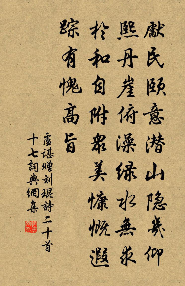 詩詞名句歷史字典書法欣賞書法字典國語詞典說文解字康熙字典古漢語字典標 題 作 者 詩 句 贈劉琨詩二十首 十七作者:盧諶 朝代:魏晉贈劉琨詩二十首 十七原文先民頤意。潛山隱几。仰熙丹崖。俯澡綠水。無求於和。自附眾美。慷慨遐蹤。有愧高旨。詩詞問答問:贈劉琨詩二十首 十七的作者是誰?答:盧諶問:贈劉琨詩二十首 十七寫於哪個朝代?答:魏晉盧諶贈劉琨詩二十首 十七書法欣賞贈劉琨詩二十首 十七書法作品詩詞推薦江上晚眺書所見李流謙〔宋代〕雲鎔金錯落,月掛玉盤盂。水退岸全缺,煙陳山欲無。沙晴鷗並集,林暝鳥爭呼。不必求摩詰,分明是畫圖。入邑問炊中雲招王希聖起龍三首許月卿〔宋代〕簡瓢不改乃真豪,之子胸中志自高。本自無官彭澤柳,不知何世武陵桃。窗前草色勤鑽仰,堂上萱叢敬抑搔。好向寄陝府鄧給事孟郊〔唐代〕陝城臨大道,館宇屹幾鮮。候謁隨芳語,鏗詞芬蜀箋。從來鏡目下,見盡道心前。自謂古詩量,異將新學偏。戇人酬郭先輩徐鉉〔唐代〕太原郭夫子,行高文炳蔚。弱齡負世譽,一舉游月窟。仙籍第三人,時人故稱屈。昔余吏西省,傾蓋名籍籍。及我望夫石孟郊〔唐代〕望夫石,夫不來兮江水碧。行人悠悠朝與暮,千年萬年色如故。東湖尼妙雲〔宋代〕山環湖水水環山,短艇白鷗窗幾間。野外更將供給到,飽參著得十僧閒。高齋晚步錢時〔宋代〕上有鷹鸇下網羅,千重雲水萬重波。安之若命心無慊,知者其天爾奈何。面面好山清淨供,聲聲幽鳥太平歌。憑誰宮詞宋白〔宋代〕蟲響金階搗練天,玉狻呀口噴香菸。來宵待賞中秋月,剩取珊瑚釘御筵。頌古四首釋祖欽〔宋代〕根尋到底得星兒,冷焰騰輝是此時。拈一莖茅輕點著,不知燒殺五須彌。人日登高喬侃〔唐代〕仆本多悲者,年來不悟春。登高一游目,始覺柳條新。杜陵猶識漢,桃源不辨秦。暫若升雲霧,還似出囂塵。賴得白馬寺詩李廌〔宋代〕湠漫漢江皋,迤邐楚山岫。衡門掩半麓,飛甍聳層構。高林敞華榱,雙泉逼瑤甃。龜魚水中坻,牛馬飲殘溜。我卜又次王恭叔韻樓鑰〔宋代〕仲冬方寒荔挺出,仲夏方炎靡草死。若將朝菌比大椿,相去何啻千萬里。金芝仙草不可見,長生之草畧相似。少時定風波(魯卿見和,復答之)葉夢得〔宋代〕斜漢初看素月流。坐驚金餅出雲頭。華發蕭然吹素領。光景。何妨分付屬滄洲。莫待霜花飄爛漫。苹岸。更憑佳句辛酉大雪戲成二詩以千山鳥飛絕萬逕人蹤滅為周麟之〔宋代〕北風夜捲地,凍雲曉黏天。黃竹歌未終,飛霰集我前。森羅崑山璧,零亂淮夷蠙。縛賊懸瓠城,安得兵三千。平郴蠻楊冠卿〔宋代〕孽狐鬼嘯篁竹,紅綃帕首郴江曲。萬牛臠炙瓮行酒,黨伍穰穰萃林藪。牙璋夜半起兵符,雲旗驛騎爭馳驅。搜原剔生查子·落梅庭榭香晏幾道〔宋代〕落梅庭榭香,芳草池塘綠。春恨最關情,日過闌乾曲。幾時花里閒,看得花枝足。醉後莫思家,借取師師宿。憶君王/憶王孫謝克家〔宋代〕依依宮柳拂宮牆。樓殿無人春晝長。燕子歸來依舊忙。憶君王。月破黃昏人斷腸。夜行船 聞賣杏花史達祖〔宋代〕不剪春衫愁意態。過收燈、有些寒在。小雨空簾,無人深巷,已早杏花先賣。白髮潘郎寬沈帶。怕看山、憶它眉黛閟宮佚名〔先秦〕閟宮有侐,實實枚枚。赫赫姜嫄,其德不回。上帝是依,無災無害。彌月不遲,是生后稷。降之百福。黍稷重穋,清平樂徐照〔宋代〕綠圍紅繞。一枕屏山曉。怪得今朝偏起早。笑道牡丹開了。迎人卷上珠簾,小螺未拂眉尖。貪教玉籠鸚鵡,楊花飛名句推薦行出於己,名生於人。佚名《逸周書·卷六·諡法解》 獨上小摟春欲暮,愁望玉關芳草路。韋莊《木蘭花·獨上小樓春欲暮》 察見淵魚者不詳,智料隱匿者有殃。列子及其弟子《列子·說符》 啜苦咽甘,茶也。陸羽《茶經·五之煮》 還始覺、留情緣眼,寬頻因春。吳文英《渡江雲三犯·西湖清明》 千里鶯啼綠映紅,水村山郭酒旗風。杜牧《江南春》 楓樹夜猿愁自斷,女蘿山鬼語相邀李商隱《楚宮》 出於其類,拔乎其萃。孟子《孟子·公孫丑章句上·第二節》 利天下者,天下啟之;害天下者,天下閉之。姜子牙《六韜·武韜·發啟》 太平之世多長壽人。王充《論衡·卷一·氣壽篇》