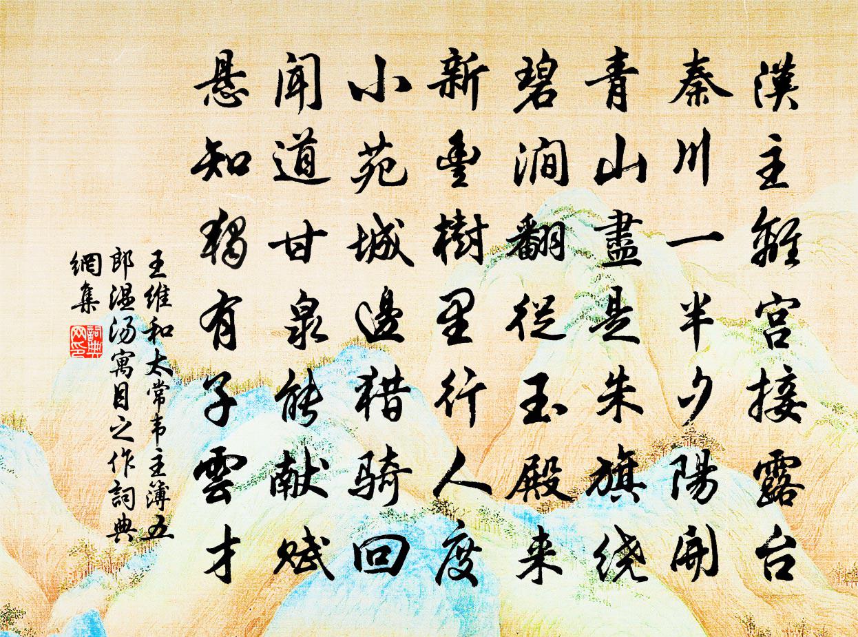 漢主離宮接露台,秦川一半夕陽開。青山儘是朱旗繞,碧澗翻從玉殿來。
