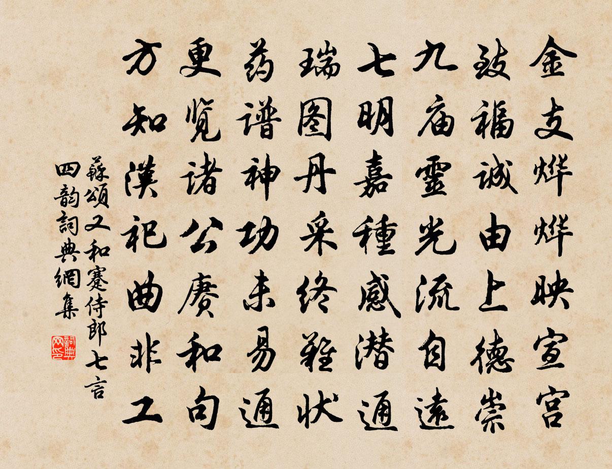 詩詞名句歷史字典書法欣賞書法字典國語詞典說文解字康熙字典古漢語字典標 題 作 者 詩 句 又和蹇侍郎七言四韻作者:蘇頌 朝代:宋代又和蹇侍郎七言四韻原文金支燁燁映宣宮,致福誠由上德崇。九廟靈光流自遠,七明嘉種感潛通。瑞圖丹采終難狀,藥譜神功未易通。更覽諸公賡和句,方知漢祀曲非工。詩詞問答問:又和蹇侍郎七言四韻的作者是誰?答:蘇頌問:又和蹇侍郎七言四韻寫於哪個朝代?答:宋代蘇頌又和蹇侍郎七言四韻書法欣賞又和蹇侍郎七言四韻書法作品詩詞推薦題張野人園廬孟浩然〔唐代〕與君園廬並,微尚頗亦同。耕釣方自逸,壺觴趣不空。門無俗士駕,人有上皇風。何必先賢傳,惟稱龐德公。過新灘百里小駐峽州城袁說友〔宋代〕明朝上巴江,日日峽中行。天險三峽路,峽險灘頭程。就中十二灘,新灘尤右驚。父老記往時,此地江流平。一朝奉和仲通秋宴韓維〔宋代〕參差天仗拂雲台,雉尾分行劍佩來。萬壽稱觴臣節罄,九韶張樂帝顏開。班趨玉佩花相鬥,舞入文茵雪屢回。疏賤餞唐州高使君張說〔唐代〕常時好閒獨,朋舊少相過。及爾宣風去,方嗟別日多。淮流春晼晚,江海路蹉跎。百歲屢分散,歡言復幾何。壺中天/念奴嬌錦溪〔宋代〕騎鯨直上,問妲娥何日,天生英傑。笑下瓊樓,還報導,甫近迎長佳節。萬里無雲,一天如水,擁出新團月。正當四事林之奇〔宋代〕會有四不赴,時有四不出。無貴亦無賤,無固亦無必。里閈閒過從,身安心自逸。如此三十年,幸逢太平日。送文暢師北游韓愈〔唐代〕昔在四門館,晨有僧來謁。自言本吳人,少國小城闕。已窮佛根源,粗識事輗軏。攣拘屈吾真,戒轄思遠發。薦紳洛中監察病假滿送韋楚老拾遺歸朝杜牧〔唐代〕洛橋風暖細翻衣,春引仙官去玉墀。獨鶴初沖太虛日,九牛新落一毛時。行開教化期君是,臥病神祇禱我知。十載水龍吟 己丑中秋用韻許有壬〔元代〕可翁點檢形骸,關心六事今猶可。摩挲老眼,殘編細讀,小窗危坐。信手揮毫,雲煙撩亂,波濤掀簸。笑蹣跚病足送麻居士釋重顯〔宋代〕紗帽山儀白榮袍,遠披孤頂近吾曹。攜來七尺霜前竹,劃斷天雲不放高。泊上虞縣陸游〔宋代〕鄞江久不到,乘興偶東遊。漲水崩沙岸,歸雲抱縣樓。吟餘聲混混,梳罷發颼颼。喜見時平象,新絲入市稠。舟行劉應時〔宋代〕小艇出前浦,槐陰覆小橋。雲垂疑有雨,水穩不通潮。山色綠自足,汀花細可描。枕收篷底臥,欸乃認歸樵。七夕白居易〔唐代〕煙霄微月澹長空,銀漢秋期萬古同。幾許歡情與離恨,年年並在此宵中。秋晴見天際飛鴻有感陸游〔宋代〕新晴天宇色正青,群鴻高騫在冥冥。兒童相呼共仰視,我亦扶杖來中庭。豐年到處稻粱滿,胡不暫下棲沙汀?應須次汪制議梅岩韻楊公遠〔宋代〕梅倚幽岩頂,花開碧蘚枝。了無脂粉態,惟有雪霜姿。一點香清過,千年樹倔奇。和羹風味在,那許浪題詩。藏春塢詩獻刁十四丈學士王安石〔宋代〕蒜山東渡得林丘,邂逅籃輿亦少留。今日更知萊氏隱,暮年長憶武陵游。欲營垣屋隨穿斸,尚嘆塵沙隔獻酬。遙約和楊畋孤琴詠范仲淹〔宋代〕愛此千年器,如見古人面。欲彈換朱絲,明月當秋漢。我願宮商弦,相應聲無間。自然召南風,莫起孤琴嘆。南歌子(三之二)秦觀〔宋代〕愁鬢香雲墜,嬌眸水玉裁。月屏風幌為誰開。天外不知音耗、百般猜。玉露沾庭砌,金風動琯灰。相看有似夢初回心遠軒王冕〔元代〕淵明賦歸去,寓意在田園。結廬雜人境,喜無車馬喧。秋風菊采采,春風柳娟娟。人跡日已疏,世事日已遷。高臥題關雲長廟胡寅〔宋代〕西方有幻師,以利行幻術。利他乃甘言,自利則其實。曾微證形象,雇喜論恍惚。可憐億兆人,明智百無一。泯然名句推薦戍鼓斷人行,邊秋一雁聲。杜甫《月夜憶舍弟》 兵出無名,事故不成班固《漢書·紀·高帝紀上》 故鄉歸去千里,佳處輒遲留。蘇軾《水調歌頭·安石在東海》 有客躊躇,古庭空自吊孤影。史達祖《齊天樂·中秋宿真定驛》 而天下皆曰其力也,必不能曰我見命焉。墨子《墨子·36章 非命(中)》 憶共人人睡魂蝶亂,夢鸞孤。趙長卿《更漏子·燭消紅》 獨有宦遊人,偏驚物候新。杜審言《和晉陵陸丞早春遊望》 積善之家必有餘慶,積不善之家必有餘殃。佚名《易傳·文言傳·坤文言》 驛寄梅花,魚傳尺素。秦觀《踏莎行·郴州旅舍》 籬落疏疏一徑深,樹頭花落未成陰。楊萬里《宿新市徐公店》