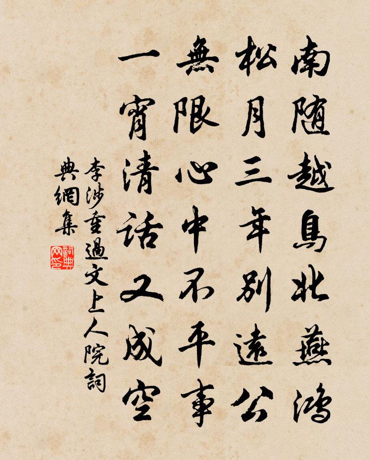 詩詞名句歷史字典書法欣賞書法字典國語詞典說文解字康熙字典古漢語字典標 題 作 者 詩 句 重過文上人院作者:李涉 朝代:唐代重過文上人院原文南隨越鳥北燕鴻,松月三年別遠公。無限心中不平事,一宵清話又成空。詩詞問答問:重過文上人院的作者是誰?答:李涉問:重過文上人院寫於哪個朝代?答:唐代問:重過文上人院是什麼體裁?答:七絕李涉重過文上人院書法欣賞重過文上人院書法作品注釋全唐詩:卷477-23詩詞推薦送進士高樞拱辰石介〔宋代〕韓門有李漢,柳氏得晦之。其道卒無患,二子為藩離。吾才誠駑弱,十年空孜孜。韓閫與柳閾,豈敢輒潛窺。二氏同溧陽宰送孫秀才孟郊〔唐代〕廢瑟難為弦,南風難為歌。幽幽拙疾中,忽忽浮夢多。清韻始嘯侶,雅言相與和。訟閒每往招,祖送奈若何。牽苦寓興七首魏野〔宋代〕天地勞覆載,日月勞往還。此尚不能息,何況在其間。鳥獸飲食外,悠悠無食慳。如何人異此,晝夜機相關。顧我賀幸普濟寺應制廣宣〔唐代〕南方寶界幾由旬,八部同瞻一佛身。寺壓山河天宇靜,樓懸日月鏡光新。重城柳暗東風曙,復道花明上苑春。向晚袁參政輓詩魏了翁〔宋代〕生世恨不蚤,庚申始識公。象衣垂綷{左糹右蔡},長佩奏璁瓏。幸甚蠅依驥,居然燕背鴻。靈輀送無路,淚灑霅挽陶縣令叔元陳杰〔宋代〕千載同歸兩陶令,故園相望一青山。怪來強健休官早,贏得艱虞閱世閒。差樂輸君已天上,不堪愧我尚人間。斯文白石岩下逕行田詩謝靈運〔南北朝〕小邑居易貧。災年民無生。知淺懼不周。愛深憂在情。舊業橫海外。蕪穢積頹齡。饑饉不可久。甘心務經營。千頃題縣南莊壁晁說之〔宋代〕城下之師莫問天,只將性命托忠賢。效官三黜未為恨,閉戶七奔方可憐。虎變不宜懷猶豫,龍韜豈憚費迍邅。前村采芹亭方蒙仲〔宋代〕人道西南三數峰,雖雲峭拔欠雍容。嗟哉偃孌要何用,卻學為蛇羞作龍。赴江陵途中寄贈王二十補闕李十一拾遺…員外翰林三學士韓愈〔唐代〕孤臣昔放逐,血泣追愆尤。汗漫不省識,恍如乘桴浮。或自疑上疏,上疏豈其由。是年京師旱,田畝少所收。上憐午坐陸游〔宋代〕茶杯凝細孔,香岫起微雲。樹影窗間見,禽聲屋角聞。流年易拋擲,舊學失鋤耘。師友今零落,何人為運斤?金山驛李石〔宋代〕晚泊金山驛,風生玉宇秋。荒苔蝕佳句,喬木惜名流。鼠穴飛泉入,蛛絲積雨收。何須嘆人物,華屋與山丘。草三段二首賈似道〔宋代〕麻頭青項白毛丁,金翅縐縐肉帶青。腿腳班黃牙似炭,當場健戰眾皆驚。贈戴彥衡吳可〔宋代〕病來謾喜折釵股,老去尚懷雙脊龍。他日扁舟會乘興,摩挲圭璧小從容。葵花二首劉克莊〔宋代〕下了江南奏凱回,曹公鞅鞅未忘懷。爭知野老門庭冷,旌節無心忽自來。偈頌一百二十三首釋祖欽〔宋代〕市行高下不須疑,問著平人自得知。紅豆啄殘鸚鵡粒,碧梧棲老鳳凰枝。聞雁寄歐陽夷陵梅堯臣〔宋代〕閒坐獨無寐,雁來更未闌。聲長河漢迥,影落戶庭寒。荊楚橘包熟,瀟湘楓葉丹。南飛過三峽,試問故人看。臨江仙曹組〔宋代〕青瑣窗深 * 暖,燈前共倒金尊。數枝梅浸玉壺春。雪明渾似曉,香重欲成雲。戶外馬嘶催客起,席間歡意留人。贈南回了豐上人三首張嵲〔宋代〕遍參初自浙江回,梵剎金鋪始奐開。袖手卻來岩下住,蕭然一逕長莓苔。園中陸游〔宋代〕稚竹侵檐綠,新桐覆井涼。閒身少羈束,隨處得徜徉。山鵲惺惚語,藤花掩冉香。吾詩有餘思,小復立西廂。名句推薦且樂生前一杯酒,何須身後千載名?李白《行路難三首》 大雪壓青松,青松挺且直。陳毅《青松》 出耒在明晨,山寒易霜霰。王守仁《謫居糧絕請學於農將田南山詠言寄懷》 西園何限相思樹,辛苦梅花候海棠。元好問《鷓鴣天·候館燈昏雨送涼》 四月清和雨乍晴,南山當戶轉分明。司馬光《客中初夏》 埋骨何須桑梓地,人生無處不青山。 * 《七絕·改西鄉隆盛詩贈父親》 江亭暇日堪高會,醉諷離騷不解愁邊貢《午日觀競渡》 春已歸來,看美人頭上,裊裊春幡。辛棄疾《漢宮春·立春日》 引之于山,獸不能走吹之於水,魚不能游牛殳《琵琶行》 都道無人愁似我,今夜雪,有梅花,似我愁。蔣捷《梅花引·荊溪阻雪》