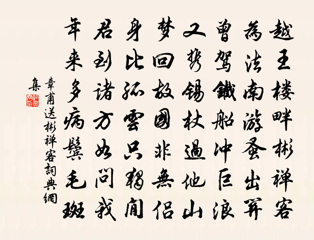 詩詞名句歷史字典書法欣賞書法字典國語詞典說文解字康熙字典古漢語字典標 題 作 者 詩 句 送彬禪客作者:章甫 朝代:宋代送彬禪客原文越王樓畔彬禪客,為法南遊蚤出關。曾駕鐵船沖巨浪,又攜錫杖過他山。夢回故國非無侶,身比孤雲只獨閒。君到諸方如問我,年來多病鬢毛斑。詩詞問答問:送彬禪客的作者是誰?答:章甫問:送彬禪客寫於哪個朝代?答:宋代章甫送彬禪客書法欣賞送彬禪客書法作品詩詞推薦遍地花(孫守席上詠牡丹)毛滂〔宋代〕白玉闌邊自凝佇。滿枝頭、彩雲雕霧。甚芳菲、繡得成團,砌合出、韶華好處。暖風前、一笑盈盈,吐檀心、向誰車駕西遊因而有作溫庭筠〔唐代〕宣曲長楊瑞氣凝,上林狐兔待秋鷹。誰將詞賦陪雕輦,寂寞相如臥茂林。河梁別馬戴〔唐代〕河梁送別者,行哭半非親。此路足征客,胡天多 * 。金罍照離思,寶瑟凝殘春。早晚期相見,垂楊凋復新。辛卯除夜戴表元〔宋代〕臘月今年只今夕,春風明日是明年。狂歌把酒屠蘇地,醉眼看梅霧淞天。碧玉千壺喧坐次,紅牙六博斗飛錢。頭顧贈朱師裕方回〔宋代〕相府違離二十年,弁兮突見外孫賢。故因高韻如袁粲,豈但雄文似史遷。兵甲喧豗征馬地,音書斷阻去鴻天。因君悼竹趙蕃〔宋代〕此君如高人,風節常凌厲。雖經隆冬中,正色不少替。春今盡正月,萌櫱且次第。天公出奇手,白晝變昏翳。初飛中秋風雨艾可叔〔宋代〕一年佳節又虛逢,惱殺江湖白髮翁。滴夢欲殘蕉葉雨,吹愁不斷蓼花風。陰晴明晦天無準,離合悲歡態不同。聊買醴泉辭楊維楨〔元代〕醴泉兮無源,靈芝兮無根。如何求俊兮,而欲求乎人門。句汪崇亮〔宋代〕夢回酒醒不知處,月靜人稀方憶君。送僧清演歸山李洞〔唐代〕毛褐斜肩背負經,曉思吟入竇山青。峰前野水橫官道,踏著秋天三四星。秋色橫空元好問〔金代〕松液香凝。澹幽姿一洗,若下宜城。甘腴小苦中山賦,千古齒頰春生。燈花喜,缸面清。愛竹港、冰泉落枕聲。恰趙湖州東園雜詠和人韻雋游陳文蔚〔宋代〕亭據高峰上上頭,登臨人世一漚浮。囂塵到此都遺盡,直欲乘風跨鶴游。春色滿皇州張嗣初〔宋代〕何處年華好,皇州淑氣勻。韶陽潛應律,草木暗迎春。柳變金堤畔,蘭抽曲水濱。輕黃垂輦道,微綠映天津。麗景南軒曾極〔宋代〕劍磨驢膊倦征途,三歲南軒客寓居。建業水甘供日飲,波間亦有武昌魚。對酒姜特立〔宋代〕老態日日增,歡意時時改。唯有對壺觴,依然此心在。依韻和君實端明洛濱獨步邵雍〔宋代〕風背河聲近亦微,斜陽淡泊隔雲依。一雙白鷺來煙外,將下沙頭又卻飛。寓浯江識老魏秀才丘葵〔宋代〕月澹蓬門掩候蟲,窮通何必問天工。茶烹粟麵粉紛紛白。燈吐花心灼灼紅。屢改新吟添硯水,密翻舊稿護窗風。相山居獨酌黃庶〔宋代〕山寒未放春訊息,獨把單醪慰寂寥。書對聖賢為客主,竹兼風雨似鹹詔。醉鄉城郭燈前到,愁賊戈予盞底銷。野菜緣識宋太宗〔宋代〕道經念誦信無為,清靜玄言好自持。苦行精修心不倦,嚥津往往過齋時。漁家傲歐陽修〔宋代〕十二月嚴凝天地閉。莫嫌台榭無花卉。惟有酒能欺雪意。增豪氣。直教耳熱笙歌沸。隴上雕鞍惟數騎。獵圍半合新名句推薦燕燕輕盈,鶯鶯嬌軟,分明又向華胥見。姜夔《踏莎行·自沔東來丁未元日至金陵江上感夢而作》 幸回郎意且斯須,一年中別今始初。王建《七夕曲》 春蠶到死絲方盡,蠟炬成灰淚始乾。李商隱《無題·相見時難別亦難》 遠村秋色如畫,紅樹間疏黃。晏殊《訴衷情·芙蓉金菊斗馨香》 碧雲無渡碧天沉,是湖心,是儂心。張惠言《江城子·填張春溪西湖竹枝詞》 敵未滅,何以家為?脫脫《宋史·列傳·卷一百二十四》 勿貪意外之財,勿飲過量之酒。朱柏廬《朱子家訓·全文》 心事孤山春夢在,到思量、猶斷詩魂吳文英《極相思·題陳藏一水月梅扇》 何期小會幽歡,變作離情別緒。柳永《晝夜樂·洞房記得初相遇》 一物不成,兩物見在。施耐庵《水滸傳·第十二回二》