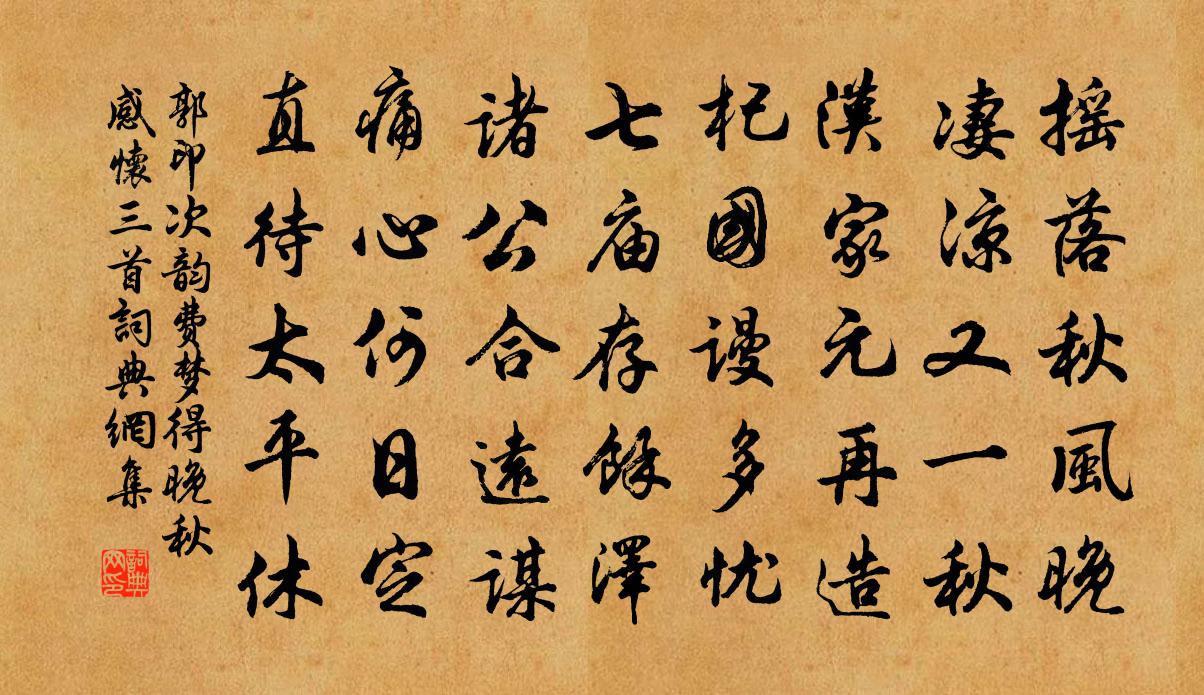 詩詞名句歷史字典書法欣賞書法字典國語詞典說文解字康熙字典古漢語字典標 題 作 者 詩 句 次韻費夢得晚秋感懷三首作者:郭印 朝代:宋代次韻費夢得晚秋感懷三首原文搖落秋風晚,淒涼又一秋。漢家元再造,杞國謾多憂。七廟存餘澤,諸公合遠謀。痛心何日定,直待太平休。詩詞問答問:次韻費夢得晚秋感懷三首的作者是誰?答:郭印問:次韻費夢得晚秋感懷三首寫於哪個朝代?答:宋代郭印次韻費夢得晚秋感懷三首書法欣賞次韻費夢得晚秋感懷三首書法作品詩詞推薦韋員外家花樹歌岑參〔唐代〕今年花似去年好,去年人到今年老。始知人老不如花,可惜落花君莫掃。君家兄弟不可當,列卿御史尚書郎。朝回河間府居庸疊翠〔元代〕斷崖萬仞如削鐵,鳥飛不度苔石裂。嵯岈枯木無碧柯,六月太陰飄急雪。寒沙茫茫出關道,駱駝夜吼黃雲老。征鴻逍遙詠宋太宗〔宋代〕天界殊勝理,凡愚不易知。曩因誰可究,淺近故懷疑。的實歸真性,區邪入正持。樂耶親大道,報就自然之。省夏書事寇準〔宋代〕窗戶經初雨,風清野景饒。閒庭猶戲蝶,高樹已鳴蜩。世態貧中覺,鄉思醉里銷。縱吟還獨步,時復過溪橋。夾道岡梅堯臣〔宋代〕舟脫鵝{外疒內貴}淺,兵牽鴈腳齊。兼沙水黃濁,穿壠岸高低。瘦土黃姜石,枯株長樹雞。薄言歸向晚,路入赤題資州東岩鄭鋼〔宋代〕逕轉得幽谷,雲岩屹相向。谽谺偃重檐,彎環依疊嶂。緬想融結初,鐫鑱自天匠。了無斧鑿跡,但覺盤根壯。深可贈陰陽家聶蒙德曾豐〔宋代〕陰陽家者太高生,見謂青囊未是經。舌卷東南諸海水,胸羅西北一天星。與人後代為長吉,疑爾前身是巨靈。莫把偈四首釋鼎需〔宋代〕十四十五,明明已露。更問如何,西三此土。人影俞桂英〔宋代〕身外復添汝,無言隨去留。自從生便有,直到死方休。步月常相逐,臨溪元不流。靜中明道眼,總是一虛浮。絕句六十四首張伯端〔宋代〕日居離位翻為女,坎配蟾宮卻是男。不會箇中顛倒意,休將管見事高談。鶯啼序高似孫〔宋代〕青旗報春來了,玉鱗鱗風旎。陳瑤席、新奏琳琅,窈窕來薦嘉社。桂酒洗瓊芳,麗景暉暉,日夜催紅紫。湛青陽新方壺自詠汪莘〔宋代〕性靜無一物,心生有萬端。曾將魂魄練,不被鬼神瞞。縱步地雖窄,仰頭天自寬。裁詩偏得偶,遇卦只成單。和樂天閒園獨賞八韻,前以蜂鶴拙句寄呈,今劉禹錫〔唐代〕永日花無人事,花芳園任興花行。陶廬花樹可愛,潘宅雨新晴。傅粉琅玕節,薰香菡萏莖。榴花裙色好,桐子藥丸失調名佚名〔宋代〕落花狼藉無行處。和高簿送梅王志道〔宋代〕文如翻水艷天葩,始信才猷屬故家。為愛新吟貪咀嚼,霜髭捻斷日西斜。題金陵雜興詩後十八首李璉〔宋代〕南門點檢舊行蹤,最苦人人認得儂。羞澀麵皮無處著,橫拖山屐過青松。正月庚申朔樓鑰〔宋代〕春來節物一番新,今歲仍逢臘里春。莫訝連宵清不寐,只緣守歲守庚申。中秋夜寄李溟薛能〔唐代〕滿魄斷埃氛,牽吟並舍聞。一年唯此夜,到晚願無雲。待賞從初出,看行過二分。嚴城亦已閉,悔不預期君。次韻盧直院題秀邸所贈春龍出蟄圖戴栩〔宋代〕中興斷鰲四極立,黃河不動銀河濕。群龍作御翊天飛,豈有泥蟠初破蟄。畫家畫甜難盡神,詩家詩苦空絕塵。上聖滿庭芳 未欲脫家王哲〔元代〕未欲修持,先通吉善,在家作福堪當。晨參夜禮,長是名香。漸漸財疏色減,看分寸、營養爺娘。擒猿馬,古來一名句推薦行人刁鬥風沙暗,公主琵琶幽怨多。李頎《古從軍行》 還君明珠雙淚垂,恨不相逢未嫁時。張籍《節婦吟·寄東平李司空師道》 惜衣有衣,惜食有食。馮夢龍《警世通言·卷三》 見出以知入,觀往以知來列子及其弟子《列子·說符》 橫眉冷對千夫指,俯首甘為孺子牛。魯迅《自嘲》 怕歌愁舞懶逢迎。妝晚托春酲。陸游《朝中措·代譚德稱作》 多情卻被無情惱,今夜還如昨夜長。元好問《鷓鴣天·候館燈昏雨送涼》 日出入安窮?時世不與人同。佚名《日出入》 歸師勿遏,古人畏之,死地兵不可輕 也。李大師、李延壽《南史·列傳·卷二十五》 月落烏啼霜滿天,江楓漁火對愁眠。張繼《楓橋夜泊 / 夜泊楓江》