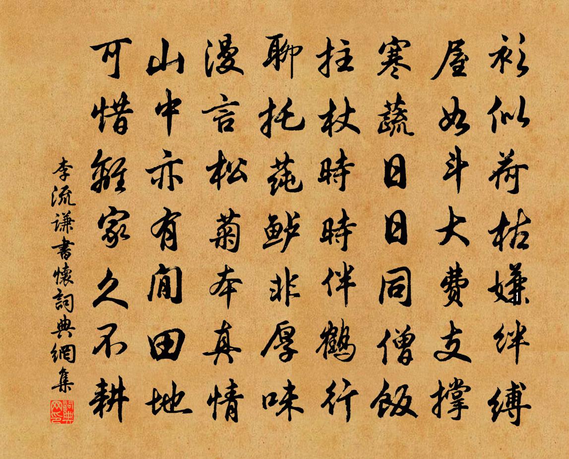 詩詞名句歷史字典書法欣賞書法字典國語詞典說文解字康熙字典古漢語字典標 題 作 者 詩 句 書懷作者:李流謙 朝代:宋代書懷原文衫似荷枯嫌絆縛,屋如斗大費支撐。寒蔬日日同僧飯,拄杖時時伴鶴行。聊托蓴鱸非厚味,漫言松菊本真情。山中亦有閒田地,可惜離家久不耕。詩詞問答問:書懷的作者是誰?答:李流謙問:書懷寫於哪個朝代?答:宋代李流謙書懷書法欣賞書懷書法作品詩詞推薦秋日山居好十首舒岳祥〔宋代〕秋日山居好,吾居山海間。意行逢酒住,興盡放歌還。稻獲歸流水,林疏縮遠山。誰知僧快活,飯飽即身閒。宋正紀輓詞二首郭印〔宋代〕姻好通來十八春,酒杯詩卷最相親。休心失約尋真侶,轉首誰知作古人。庵畔松篁長泣雨,室中書史暗凝塵。我嘗芭蕉三首楊萬里〔宋代〕骨相玲瓏透八窗,花頭倒掛紫荷香。繞身無數青羅扇,風不來時也不涼。福岩寺項安世〔宋代〕三日行東山,今朝度西嶺。山前福岩寺,高下得要領。下通赤帝廟,上徹祝融頂。迴環生氣勢,開闢見光景。湘江水調歌頭李光〔宋代〕白竊有恨焉,因以陶淵明為答,蓋有激雲耳元亮賦歸去,富貴比浮雲。常於鬧里,端的認得主和賓。肯羨當年軒冕山居十首薛嵎〔宋代〕前村雨腳收,斜陽掛高樹。老翁牽牛歸,頗亦有幽趣。山風響茅屋,崖月導芒屨。平生江湖心,於此謝馳鶩。吊賈島二首曹松〔唐代〕先生不折桂,謫去抱何冤。已葬離燕骨,難招入劍魂。旅墳低卻草,稚子哭勝猿。冥寞如搜句,宜邀賀監論。青旆山行入涇州王昌齡〔唐代〕倦此山路長,停驂問賓御。林巒信回惑,白日落何處。徙倚望長風,滔滔引歸慮。微雨隨雲收,蒙蒙傍山去。西臨頌古八首釋元聰〔宋代〕一下蘭橈驀口鞭,大洋海底火燒天。父南子北家何許,風滿長空月滿船。春從天上來姬翼〔元代〕肥馬輕衫。富貴里功名,心醉如酣。枕中春夢,誰信鵬程,摩天巨翼圖南。被目前虛幻,空攖擾、枷鎖擎擔。更何武威同諸公過楊七山人,得藤字高適〔唐代〕幕府日多暇,田家歲復登。相知恨不早,乘興乃無恆。窮巷在喬木,深齋垂古藤。邊城唯有醉,此外更何能。韋員外家花樹歌岑參〔唐代〕今年花似去年好,去年人到今年老。始知人老不如花,可惜落花君莫掃。君家兄弟不可當,列卿御史尚書郎。朝回乞梅花方岳〔宋代〕晚雲撩亂商量雪,家傍梅花合有詩。不寄一枝春苦吝,相思五夜夢先知。乘雲而下惟姑射,得聖之清者伯夷。已戒和立齋對菊二歌王柏〔宋代〕秋至百芳歇,籬邊佳 * 。遙思古節士,愛此黃華蕃。我生千載下,恨不相同看。叢叢夜氣厚,曉葉千珠漙。中表座中詠蟬分韻得飢字吳龍翰〔宋代〕兩翼才乾殻已離,便升喬木最高枝。銀床落葉秋風裡,金掌盤敧曉露時。斷續翻成無調曲,悲涼做出苦吟詩。前身奉和御製朝元殿朝謝玉皇大帝夏竦〔宋代〕三清右序儲繁祉,萬乘欽明答上穹。聖化誕敷書軌混,仙遊昭假地天通。靈輝熠煜充丹禁,瑞霧霏微翳碧空。積累暴雨陸游〔宋代〕黑雲如龍爪,白雨如博棋。老屋處處漏,此夕將何之?豈惟移床避,殆欲懸釜炊。擾擾舍中人,具食不以時。兒女贈同志釋文珦〔宋代〕我本面無生儔,面涉有乖素麵願。百年面直寄耳,倏忽如過電。猶記學語時,老色遽滿面。富貴非所希,吾道在貧和虞道二十三弟晃沖之〔宋代〕千載風流賀秘書,也知今有此人無。吾家佼子真相似,不愧朝廷乞鑑湖。次林卿檳榔韻二首劉克莊〔宋代〕錦衣旋剖苞中實,梔面俄回鏡里春。始信中華禁酒國,不如南粵主林神。金盤惟送渠矜貴,糟罋酣釀子任真。赤腳名句推薦秋來相顧尚飄蓬,未就丹砂愧葛洪。杜甫《贈李白》 碧雲天,黃葉地,秋色連波,波上寒煙翠。范仲淹《蘇幕遮·懷舊》 羅幕輕寒,燕子雙飛去。晏殊《蝶戀花·檻菊愁煙蘭泣露》 烈士暮年,壯心不已。曹操《龜雖壽》 臣無隱忠,君無蔽言,國之祿也。劉向《戰國策·趙二·武靈王平晝閒居》 輪台東門送君去,去時雪滿天山路。岑參《白雪歌送武判官歸京》 日暖桑麻光似潑,風來蒿艾氣如薰。蘇軾《浣溪沙·軟草平莎過雨新》 行路難!行路難!多歧路,今安在?李白《行路難三首》 拱木不生危,松柏不生埤。左丘明《國語·晉語·醫和視平公疾》 不怨天,不尤人。孔子弟子《論語·憲問篇》