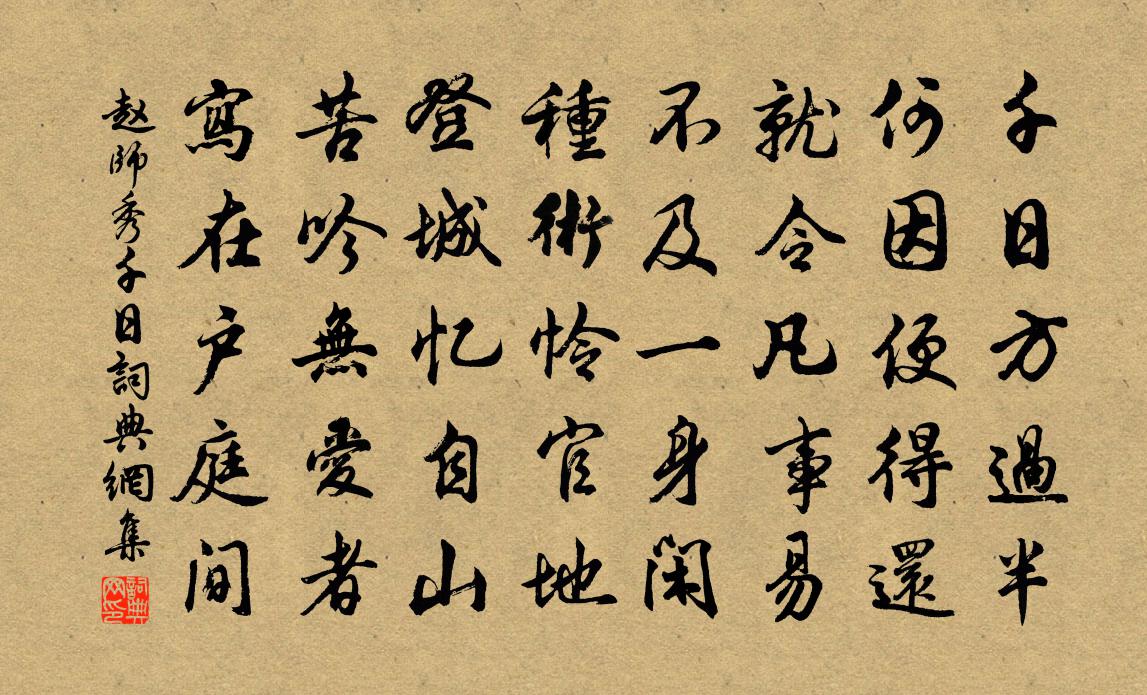 詩詞名句歷史字典書法欣賞書法字典國語詞典說文解字康熙字典古漢語字典標 題 作 者 詩 句 千日作者:趙師秀 朝代:宋代千日原文千日方過半,何因便得還。就令凡事易,不及一身閒。種術憐官地,登城憶自山。苦吟無愛者,寫在戶庭間。詩詞問答問:千日的作者是誰?答:趙師秀問:千日寫於哪個朝代?答:宋代趙師秀千日書法欣賞千日書法作品詩詞推薦水仙盛開,留子上弟小酌楊萬里〔宋代〕手種凌波香,今歲便十斛。要知誠齋中,富底水仙國。有酒偏欠花,有花恨無客。與子對花前,不醉便了得。待勸東園張耒〔宋代〕荒園何所有,落葉與衰叢。含芳未肯吐,惟有木芙蓉。 * 如佳人,紛萼包金茸。並隨重陽酒,娛此憔悴翁。何德器贈太湖石曾幾〔宋代〕愛山已成痴,愛石又成癖。徒聞有絲溪,時復夢靈壁。太湖只在眼,曾未收寸碧。多自五嶺來,仍煩百書索。何侯送黃曄明府岳州湘陰赴任厲玄〔唐代〕恩沾譴雪幾人同,歸宰湘陰六月中。商嶺馬嘶殘暑雨,席帆高掛早秋風。貢名頻向書闈失,飛檄曾傳朔漠空。西省送徐評事赴省試翁卷〔宋代〕早年通法後,已是立朝身。更道明經好,須為擢第人。馬寒村驛暮,燈暖帝城春。花氣多時節,高門有賀賓。阮郎歸佚名〔宋代〕薄羅生色畫酴醿。酴醿滿架時。隔池貪看燕爭泥。墜雙紅荔支。銷金字,晚唐詩。夾紗團扇兒。自遮微雨傍花歸。吊彥深李處權〔宋代〕已秀不成實,長懷事可吁。寧論日下鶴,遽失掌中珠。擾擾遭斯厄,冥冥喪厥軀。高堂親白髮,淚眼尚青枯。和慮可庵悲秋十首何夢桂〔宋代〕秋風來高樓,樓上棟雲飛。登樓杳西望,陰阻天雲垂。天闊渺無極,遊子去不歸。不歸在何許,意采南山芝。次韻因上人晚菊簡魏定父王之道〔宋代〕離索自可笑,衰遲誰見憐。亭亭搖落中,一枝小窗前。正色有家法,細看清且妍。浮觴未雲晚,松醪吾所便。偶成題裴晉公祠張耒〔宋代〕獨持將鉞靜氛妖,後世英名日月昭。善聽聖君非易遇,將亡凶豎不難梟。悲風蔓草移今古,野殿空庭鎖寂寥。更有海棠陳松龍〔宋代〕移根千里入名園,酒暈紅嬌氣欲昏。待得太真春睡醒,風光已不似開元。清心鏡 以示同流,如此修持,決證仙果馬鈺〔元代〕出家兒,要決斷。萬種塵緣,一齊割拚。便忘機、絕慮修仙,把性命了乾。外愚痴,內光燦。聲音笑貌,有如憨漢升山靈岩寺曾鞏〔宋代〕修竹長松十里陰,任敦燒藥洞門深。獨闚金版驚人語,能到青霞出世心。雞犬亦隨雲外去,蓬瀛何必海中尋。丹樓寄周吉卿仇遠〔宋代〕採菊籬根蕊尚青,開門稚子喜機關報晴。笑翁錯料人間事,風雨如何不滿城。和國哭因以奉勉曹勛〔宋代〕宿雲濃澹弄空明,桃李吹香雨屢經。燕識舊巢猶頡頏,枝駢新綠尚芳馨。力田須待年多黍,知病好尋參與苓。莫為同吳周朋高虞卿尋泉憩積暑下庵王洋〔宋代〕繚繞尋泉遠步遲,倦逢籬外敞庵扉。門前竹長雲垂舞,岩下泉甘雪未飛。景物偏幽緣舍小,茶香看客為僧稀。相公述字迴文偈七首宋太宗〔宋代〕前憂依述最,亨知休以祐。然留希佛背,生推求比舊。賣花聲·立春黃景仁〔清代〕獨飲對辛盤,愁上眉彎。樓窗今夜且休關。前度落紅流到海,燕子銜還。書貼更簪歡,舊例都刪。到時風雪滿千山宿法華寺嚴維〔唐代〕一夕雨沉沉,哀猿萬木陰。天龍來護法,長老密看心。魚梵空山靜,紗燈古殿深。無生久已學,白 * 相侵。偈頌一百二十三首釋崇岳〔宋代〕懷州牛吃禾,益州馬腹脹。天下覓醫人,灸豬左膊上。也好笑,也堪悲,耳垛元來兩片皮。名句推薦野店桃花紅粉姿,陌頭楊柳綠菸絲。趙孟頫《東城》 雨中百草秋爛死,階下決明顏色鮮。杜甫《秋雨嘆三首》 料得年年腸斷處,明月夜,短松岡。蘇軾《江城子·乙卯正月二十日夜記夢》 兒大詩書女絲麻,公但讀書煮春茶。黃庭堅《送王郎》 井灶有遺處,桑竹殘朽株。陶淵明《歸園田居·其四》 虎踞龍蟠何處是,只有興亡滿目。辛棄疾《念奴嬌·登建康賞心亭呈史致道留守》 萋萋芳草小樓西,雲壓雁聲低。劉基《眼兒媚·秋思》 是數人之齒,而以為富。墨子《墨子·48章 公孟》 世情薄,人情惡,雨送黃昏花易落。唐婉《釵頭鳳·世情薄》 半生已分孤眠過,山枕檀痕涴。納蘭性德《虞美人·曲闌深處重相見》