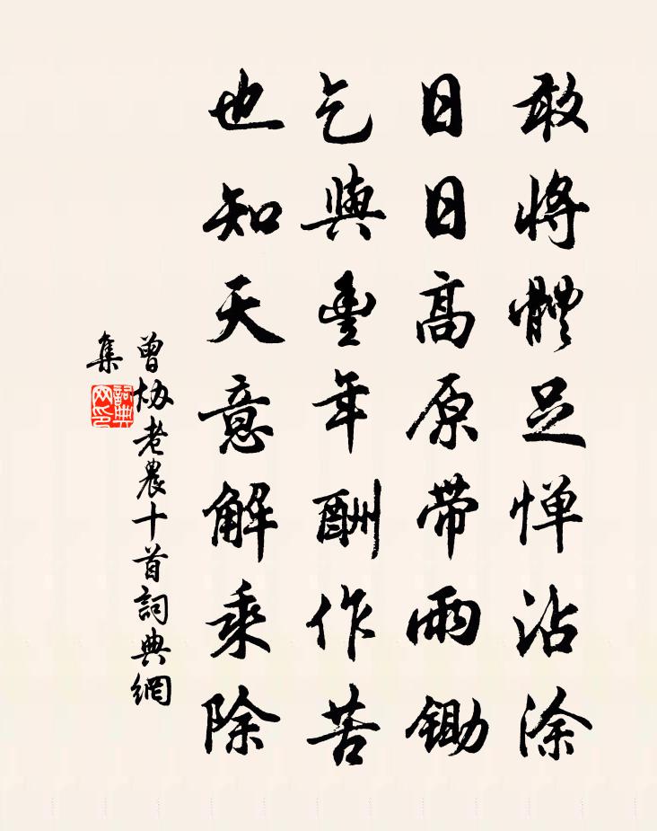 詩詞名句歷史字典書法欣賞書法字典國語詞典說文解字康熙字典古漢語字典標 題 作 者 詩 句 老農十首作者:曾協 朝代:宋代老農十首原文敢將體足憚沾塗,日日高原帶雨鋤。乞與豐年酬作苦,也知天意解乘除。詩詞問答問:老農十首的作者是誰?答:曾協問:老農十首寫於哪個朝代?答:宋代曾協老農十首書法欣賞老農十首書法作品詩詞推薦惜別五首程公許〔宋代〕憂患磨人鬢易皤,近來更覺別懷難。霜筠雪柏圖堅耐,願保貞心共歲寒。八聲甘州佚名〔宋代〕一團春雪,拋在玉爐中煎。炎炎進火不住添。要曉得通紅無焰煙。須管莫虧折,斤兩依然。如此三千。鍛鍊待不搖福勝院家之巽〔宋代〕三過山中寺,勞生有底忙。梵書蟲蠹紙,佛界燕巢梁。曉日光明藏,野花知見香。豐碑如會意,讀罷更彷徨。句錢惟演〔宋代〕綠野桑麻連四水,黃堂歌吹擁千兵。寄趙西皋先生顧逢〔宋代〕居官但欲歸,每恨去官遲。天下蒼生福,朝中宰相時。龍蛇三寸筆,風月百篇詩。此去除書至,難言以病辭。怪石范端臣〔宋代〕人間足安危,頃刻異候狀。唯應山中石,不愛客塵障。搜奇貯元龍,飛雲勞魯望。句張致遠〔宋代〕三寺樓台煙霧裡,一川蘆葦畫圖中。宮詞王仲修〔宋代〕暑天何處避炎蒸,駕在蕭台第九層。黃蓋亭亭日將午,宮嬪催賜近臣冰。清明大雪三日方回〔宋代〕半月雕梁燕子歸,怯寒著盡舊綿衣。何人醉眼西湖路,錯認楊花作雪飛。勸農出郊三絕王炎〔宋代〕小煩腳力上崔嵬,意為仙翁特地來。只有白雲藏古洞,不知黃鵠幾時回。時齋新植葛紹體〔宋代〕紅欄一帶樹青青,簾幙風輕颺曉晴。日轉花陰燕飛去,堂中惟有讀書聲。飯僧王建〔唐代〕別屋炊香飯,薰辛不入家。溫泉調葛面,淨手摘藤花。蒲鮓除青葉,芹齏帶紫芽。願師常伴食,消氣有薑茶。再賦前韻五首王洋〔宋代〕高臥江濱百慮清,獨於詩思尚營營。不勞刻楮三年力,攻破劉郎五字城。小桃紅·採蓮女楊果〔元代〕採蓮船上採蓮嬌,新月凌波小。記得相逢對花酌,那妖嬈,殢人一笑千金少。羞花閉月,沉魚落雁,不恁也魂消。除夜病中贈段屯田蘇軾〔宋代〕龍鍾三十九,勞生已強半。歲暮日斜時,還為昔人嘆。今年一線在,那復堪把玩。欲起強持酒,故交雲雨散。惟有贈隱僧釋文珦〔宋代〕禪居既高靜,道氣尤淒清。不褒市朝路,深諳猨鳥情。田衣聯槲葉,山火燎松明。自說歸棲後,柴門罷送迎。句薛能〔唐代〕百首如一首,卷初如卷終。坐久仆頭出,語多僧齒寒。西塞長雲盡,南湖片月斜。李白終無取,陶潛固不刊。我身重憶山居六首。釣石(於谿人處求得)李德裕〔唐代〕嚴光隱富春,山色谿又碧。所釣不在魚,揮綸以自適。余懷慕君子,且欲坐潭石。持此返伊川,悠然慰衰疾。過金壇遇劉宰區仕衡〔宋代〕故人逢傲吏,問驛下西關。制錦誰能似,鳴琴爾自閒。京江三國地,斗野五州山。去矣繁霜鬢,煙波照白綸。香積寺曾會〔宋代〕松門石徑亂雲粘,四顧藍光冷射簷。鏁霧樓台陰自潤,嘯風猿鳥韻相兼。寒岩路僻憑僧指,古篆香殘待客添。須信名句推薦花自飄零水自流。一種相思,兩處閒愁。李清照《一剪梅·紅藕香殘玉簟秋》 花間一壺酒,獨酌無相親。李白《月下獨酌四首·其一》 星漢燦爛,若出其里。曹操《觀滄海 / 碣石篇》 暗燈涼簟怨分離,妖姬,不勝悲。閻選《河傳·秋雨》 將軍狐裘臥不暖,都護寶刀凍欲斷。岑參《天山雪歌送蕭治歸京》 吾言甚易知,甚易行。天下莫能知,莫能行。老子《老子·德經·第七十章》 卦也者,著天下之時也。爻也者,效天下之動也。王通《中說·卷七·述史篇》 一身虜雲外,萬里胡天西。岑參《早發焉耆懷終南別業》 不期修古,不法常可。韓非及後人《韓非子·五蠹》 秋色雁聲愁幾許,都在斜陽。吳文英《浪淘沙·九日從吳見山覓酒》