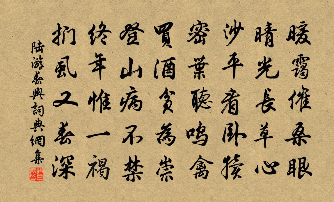 詩詞名句歷史字典書法欣賞書法字典國語詞典說文解字康熙字典古漢語字典標 題 作 者 詩 句 春興作者:陸游 朝代:宋代春興原文暖靄催桑眼,晴光長草心。沙平看臥犢,密葉聽鳴禽。買酒貧為崇,登山病不禁。終年惟一褐,捫虱又春深。詩詞問答問:春興的作者是誰?答:陸游問:春興寫於哪個朝代?答:宋代問:陸游的名句有哪些?答:陸游名句大全陸遊春興書法欣賞春興書法作品詩詞推薦晚歸藍田舊居錢起〔唐代〕雲卷東皋下,歸來省故蹊。泉移憐石在,林長覺原低。舊里情難盡,前山賞未迷。引藤看古木,嘗酒咒春雞。興與次韻答趙文卿四首陳造〔宋代〕簾疏財許客窺班,未得纏頭小破慳。已結雲愁蜚蝶夢,莫斜秋水蹙春山。酒旗彭齊〔宋代〕太平天子束戈矛,惟許青旗在酒樓。我有百瓢元帥量,使君酣戰客中愁。飲殖軒陳造〔宋代〕病骨今朝覺倍輕,雲天昨夜已全晴。爛游花木欣榮處,剩喜風煙指顧生。春草池塘頻入夢,夜窗燈火會尋盟。悵然題陳日華二友堂袁說友〔宋代〕書生作吏從朱墨,官事紛紛何日息。不堪雁鶩對敲朴,寧解詩書伴松竹。太丘退食何蕭然,筆研不落塵埃邊。前歲寄題武陵柳氏所居二首其二康樂樓蘇轍〔宋代〕邑居欲盡溪山好,不作層樓無奈何。岩谷滿前收蠟屐,漪漣極目卷漁蓑。安心已得安身法,樂土偏令樂事多。千里城東閒遊劉禹錫〔唐代〕借問池台主,多居要路津。千金買絕境,永日屬閒人。竹徑縈紆入,花林委曲巡。斜陽眾客散,空鎖一園春。寄城中親舊晁說之〔宋代〕蒼皇逐客投蘭若,傍曉衾寒喜且驚。隱隱似聞開靜版,沈沈欲歇讀經聲。好將遲暮此間過,強欲論思何處行。城裡游楚州天慶觀觀高道士琴棋張耒〔宋代〕頹垣蒼蒼鎖喬木,草滿荒庭不容足。壞檐破壁秋雨余,蛛網蕭蕭風滿屋。黃衣道人出迎客,野態生疏脫拘束。圍棋慈恩寺九日應制薛稷〔唐代〕寶宮星宿劫,香塔鬼神功。王游盛塵外,睿覽出區中。日宇開初景,天詞掩大風。微臣謝時菊,薄采入芳叢。雄雉佚名〔先秦〕雄雉于飛,泄泄其羽。我之懷矣,自詒伊阻。雄雉于飛,下上其音。展矣君子,實勞我心。瞻彼日月,悠悠我思。劉晁之家園六詠露華姜特立〔宋代〕水氣澄鮮暑氣微,一池菡萏映漣漪。精神妙處無人見,只在風清月冷時。逢江南故晝上人會中鄭方回孟郊〔唐代〕相逢失意中,萬感因語至。追思東林日,掩抑北邙淚。筐篋有遺文,江山舊清氣。塵生逍遙注,墨故飛動字。荒毀武后明堂樂章。配饗佚名〔唐代〕笙鏞間玉宇,文物昭清暉。睟影臨芳奠,休光下太微。孝思期有感,明絜庶無違。殘句:吾聞調羹槿黃庭堅〔宋代〕吾聞調羹槿,異味及粉榆。晚晴張嵲〔宋代〕繁得苦愛飄岐路,風雨何須送晚春。坐久綺霞明落照,屏雷亦解慰遊人。次韻野水花朝之集朱繼芳〔宋代〕睡起名園百舌嬌,一年春事說今朝。鞦韆庭院紅三徑,舴艋池塘綠半腰。苔色染青吟屐蠟,花風吹暖弊裘貂。主人忍辱仙人 春澤丘處機〔元代〕數載田苗長亢旱。今春雨雪何滋漫。嘉兆分明知過半。將來看。掀天大熟歌謳滿。二月花開成片段。千株柳發排堤題林處士肥上新屋壁劉筠〔宋代〕久厭侯鯖靜室來,卜居鄰近 * 。舊山鶴怨無錢買,新竹僧同借宅栽。斗酒誰從楊子學,扁舟空訪戴逵回。抽毫答呂晦叔見贈韓維〔宋代〕人情紛言偽,吾道本一純。苟為趨向合,不待結約親。曰今得夫子,所涉我異津。邀我醉華館,正逢雪花春。談笑名句推薦分手脫相贈,平生一片心。孟浩然《送朱大入秦》 小山重疊金明滅,鬢雲欲度香腮雪。溫庭筠《菩薩蠻·小山重疊金明滅》 病從口入,禍從口出。李昉、李穆、徐鉉《太平御覽·人事部·卷八》 歲寒無與同,朗月何朧朧。潘安《悼亡詩三首》 樹曲木者,惡得直景劉向《說苑·君道》 桃根桃葉終相守,伴殷勤、雙宿鴛鴦。納蘭性德《一叢花·詠並蒂蓮》 狎興生疏,酒徒蕭索,不似少年時。柳永《少年游·長安古道馬遲遲》 芳原綠野恣行事,春入遙山碧四圍。程顥《郊行即事》 夢中未比丹青見,暗裡忽驚山鳥啼。姜夔《鷓鴣天·元夕有所夢》 潯陽江頭夜送客,楓葉荻花秋瑟瑟。白居易《琵琶行 / 琵琶引》