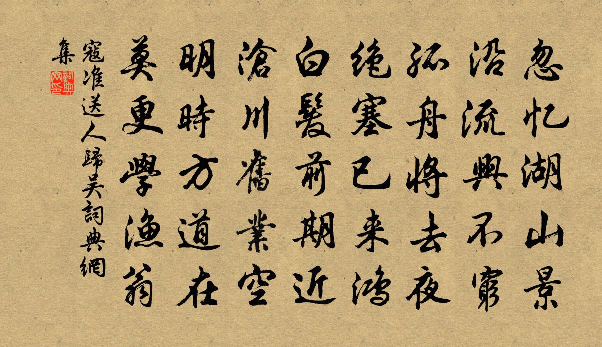詩詞名句歷史字典書法欣賞書法字典國語詞典說文解字康熙字典古漢語字典標 題 作 者 詩 句 送人歸吳作者:寇準 朝代:宋代送人歸吳原文忽憶湖山景,沿流興不窮。孤舟將去夜,絕塞已來鴻。白髮前期近,滄川舊業空。明時方道在,莫更學漁翁。詩詞問答問:送人歸吳的作者是誰?答:寇準問:送人歸吳寫於哪個朝代?答:宋代問:寇準的名句有哪些?答:寇準名句大全寇準送人歸吳書法欣賞送人歸吳書法作品詩詞推薦讀素問十六首方回〔宋代〕三陰與三陽,應天之六氣。五行加相火,於地分六位。羲畫箕子疇,恐亦出此意。漢儒災異學,可擇但勿泥。歸仁縣石堠張嵲〔宋代〕縣廢不知年,無人問遺址。石堠猶路傍,故物應唯此。郊野趙葵〔宋代〕白烏衡煙雲,山僧渡水來。竹籬茅舍外,忽見野梅開。挽故知容州朝請陶公章二首易中行〔宋代〕顧予生最後,相去又臨川。欠識先生面,幸親令子賢。典型端有自,衣缽豈無傳。德以君家好,清修一節堅。題迎仙堂白玉蟾〔宋代〕昔日尋師到海涯,手中常袖一青蛇。隨身風月長為伴,到處溪山總是家。玉笥岩前曾結草,金華洞裡獨餐霞。有人用晦翁十梅詩韻酬張伯修孫子直吳泳〔宋代〕看花須看神,折花莫折殘。但使花骨清,豈畏花地寒。別王恭叔樓鑰〔宋代〕兩兒雖近隔江潮,賴有王郎慰寂寥。遠侍雙親官道院,為同盡室餞西橋。腦脂遮眼最關念,客路尋仙勿憚遙。別後山中再次胡德昭韻文天祥〔宋代〕不將顏色汗黃金,落得灞橋驢上吟。是處江山生酒興,滿天風雪得梅心。觥籌堂里春聲沸,燈火林皋夜色深。相和歌辭採蓮歸王勃〔唐代〕採蓮歸,綠水芙蓉衣,秋風起浪鳧雁飛。桂棹蘭橈下長浦,羅裙玉腕搖輕櫓。葉嶼花潭極望平,江謳越吹相思苦。雁山出隊上陳侍郎釋了惠〔宋代〕尊者從空擲缽來,神通用盡卻成獃。看來不似維摩老,一默千門萬戶開。張虞卿輓詩朱長文〔唐代〕一臥東吳七十春,區區南北笑鄉人。盛開黌舍招英俊,敞辟華堂待縉紳。婉婉重孫勝彩服,煌煌兩婿擁朱輪。銘旌擬張九齡詠燕梅堯臣〔宋代〕眇眇雙來燕,長年與社違。任從新曆改,只向舊巢歸。永日當人語,輕寒逆雨飛。自親梁棟慣,不識海鷗機。食楊梅三首曾幾〔宋代〕一月如繩雨瀉檐,只言新竹漸多添。豈知政負幽人腹,不放楊梅蜜樣甜。祭方丘樂章。雍和褚亮〔唐代〕柔而能方,直而能敬。厚載以德,大亨以正。有滌斯牷,有馨斯盛。介茲景福,祚我休慶。水竹野十詠野堂葉茵〔宋代〕風來無市聲,景物占深淨。鷗狎堂上翁,時來點天鏡。五貺詩華頂杖皮日休〔唐代〕金庭仙樹枝,道客自攜持。探洞求丹粟,挑雲覓白芝。量泉將濯足,闌鶴把支頤。以此將為贈,惟君盡得知。紫溪莊舍讀癸丑壁間舊題轉眼忽十八年同游十劉學箕〔宋代〕少生四方,游紫之水。每有良朋,見止遇止。長喔伐木,求友乎此。樂以忘尤,雲胡不喜。賦祝次仲八景洞庭秋月劉學箕〔宋代〕木落露君山,空明夜氣浮。冰輪揩鑒淨,皓彩洋波流。空外數聲笛,孤吟人倚樓。送梁諫議陸游〔宋代〕湖海還朝白髮生,嬾隨年少事聲名。極知憂國人誰及,細看無心語自平。歸訪鄉人忘位重,乍辭言責覺身輕。籃輿獨倚胡仲弓〔宋代〕獨倚危樓望,清風動鬥牛。功名兩蠻觸,身世一蜉蝣。樂道貧何損,吟詩醉便休。靜中生萬感,燒燭看吳鉤。名句推薦拆桐花爛熳,乍疏雨、洗清明。柳永《木蘭花慢·拆桐花爛熳》 但東望、故人翹首。戴復古《賀新郎·寄豐真州》 畢竟西湖六月中,風光不與四時同。楊萬里《曉出淨慈寺送林子方》 疏籬曲徑田家小。雲樹開清曉。周邦彥《虞美人·疏籬曲徑田家小》 家在夢中何日到,春來江上幾人還?盧綸《長安春望》 風驅急雨灑高城,雲壓輕雷殷地聲。劉基《五月十九日大雨》 歌鐘不盡意,白日落昆明。李白《經亂離後天恩流夜郎憶舊遊書懷贈江夏韋太守良宰》 五更鼓角聲悲壯,三峽星河影動搖。杜甫《閣夜》 東風隨春歸,發我枝上花。李白《落日憶山中》 無情最是台城柳,依舊煙籠十里堤。韋莊《台城》