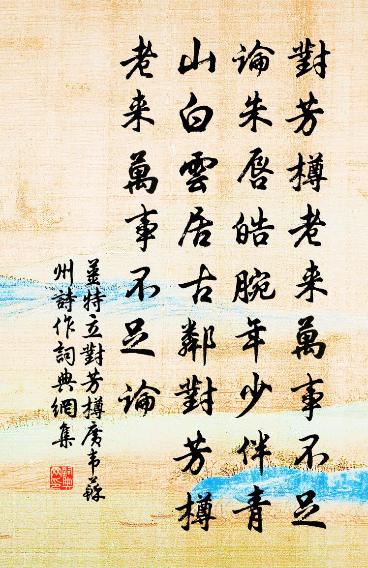 詩詞名句歷史字典書法欣賞書法字典國語詞典說文解字康熙字典古漢語字典標 題 作 者 詩 句 對芳樽廣韋蘇州詩作作者:姜特立 朝代:宋代對芳樽廣韋蘇州詩作原文對芳樽,老來萬事不足論。朱唇皓腕年少伴,青山白雲居古鄰。對芳樽,老來萬事不足論。詩詞問答問:對芳樽廣韋蘇州詩作的作者是誰?答:姜特立問:對芳樽廣韋蘇州詩作寫於哪個朝代?答:宋代姜特立對芳樽廣韋蘇州詩作書法欣賞對芳樽廣韋蘇州詩作書法作品詩詞推薦夏旱一首蘇籀〔宋代〕陽厄會百六,驕亢慘如燬。素秋垂二七,十旬赤千里。土田靈龜坼,水車渴烏柅。歷時書不雨,槁矣吁田穉。雖然出守桐廬道中十絕范仲淹〔宋代〕風塵日已遠,郡枕子陵溪。始見神龜樂,優優尾在泥。枕上仇遠〔宋代〕一官振饑荒,一官覆水旱。州里多應酬,田家少愁嘆。沁園春衣白山人〔宋代〕一粒金丹,大如黍米,定中降胎。運陰陽根本,東龍西虎,結凝金水,擇地深栽。九載無虧,三田功滿,卦氣周圓觀野塘荷花袁說友〔宋代〕淤泥生荷化,物外各有性。環城散紅錦,颭灩滿支徑。人臥蓮葉舟,酒吸碧筒柄。箇中有真樂,樂盡意不盡。古風送鄭路鈐姜特立〔宋代〕故人訪我雙溪邊,袖中明月五筰連。一笑傾倒秋風前,復憶鷺序同聯翩。君今半老我皤然,功名富貴空中煙。南柯擬試以蟲鳴秋曾豐〔宋代〕大化轉無休,蟲那得自由。暗中誰擘口,閒里共鳴秋。氣感蟾蜍冷,聲歸蟋蟀愁。幽閨勤杼柚,遠塞急衾裘。豈不寄題西湖並送淨慈顯老三絕范成大〔宋代〕膏肓泉石痼煙霞,半世游山不著家。老入 * 三昧定,坐看穿膝長蘆芽。偈傾一百三十三首釋法薰〔宋代〕解語非乾舌,能言不是聲。斬新提活句,冬後一陽生。頤軒詩六首黃庭堅〔宋代〕涇流不濁渭,種桃無李實。養心去塵緣,光明生虛室。再和胡寅〔宋代〕迥眺層台酒屢攜,千峰攢玉映瑤溪。南枝更有東風面,未減爭妍燦瓠犀。清平樂 和李御史春寒張野〔元代〕日長亭館。尚問寒深淺。底事今年花信晚。柳外東風未軟。韶光已近春分。小桃猶*霜痕。天意因憐病起,故教遲神雞童謠佚名〔唐代〕生兒不用識文字,鬥雞走馬勝讀書。賈家小兒年十三,富貴榮華代不如。能令金距期勝負,白羅繡衫隨軟輿。父死葉少保輓詞六首韓元吉〔宋代〕宦達平生早,高年及引歸。安車榮絳節,黃髮遽衰衣。未致生芻奠,俄驚薤露晞。孝心天地惻,相望兩靈幃。留江城將還富池董嗣杲〔宋代〕吟斷悲秋字,愁歸餞臘筵。天荒鵬路絕,水落雁汀懸。白羽沈郵箭,滄江負釣船。投閒須有日,處順且添年。題王侍御宅內亭子黃滔〔唐代〕俗間塵外境,郭內宅中亭。或有人家創,還無蓮幕馨。石曾湖岸見,琴誤岳樓聽。來客頻頻說,終須作畫屏。山鳥鄭谷〔唐代〕驚飛失勢粉牆高,好個聲音好羽毛。小婢不須催柘彈,且從枝上吃櫻桃。柳溪別墅姚孝錫〔宋代〕安車隨意飽甘肥,晚食徐行理亦齊。山市日高人未集,柴門客至餞無啼。溪橋散望攜筇度,野寺牽吟信筆題。容膝雁來紅孫吳會〔宋代〕訾碧成朱被眼瞞,分明是葉作花看。道人本不知香色,只與窗前草一般。林下宋庠〔宋代〕偶作中林適,聊觀萬化春。蜂巢喧似市,禽舌巧於人。陂溜鳴田尾,藤梢衣樹身。鄉農時晤語,野意合天真。名句推薦人生不可安閒,有恆業,才足收放心王永彬《圍爐夜話·第八三則》 萬國奔騰,兩宮幽陷,此恨何時雪。黃中輔《念奴嬌·炎精中否》 執古之道,以御今之有。能知古始,是謂道紀。老子《老子·道經·第十四章》 幽微靈秀地,無可奈何天。曹雪芹《紅樓夢·第五回》 歡言得所憩,美酒聊共揮。李白《下終南山過斛斯山人宿置酒》 一夜嬌啼緣底事,為嫌衣少縷金華。韋莊《與小女》 孤燈不明思欲絕,卷帷望月空長嘆。美人如花隔雲端!李白《長相思·其一》 黃鳥翩翩楊柳垂,春風送客使人悲。高適《東平別前衛縣李寀少府 / 送前衛縣李宷少府》 何時倚虛幌,雙照淚痕乾。杜甫《月夜》 何須急管吹雲暝,高寒灩灩開金餅。高觀國《菩薩蠻·何須急管吹雲暝》