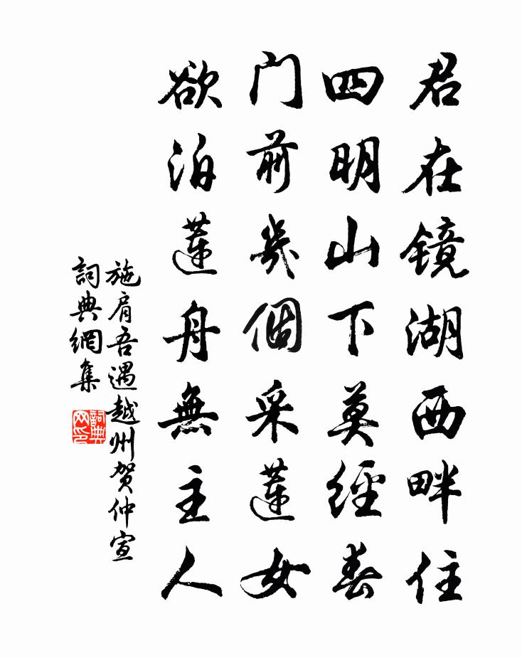 詩詞名句歷史字典書法欣賞書法字典國語詞典說文解字康熙字典古漢語字典標 題 作 者 詩 句 遇越州賀仲宣作者:施肩吾 朝代:唐代遇越州賀仲宣原文君在鏡湖西畔住,四明山下莫經春。門前幾個採蓮女,欲泊蓮舟無主人。詩詞問答問:遇越州賀仲宣的作者是誰?答:施肩吾問:遇越州賀仲宣寫於哪個朝代?答:唐代問:遇越州賀仲宣是什麼體裁?答:七絕施肩吾遇越州賀仲宣書法欣賞遇越州賀仲宣書法作品注釋全唐詩:卷494-168詩詞推薦晝錦堂宋自遜〔宋代〕荷龜葉龜游,龜庭皋鶴舞龜,應是秋龜滿淮涯。昨夜將星明處,彷佛峨眉。干戈已淨銀河淡,塵沙不動翠煙微。邦和漁具十絕牟巘五〔宋代〕熒熒枯蚌中,急雪灑不滅。西風明日晴,雙花為儂結。題金陵雜興詩後十八首李璉〔宋代〕夜過江左從鸞旗,從此靈君著漢衣。春到陰山花似雪,望鄉台上鷓鴣飛。送柳淡扶侍赴洪州(此子素少宦情共予有西山之好)皎然〔唐代〕中林許師友,忽阻夙心期。自顧青緺好,來將黃鶴辭。少年輕遠涉,世道得無欺。煙雨孤舟上,晨昏千里時。離魂祗奉天書六首真宗〔宋代〕玄穹眷懷,實符申錫。垂露勝文,粲然靈跡。發祥吉圖,純熙實欒。登薦欽崇,式昭天曆。滿江紅劉克莊〔宋代〕禱祝封姨,休把做、揚沙吹礫。費西帝、許多薰染,濃香深色。滿插銅匜芳氣烈,高張畫燭祥光赤。向先生、鼻觀侍飲寶子山游忠武侯祠程公許〔宋代〕一郡最高處,元戎領客游。雲根棲萬井,城角帶雙流。日薄樓台暝,風悲鼓角秋。臥龍千古恨,煙靄隔神州。次韻黃長孺別陳子得陳著〔宋代〕兩閒何納納,長夜正漫漫。感舊心猶熱,逢春眼自寒。人情伐木宋,世變幻花韓。寂寞衡茅下,從他作拙看。題尤延之給事所藏葛仙翁徙居圖樓鑰〔宋代〕莫言家具少於車,藥裹衣囊自有餘。老婦親攜三稚子,仙翁獨玩一篇書。羊牛相與趨新築,雞犬無因戀故廬。到處感遇之十八陳子昂〔唐代〕逶迤勢已久。骨鯁道斯窮。豈無感激者。時俗頹此風。灌園何其鄙。皎皎於陵中。世道不相容。喈喈張長公。暇日邀王天任諸公游南坡天任有詩因次韻虞儔〔宋代〕雨驟頻垂腳,山高故隱巔。南坡疑斷路,平地怪流泉。猿鶴誰為伴,鳧鴻亦墮前。梅黃雖借潤,榴火漫呈妍。人世送李瑜屯田通判潤州韓維〔宋代〕耳熟江南勝事傳,聞君官去便翛然。江流截楚紅塵斷,山勢吞吳秀色連。紫蟹迎霜新受釣,黃花吹酒正當前。嗟予減字木蘭花韋驤〔宋代〕帝城春媚。綠柳參天花照地。共樂昇平。處處樓台歌板聲。香輪玉鐙。馳驟芳郊爭選勝。妙舞輕謳。擾亂春風卒未題潘氏高遠台王柏〔宋代〕數曲梯階稍欠寬,略移武步到仙寰。詩懷納盡雙溪景,眼力推開千里山。方檻小欹煙雨外,飛蓬斜插鬥牛間。馮虛月夜馮時行〔宋代〕秋立雨新霽,氣清雲自消。地空銀海闊,天淨玉丸跳。把硯承明露,扶兒看碧霄。病禁淒冷得,不惜到明朝。次韻同年蔡仲平察院游西湖王之道〔宋代〕朝日不受霧,晴光似暉暉。忽然快我心,清風為解圍。坐見九里松,旌幢碧相依。天竺了在望,上有祥雲微。西湖沁園春 丁酉春,寓堠山錢氏寫懷謝應芳〔元代〕冷笑班超,要覓花侯,棄了花錐。看今來古往,虛名何用,朝榮夕悴,浮世堪悲。老我衣冠,傍人籬落,賴有平花寄無著釋清壹〔宋代〕逢人稱宿臘,玄解少人知。俗濁唯貪隱,禪高不礙詩。水邊秋杖屨,石上雪鬚眉。雞犬添鄰曲,還同賦紫芝。宿鹿門寺宋庠〔宋代〕寶剎翔鴛地,靈祠刻鹿門。天風奏林籟,海日破岩昏。轉眩三休閣,莊嚴兩足尊。峰迴徒覺秀,瀑遠不知源。花拂薛道祖二花詩帖贊岳珂〔宋代〕菊粲粲兮東籬,連的的兮西風。是皆不受夫一塵之染,而特立於九秋之中。予固喜其潔清而自全,亦以觀筆之妙而名句推薦花不語,水空流。年年拚得為花愁。晏幾道《鷓鴣天·守得蓮開結伴遊》 當斷不斷,反受其亂班固《漢書·傳·高五王傳》 長恨人心不如水,等閒平地起波瀾。劉禹錫《竹枝詞九首·其七》 橫笛驚征雁,嬌歌落塞雲。岑參《奉陪封大夫九日登高》 暗凝佇。近重陽、滿城風雨。周密《掃花游·九日懷歸》 腸斷月明紅豆蔻,月似當時,人似當時否?納蘭性德《鬢雲松令·枕函香》 不堪腸斷思鄉處,紅槿花中越鳥啼。李德裕《謫嶺南道中作》 十輪霜影轉庭梧,此夕羈人獨向隅。晏殊《中秋月》 清明節,雨晴天,得意正當年。薛昭蘊《喜遷鶯·清明節》 人生一世,草長一春。佚名《增廣賢文·上集》