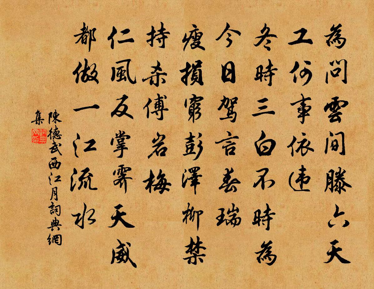 詩詞名句歷史字典書法欣賞書法字典國語詞典說文解字康熙字典古漢語字典標 題 作 者 詩 句 西江月作者:陳德武 朝代:宋代西江月原文為問雲間滕六,天工何事依違。冬時三白不時為。今日駕言春瑞。瘦損窮彭澤柳,禁持殺傅岩梅。仁風反掌霽天威。都做一江流水。詩詞問答問:西江月的作者是誰?答:陳德武問:西江月寫於哪個朝代?答:宋代問:西江月是什麼體裁?答:詞陳德武西江月書法欣賞西江月書法作品詩詞推薦竹竿佚名〔先秦〕籊籊竹竿,以釣於淇。豈不爾思?遠莫致之。泉源在左,淇水在右。女子有行,遠兄弟父母。淇水在右,泉源在左故宅劉克莊〔宋代〕恰則炎炎未百年,今看枯柳著疏蟬。莊田置後頻移主,書畫殘來亦賣錢。春日有花開廢圃,歲時無酒滴荒阡。朱門送僧東遊鮑溶〔唐代〕風流東晉後,外學入僧家。獨唱郢中雪,還游天際霞。雲村共香飯,水月喻秋花。景物添新致,前程詎可涯。晚步項安世〔宋代〕晚飯下前墀,徐行出短籬。輕風吹面處,斜日倚門時。靜見雲舒捲,閒知草盛衰。放懷無一事,隨意得新詩。集同年於聚景圖袁說友〔宋代〕慈恩回首幾番春,樽酒相期在帝京。人事好乖知歲久,天宮作意得朝晴。向來禁籞所未到,同此英游真可榮。無奈寶閣尚書凌公輓詩虞儔〔宋代〕未識嵇中散,今無元魯山。宦遊真恨晚,逸駕竟難攀。閱月推評旦,聞風尚起頑。九原那可作,蒼弁亦推顏。繁昌江邊風兩獺祭魚人立而拜鄭起〔宋代〕寒食清明在客途,片帆飄泊老無廬。松楸方念無人掃,忽見江邊獺祭魚。和胡俛學士紅絲桃蘇頌〔宋代〕京都花品予嘗評,夭桃僅有十數名。含絲繁艷今始識,鮮苞長蕊彯紅纓。春晴日暖助顏色,灼灼一片朝霞輕。鮫綃感事李石〔宋代〕輕衫輕騎雪邊州,不是書生戰不侯。臥枕太阿龍夜吼,夢隨水凍截河流。青青澗上松送致遠入官范成大〔宋代〕青青澗上松,廖廖澗底柏。松森上曾雲,柏局抱幽石。偃植雖不同,臭味乃相得。千霜與百雪,偶立眾芳側。眾芳句周元仲〔宋代〕愁別園林後夜春。秋雨嘆十解楊萬里〔宋代〕晝落無聲夜有聲,只堪醉聽不堪醒。檐牙半點能多少?滴入苔階一寸青。行色司馬池〔宋代〕冷於陂水淡於秋,遠陌初窮見渡頭。猶賴丹青無處畫,畫成應遣一生愁。筠州二詠其一牛尾狸蘇轍〔宋代〕首如狸,尾如牛,攀條捷險如猱猴。橘柚為漿栗為餱,筋肉不足惟膏油。深居簡出善自謀,尋蹤發窟並執囚,蓄租再次去年子中兄送黃雀不至韻周必大〔宋代〕祝壽筵開正小春,兄酬弟勸喜津津。披綿走送非無意,小愧乘成多忘人。月中仙 對松丘處機〔元代〕落落長松,倚浮雲大山高占幽僻。亭亭隱士,愛洞天岩穴,深藏虛極。對門開是景,掛猿狹*、離羅峭壁。盡日無太師中書令魏國公冊贈尚書令追封真定王趙挽王禹偁〔宋代〕經緯千年業,陶熔萬物功。藩垣龍節在,禁掖鳳池空。鹵簿蒙寒雨,銘旌揚曉風。太常草儀注,全似葬周公。悼室人詩江淹〔南北朝〕駕言出遊衍。冀以滌心胸。復值煙雨散。清陰帶山濃。素沙匝廣岸。雄虹冠尖峯。出風舞森桂。落日曖圓松。還結浣溪沙(春暮)趙長卿〔宋代〕柳老拋綿春已深。袷衣初試曉寒輕。別離無奈此時情。先自愁懷容易感,不堪聞底子規聲。西樓料得數回程。早春李中〔唐代〕一種和風至,千花未放妍。草心並柳眼,長是被恩先。名句推薦澹泊之守,須從穠艷場中試來;鎮定之操,還向紛紜境上勘過。陳繼儒《小窗幽記·集醒篇》 美人卷珠簾,深坐顰蛾眉。李白《怨情》 惆悵東欄一株雪,人生看得幾清明。蘇軾《東欄梨花》 岱宗夫如何?齊魯青未了。杜甫《望岳》 終日兩相思。為君憔悴盡,百花時。溫庭筠《南歌子·倭墮低梳髻》 行賢而去自賢之心,焉往而不美。韓非及後人《韓非子·說林上》 曾逐東風拂舞筵,樂遊春苑斷腸天。李商隱《柳》 盡做舊愁都忘卻,新愁何處著王庭筠《謁金門·雙喜鵲》 空山新雨後,天氣晚來秋。王維《山居秋暝》 常有江南船,寄書家中否。王維《雜詩三首》