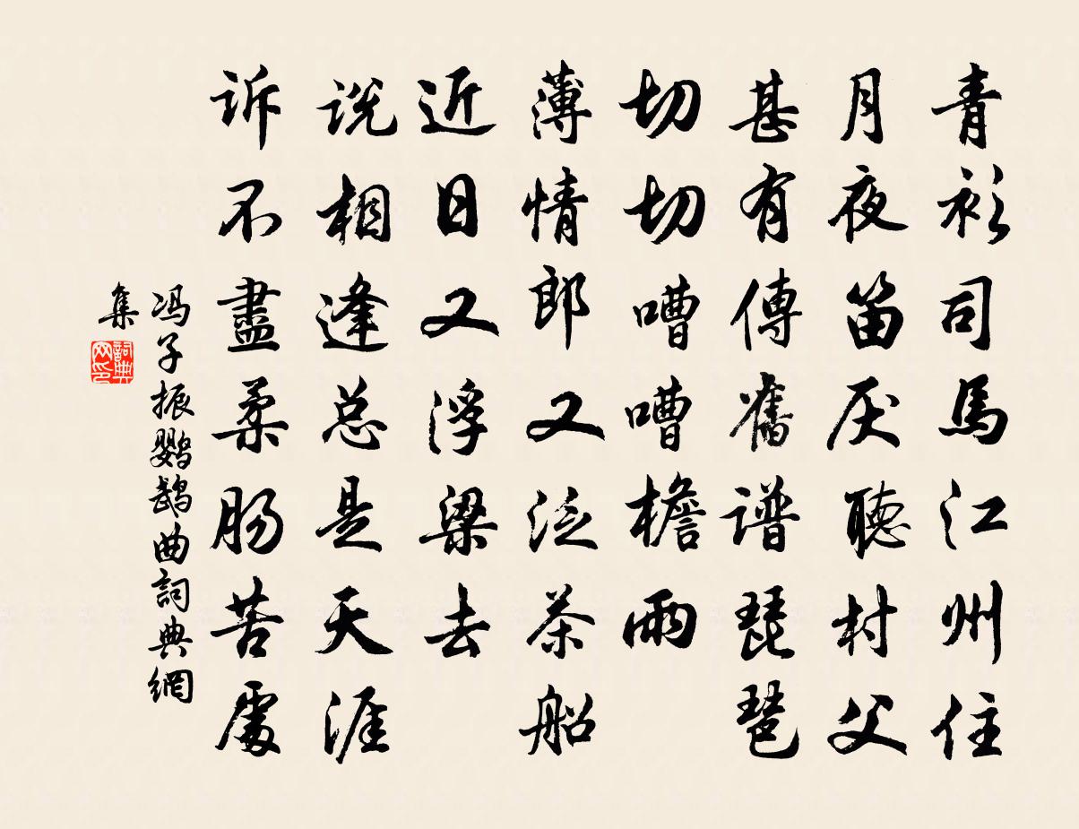 詩詞名句歷史字典書法欣賞書法字典國語詞典說文解字康熙字典古漢語字典標 題 作 者 詩 句 鸚鵡曲作者:馮子振 朝代:元代鸚鵡曲原文青衫司馬江州住。月夜笛厭聽村父。甚有傳舊譜琵琶,切切嘈嘈檐雨。薄情郎又泛茶船,近日又浮梁去。說相逢總是天涯,訴不盡柔腸苦處。詩詞問答問:鸚鵡曲的作者是誰?答:馮子振問:鸚鵡曲寫於哪個朝代?答:元代問:鸚鵡曲是什麼體裁?答:詞馮子振鸚鵡曲書法欣賞鸚鵡曲書法作品詩詞推薦酬楊遂王禹偁〔宋代〕楊君江左士,文律何飄飄。人言未冠時,作賦凌洞簫。甲科中南國,通籍趨東朝。轗軻位不進,陶潛還折腰。宰邑剪彩沈佺期〔唐代〕宮女憐芳樹,裁花競早榮。寒依刀尺盡,春向綺羅生。弱蒂盤絲髮,香蕤結素成。纖枝幸不棄,長就玉階傾。虞美人·春愁陳亮〔宋代〕東風盪揚輕雲縷。時送蕭蕭雨。水邊台榭燕新歸。一口香泥濕帶、落花飛。海棠糝徑鋪香繡。依舊成春瘦。黃昏庭五月二十三日甲子交六月節稍晴三四五復大雨方回〔宋代〕每日看天色,今年厭雨聲。重新六甲換,喜得一朝晴。疲卒淹窮谷,饑民守壞城。竹深荷淨處,猶憶舊承平。寄趙碧瀾顧逢〔宋代〕窗下看書坐,挑燈庭欲分。秋聲鳴處無,落葉靜中聞。庭月一方雪,爐香數朵雲。寄來詩在幾,讀著又思君。送容州中丞赴鎮張佖〔宋代〕交趾同星坐,龍泉佩鬥文。燒香翠羽帳,看舞鬱金裙。鷁首沖瀧浪,犀渠拂嶺雲。莫教銅柱北,只說馬將軍。化夏供釋子益〔宋代〕興化年來徹骨貧,口生白醭面生塵。不知那個無思算,來飽無心閒道人。知府黃寺簿生日釋紹嵩〔宋代〕筆端風雨發天慳,應有清名動九關。正直早年聞苦節,只今文翰許誰攀。和叔夏田舍三絕胡寅〔宋代〕作堨辛勤雨更遲,桔槔誰語漢陰知。不嫌機事侵純白,一日何妨灌百畦。贈趙公旦張嵲〔宋代〕少年意氣隘九州,遠別不為兒女愁。只今摧頹落異縣,跬步信宿生離憂。況今送子又千里,使我別緒何能休。憶昔頌古十一首釋子益〔宋代〕多處添些已是訛,少處減些還是誑。幾多著眼看機輪,誰知不在機輪上。哭郭同舍林景熙〔宋代〕寂寞青燈舊,流離白髮新。病猶依故國,死乃見全人。殘墨家無子,高風墓有鄰。斯文堪一哭,落日冷湖濱。贈浮梁汪易數錢時〔宋代〕君詩袞袞生蓍後,吾事昭昭未畫前。一笑相逢秋色裹,雙溪風月蜀溪邊。和李員外扈駕幸溫泉宮錢起〔唐代〕未央月曉度疏鍾,鳳輦時巡出九重。雪霽山門迎瑞日,雲開水殿候飛龍。經寒不入宮中樹,佳氣常薰仗外峰。遙羨詩王粲〔魏晉〕聯翻飛鸞鳥。獨游無所因。毛羽照野草。哀鳴入青雲。我尚假羽翼。飛覩爾形身。願及春陽會。交頸遘殷勤。秋空齊己〔唐代〕已覺秋空極,更堪寥泬青。只應容好月,爭合有妖星。耿耿高河截,翛翛一雁經。曾於洞庭宿,上下徹心靈。八月十六張園玩月得一字戴表元〔宋代〕明河湯殘雲,青海收晚日。婆娑林端月,為我良久出。洗杯問勞苦,天女笑肸肸。月行虛空中,萬古無損失。且可挽諸葛壽之孫應時〔宋代〕幼學蒙題品,童心吒弟兄。過從十年足,悃款一家情。無力寬貧病,傳書隔死生。西風吹客淚,萬里寸心明。次韻王鞏見寄蘇轍〔宋代〕日永宮閒自在慵,門前客到未曾通。憐君避世都門裡,勸我忘憂酒盞中。城下柳陰新過雨,湖邊荷葉自翻風。早須梅台李龍高〔宋代〕彈壓群芳不敢開,清高地位隔塵埃。抬頭一見風霜面,莫是花中御史來。名句推薦琴里知聞唯淥水,茶中故舊是蒙山。白居易《琴茶》 予獨愛蓮之出淤泥而不染,濯清漣而不妖周敦頤《愛蓮說》 瑤池阿母綺窗開,黃竹歌聲動地哀李商隱《瑤池》 怒濤卷霜雪,天塹無涯。柳永《望海潮·東南形勝》 晴雲輕漾,薰風無浪,開樽避暑爭相向。薛昂夫《西湖雜詠·夏》 女兒年幾十五六,窈窕無雙顏如玉。蕭衍《東飛伯勞歌》 目送征鴻飛杳杳,思隨流水去茫茫。孫光憲《浣溪沙·蓼岸風多橘柚香》 莫等閒,白了少年頭,空悲切!岳飛《滿江紅·寫懷》 問他有甚堪悲處?思量卻也有悲時,重陽節近多風雨。辛棄疾《踏莎行·庚戌中秋後二夕帶湖篆岡小酌》 蕭條亭障遠,悽慘風塵多庾信《擬詠懷二十七首·其二十六》