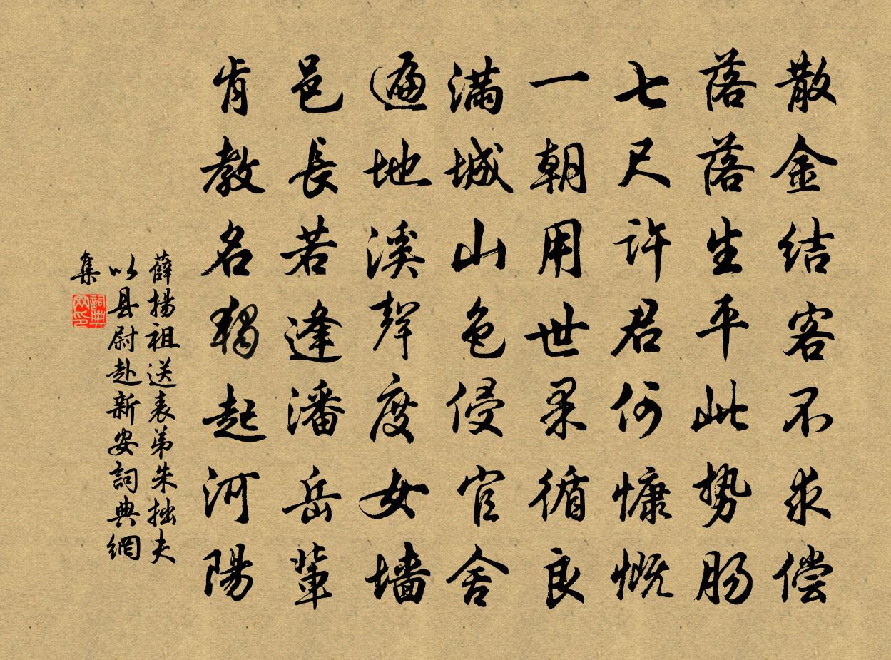 詩詞名句歷史字典書法欣賞書法字典國語詞典說文解字康熙字典古漢語字典標 題 作 者 詩 句 送表弟朱拙夫以縣尉赴新安作者:薛揚祖 朝代:宋代送表弟朱拙夫以縣尉赴新安原文散金結客不求償,落落生平此勢腸。七尺許君何慷慨,一朝用世果循良。滿城山色侵官舍,遍地溪聲度女牆。邑長若逢潘岳輩,肯教名獨起河陽。詩詞問答問:送表弟朱拙夫以縣尉赴新安的作者是誰?答:薛揚祖問:送表弟朱拙夫以縣尉赴新安寫於哪個朝代?答:宋代薛揚祖送表弟朱拙夫以縣尉赴新安書法欣賞送表弟朱拙夫以縣尉赴新安書法作品詩詞推薦收芋偶成陳著〔宋代〕數窠岷紫破窮搜,珍重留為老齒羞。粒飯如拳饒地力,糝羹得手擅風流。家貧自盍勤多種,歲晚何當飽一收。回首和王覺民民松軒詩王之道〔宋代〕蒼髯綠髮三四椽,茅齋高下輕且軒。清風入夜可人意,來與夫子調朱弦。連日秋陰盪殘暑,抖擻煩襟欲輕舉。簡編送少卿知宣州梅堯臣〔宋代〕汴水清明下,宣城太守行。鴨頭吳盪綠,燕尾楚船輕。放本三陽重,詩從小謝清。州民還最喜,門下舊通名。魏倉曹宅各賦一物得當軒石竹李頎〔唐代〕羅生殊眾色,獨為表華滋。雖雜蕙蘭處,無爭桃李時。同人趨府暇,落日後庭期。密葉散紅點,靈條驚紫蕤。芳菲齊天樂(秋興)史達祖〔宋代〕闌乾只在鷗飛處,年年怕吟秋興。斷浦沈雲,空山掛雨,中有詩愁千頃。波聲未定。望舟尾拖涼,渡頭籠暝。正好贈趙奉議陳師道〔宋代〕為惠不必廣,但問與者誰。受施何用多,名義以為資。平生師友間,四海參寥師。一窮無四壁,百代有千詩。再逐次韻知郡安撫元夕賞倅廳紅梅范成大〔宋代〕春入林梢一再風,破寒勻染費天工。雖然媚盪新妝別,只與橫斜舊格同。午枕乍醒鉛粉退,曉奩初罷蠟脂融。後來資中八首范祖禹〔宋代〕醮壇高倚碧天開,中有清都白玉台。霧擁霓旌乘月去,風吹仙樂下天來。感別送從叔校書簡再登科東歸孟郊〔唐代〕長安車馬道,高槐結浮陰。下有名利人,一人千萬心。黃鵠多遠勢,滄溟無近潯。怡怡靜退姿,泠泠思歸吟。菱唱春寒葉茵〔宋代〕寒禁蕨芽拳尚小,雨緘茶觜舌無香。山翁不信春光老,祗道儂家未積秧。上李昉相公王操〔宋代〕朝苑優遊數十春,文章敵手更無人。對敭旒冕如僚友,下直門闌似隱淪。倚檻白雪供醉望,搘筇黃葉落吟身。年來往時趙蕃〔宋代〕往時聽說嚴州水,試向經行覓舊痕。尚有浮槎棲古木,可憐萬壑勢併吞。別李郎中薛濤〔唐代〕花落梧桐鳳別凰,想登秦嶺更淒涼。安仁縱有詩將賦,一半音詞雜悼亡。詠史下慕容恪陳普〔宋代〕傅說濟川空道在,彥方販鬻嘆時難。年來惟有樽空慮,一任滔滔溉倒瀾。緣識宋太宗〔宋代〕南北及東西,千山與萬溪。路岐長不斷,曲直幾人迷。夢中作陸游〔宋代〕野鶴翩僊啄粒微,碧桃縹緲著花稀。海山又見春風到,丹灶苔封人未歸。醜奴兒(餞鄭憲)張孝祥〔宋代〕寶蠟燒春夜影紅。梅花枝傍錦薰籠。曲瓊低卷瑞香風。萬里江山供燕几,一時賓主看談鋒。問君歸計莫匆匆。興安道中雪晴見群山偶成李廌〔宋代〕關山千里涌銀濤,晚日烘雲欲動搖。滕六自知遷客近,前驅一洗瘴煙消。荷葉蘇軾〔宋代〕田田抗朝陽,節節臥春水。平鋪亂萍葉,屢動報魚子。句姚孝錫〔宋代〕舞風初學絮,帶雨不成花。名句推薦烽火連三月,家書抵萬金。杜甫《春望》 帝里重清明,人心自愁思。孟浩然《清明即事》 名花傾國兩相歡,常得君王帶笑看。李白《清平調·名花傾國兩相歡》 大膽天下去得,小心寸步難行。馮夢龍《警世通言·卷二十一》 強整繡衾,獨掩朱扉,枕簟為誰鋪設。阮逸女《花心動·春詞》 微吟不道驚溪鳥,飛入亂雲深處啼。沈周《題畫》 小人錯其在己者,而慕其在天者。荀子《荀子·天論》 婦人依倚子與夫,同居貧賤心亦舒。張籍《征婦怨》 河畔青蕪堤上柳,為問新愁,何事年年有?馮延巳《鵲踏枝·誰道閒情拋棄久》 天時人事日相催,冬至陽生春又來。杜甫《小至》