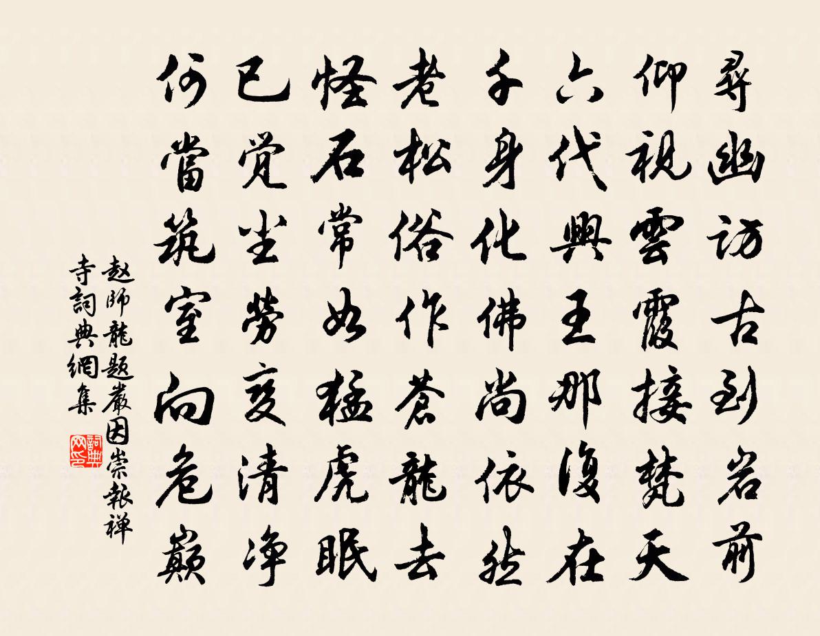 詩詞名句歷史字典書法欣賞書法字典國語詞典說文解字康熙字典古漢語字典標 題 作 者 詩 句 題嚴因崇報禪寺作者:趙師龍 朝代:宋代題嚴因崇報禪寺原文尋幽訪古到岩前,仰視雲霞接梵天。六代興王那復在,千身化佛尚依然。老松俗作蒼龍去,怪石常如猛虎眠。已覺塵勞變清淨,何當築室向危巔。詩詞問答問:題嚴因崇報禪寺的作者是誰?答:趙師龍問:題嚴因崇報禪寺寫於哪個朝代?答:宋代趙師龍題嚴因崇報禪寺書法欣賞題嚴因崇報禪寺書法作品詩詞推薦宮詞一百首岳珂〔宋代〕龍鸞騫舞寫宸間,秘閣交輝白玉堂。格是帝中稱第一,不交合作羨鐘王。偈頌一百四十一首釋師範〔宋代〕秋高增爽氣,夜寒添夾被。草蟲吟壁根,黃葉飄庭際。直得山僧展轉返側,喜而不寐。阿呵呵,伸腳元在縮腳裹。瓦廟李廌〔宋代〕柱側檐欹瓦欲飄,斷垣苔澀樹蕭蕭。滿庭荒草無香火,惟有禽聲伴寂寥。句司馬光〔宋代〕蟬聲若喚人。雪西施釋智圓〔宋代〕范蠡無西施,胡以破吳國。吳王輕社稷,為惑傾城色。夫差強變弱,勾踐雌成雄。豈惟陶朱策,實賴西施容。西施惜分飛毛滂〔宋代〕恰則心頭托托地。放下了日多縈系。別恨還容易。袖痕猶有年時淚。滿滿頻斟乞求醉。且要時閒忘記。明日劉郎起張迪功攜詩見過次韻謝之二首陳與義〔宋代〕黃雞白日唱初闌,便覺杯觴耐薄寒。坐上客多真足樂,床頭易在不須看。更思深徑挼紅蕊,政待移廚洗玉盤。若恨寄楊先生李中〔唐代〕仙翁別後無信,應共煙霞卜鄰。莫把壺中秘訣,輕傳塵里遊人。浮生日月自急,上境鶯花正春。安得一招琴酒,與琵琶亭喻良能〔宋代〕琵琶人去幾經秋,司馬青衫亦故丘。唯有當時亭下水,無情依舊更東流。送鄭粹子善劉克莊〔宋代〕早飲世德如龍虎,晚挹英標亦鳳麟。重濬陂塘今長古,不私風月肯分人。袞衣國既歸真宰,珠履君應作上賓。洛社贈舉之僕射 今春與僕射三為寒食之會。白居易〔唐代〕雞球餳粥屢開筵,談笑謳吟間管弦。一月三回寒食會,春光應不負今年。釣叟杜荀鶴〔唐代〕田不曾耕地不鋤,誰人閒散得如渠。渠將底物為香餌,一度抬竿一個魚。立春示兒二首王之道〔宋代〕雪盡適沾雨,臘窮初得春。上冰魚意樂,出谷鳥聲新。便覺風光好,何憂活計貧。一樽聊共醉,疏率見吾真。山居詩釋延壽〔宋代〕青山一坐萬緣休,努力應須與古儔。散誕襟懷因絕趣,消疏活計為無求。花明小砌和春月,松暗前軒帶雨秋。景像送友人之江南項斯〔唐代〕東南路苦辛,去路見無因。萬里此相送,故交誰更親。日浮汀草綠,煙霽海山春。握手無別贈,為予書札頻。百年歌陸機〔魏晉〕三十時。行成名立有令聞。力可扛鼎志乾雲。食如漏巵氣如熏。辭家觀國綜典文。高冠素帶煥翩紛。酒將炙奈樂何紅梅牛士良〔宋代〕隴頭人未來,江南春幾許。惆悵玉笛聲,吹落胭脂雨。鵲橋仙 漁父詞和放翁韻韓奕〔元代〕三江秋水,五湖春雨。只在釣船中住。滔滔波浪與天浮,釣時認得魚多處。杏壇有樹。桃源有路。罷釣有時間去。白首蘇泂〔宋代〕白首百歲期,青春三月暮。荒涼雞下柵,寂寞鶯啼樹。山水越王城,行人雨中去。春日七首呂祖謙〔宋代〕短短菰蒲綠未齊,汀洲水暖雁行低。柳陰小艇無人管,自送流花下別溪。名句推薦昔聞洞庭水,今上岳陽樓杜甫《登岳陽樓》 春無主!杜鵑啼處,淚灑胭脂雨陳子龍《點絳唇·春日風雨有感》 垂下簾櫳。雙燕歸來細雨中。歐陽修《採桑子·群芳過後西湖好》 小住京華,早又是,中秋佳節。秋瑾《滿江紅·小住京華》 袨服華妝著處逢,六街燈火鬧兒童。元好問《京都元夕》 佳辰強飲食猶寒,隱几蕭條戴鶡冠。杜甫《小寒食舟中作》 春蠶到死絲方盡,蠟炬成灰淚始乾。李商隱《無題·相見時難別亦難》 大堤欲上誰相伴,馬踏春泥半是花。竇鞏《襄陽寒食寄宇文籍》 仁者愛人,有禮者敬人。愛人者人恆愛之,敬人者人恆敬之。孟子《孟子·離婁章句下·第二十八節》 言而當、知也;默而當,亦知也荀子《荀子·非十二子》