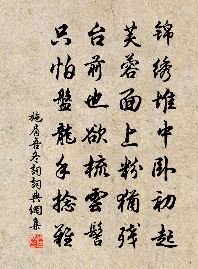 詩詞名句歷史字典書法欣賞書法字典國語詞典說文解字康熙字典古漢語字典標 題 作 者 詩 句 冬詞作者:施肩吾 朝代:唐代冬詞原文錦繡堆中臥初起,芙蓉面上粉猶殘。台前也欲梳雲髻,只怕盤龍手捻難。詩詞問答問:冬詞的作者是誰?答:施肩吾問:冬詞寫於哪個朝代?答:唐代問:冬詞是什麼體裁?答:七絕施肩吾冬詞書法欣賞冬詞書法作品注釋全唐詩:卷494-175詩詞推薦夢覺傅察〔宋代〕日永不可過,夜涼愁更多。蟬聲嘶晚月,孤枕夢如何。傷華發羅隱〔唐代〕舊國迢迢遠,清秋種種新。已衰曾軫慮,初見忽沾巾。日薄梳兼懶,根危鑷恐頻。青銅不自見,只擬老他人。晦日重宴周思鈞〔唐代〕綺筵乘晦景,高宴下陽池。濯雨梅香散,含風柳色移。輕塵依扇落,流水入弦危。勿顧林亭晚,方歡雲霧披。陳鎮江生辰陳棣〔宋代〕協氣盤空兆吉祥,挺生英傑輔明昌。依乘聖際風雲久,遊戲人間日月長。落落詞華天黼黻,堂堂儀榘國輝光。煙橈塔院小屋四壁皆是卿相題名因成四韻徐夤〔唐代〕雁塔攙空映九衢,每看華宇每踟躕。題名儘是台衡跡,滿壁堪為宰輔圖。鸞鳳豈巢荊棘樹,虬龍多蟄帝王都。誰知至豫章茂直座上戲書鄭剛中〔宋代〕憶與故人分此袂,倒指數年今不啻。天涯何意得相逢,一笑向君聊破涕。靜垂雙耳聽韶頀,濯洗凡襟無鄭衛。頻將題東洞陳宗臣〔宋代〕蔚藍勝概世應稀,中有高人隱翠微。那日徽書來古洞,恩光榮耀倍山輝。和陶淵明二十首陳造〔宋代〕不念建德游,枉作心奮飛。一溺狂泉飲,坐受人所悲。吾樂有餘地,醉鄉真可依。酹觴初問塗,嗽醪便知歸。棄置初夏范成大〔宋代〕晴絲千尺挽韶光,百舌無聲燕子忙。永日屋頭槐影暗,微風扇里麥花香。送葉伯幾之奉化林景熙〔宋代〕親攜琴冊出煙蘿,海國儒風近若何。筆挾龍淵靈不盡,官鄰雪竇冷偏多。詩書千載關經濟,師友三年要琢磨。老去和子由柳湖久涸忽有水開元寺山茶舊無花今歲蘇軾〔宋代〕太昊祠東鐵墓西,一樽曾與子同攜。回瞻郡閣遙飛檻,北望檣竿半隱堤。飯豆羹藜思兩鵠,飲河噀水賴長霓。如今詠槐馮清〔明代〕行台階下原植三槐,故巡撫張紀常正德壬申正月剪伐其一,寸乾無存。閏五月初十日,予適撫臨。越旬日,前槐茁鞦韆韓偓〔唐代〕池塘夜歇清明雨,繞院無塵近花塢。五絲繩系出牆遲,力盡才瞵見鄰圃。下來嬌喘未能調,斜倚朱闌久無語。無語宿湖中白居易〔唐代〕水天向晚碧沉沉,樹影霞光重疊深。浸月冷波千頃練,苞霜新橘萬株金。幸無案牘何妨醉,縱有笙歌不廢吟。十隻頌古十一首釋有權〔宋代〕我腳何似驢腳,踏著趙州略彴。驚得迦葉皺眉,文殊卻打無著。偈六十三首釋道寧〔宋代〕凜凜玄風,塵塵三昧。信手拈來,曾無障礙。不用安排,素非憎愛。透過斯關,逍遙自在。和劉太守十州詩雪汀陳瓘〔宋代〕推把平氈水上開,坐看飛絮撲瓊台。酒豪耳熱笙歌拂,應怪幽人此地來。寄吳警齋胡仲弓〔宋代〕去國翩翩又許時,愛君何日不攢眉。二賢出處分明甚,四諫聲名今似之。朝奏一封排佞疏,暮收千首餞行詩。山林閒遊白居易〔唐代〕欲笑隨情酒逐身,此身雖老未辜春。春來點檢閒遊數,猶自多於年少人。醉桃源 贈趙姑王丹桂〔元代〕修行徑路坦然平。直須斷愛情。邪思妄念不相縈。三屍勢自輕。坐與臥,住兼行。常休忘靜清。一朝忽爾顯靈靈。名句推薦最是多情汴堤柳,春來依舊帶棲鴉!曾棨《維揚懷古》 怕黃昏忽地又黃昏,不銷魂怎地不銷魂。王實甫《十二月過堯民歌·別情》 竹樹帶飛嵐,荇藻俱明麗。劉道著《湘江秋曉》 今夕何夕,見此良人?佚名《綢繆》 風煙俱淨,天山共色。吳均《與朱元思書》 幾處早鶯爭暖樹,誰家新燕啄春泥。白居易《錢塘湖春行》 信言不美,美言不信。善者不辯,辯者不善。知者不博,博者不知。老子《老子·德經·第八十一章》 白馬繞旌旗,悲鳴相追攀。李白《豫章行》 樹德務滋,除惡務本佚名《尚書·周書·泰誓》 萬里想龍沙,泣孤臣吳越張元乾《石州慢·己酉秋吳興舟中作》