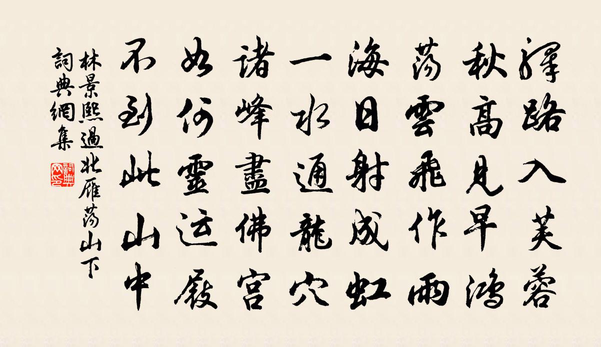 詩詞名句歷史字典書法欣賞書法字典國語詞典說文解字康熙字典古漢語字典標 題 作 者 詩 句 過北雁盪山下作者:林景熙 朝代:宋代過北雁盪山下原文驛路入芙蓉,秋高見早鴻。盪雲飛作雨,海日射成虹。一水通龍穴,諸峰盡佛宮。如何靈運屐,不到此山中。詩詞問答問:過北雁盪山下的作者是誰?答:林景熙問:過北雁盪山下寫於哪個朝代?答:宋代林景熙過北雁盪山下書法欣賞過北雁盪山下書法作品詩詞推薦句韋奇〔宋代〕撥灰煨芋子,帶溼爇松枝。竹窗釋紹曇〔宋代〕密葉節金點碧沙,月和梅影冷移來。香岩瓦礫徒拋擲,門鎖重陰擊不開。醜奴兒(餞鄭憲)張孝祥〔宋代〕寶蠟燒春夜影紅。梅花枝傍錦薰籠。曲瓊低卷瑞香風。萬里江山供燕几,一時賓主看談鋒。問君歸計莫匆匆。送青陽上人游越孟郊〔唐代〕秋風吹白髮,微官自蕭索。江僧何用嘆,溪縣饒寂寞。楚思物皆清,越山勝非薄。時看鏡中月,獨向衣上落。多謝聞子耕司戶兄非一日昨見墨帖於中州又誦五言趙蕃〔宋代〕墨妙初看眼自明,誦詩還見五言城。不惟喜獲吾黨士,要是未忘山谷盟。我亦可憐耽句癖,君其勉力振家聲。只今次韻游山雨中強至〔宋代〕飛飛煙雨惱春遊,幾許餘花水上流。獨有佳人折殘艷,歸來滿插鳳釵頭。蘭亭陸游〔宋代〕蘭亭絕境擅吾州,病起身閒得縱游。曲水流觴千古勝,小山叢桂一年秋。酒酣起舞風前袖,興盡回橈月下舟。江左故致政參政大資張公輓詞三首韓元吉〔宋代〕憶荷公車薦,多慚識面求。驚心異生死,倒指十春秋。國士懷青眼,門生慨白頭。束芻催老淚,東與大江流。渡湖徐集孫〔宋代〕漠漠西湖匝野煙,夕陽柳下買歸船。關心一紙平安報,雁字縱橫寫碧天。九日憶硯山舊居姚合〔唐代〕帝里閒人少,誰同把酒杯。硯山籬下菊,今日幾枝開。曉角驚眠起,秋風引病來。長年歸思切,更值雁聲催。朝中措 湖堤晚歸,望葛領諸山倒影水中,昔張翥〔元代〕梅花處處滿枝開。酒力盪吟懷。煙染藏鴉萬縷,東風扶起春來。幽禽啼樹,戲魚跳日,水碧如苔。若個仙翁畫得,廣平寺次孫子肅壁間韻趙蕃〔宋代〕野寺夙所歷,山程行苦賒。桂榮秋剩馥,蓬勃旱吹沙。徒倚俄成久,飛騰已向斜。異時如問隱,此地亦吾家。寓居二首其一東亭蘇轍〔宋代〕十口南遷粗有歸,一軒臨路閱賓士。市人不慣頻回首,坐客相諳便解頤。慚愧天涯善知識,增添城外小茅茨。華嚴朝中措沈端節〔宋代〕天遙野闊雁書空。山遠暮雲中。目斷江南煙雨,□□敧枕春風。功名富貴,何須計較,煙際疏鍾。解道淺妝濃抹,西湖三首周鍔〔宋代〕曉鏡初開淑景明,使君風味一般清。舟從菡萏林中過,人在鯨鯢背上行。妙舞屢翻紅藥燕,清詞時囀紫薇鶯。賡歌步虛陸游〔宋代〕微風吹碧海,細細生龍鱗,半醉騎一鶴,去謁青華君。歸來天風急,吹我過緱山,鏘然喔詩聲,清曉落人間。人間寒食上已雜吟八章程公許〔宋代〕碧桃花底小寒輕,綽約仙姿格外清。錦繡卷還春去了,藍橋風露放雲英。獨坐郡圃北齊宋庠〔宋代〕宿雨催秋物,清風卷歲華。殘蜩初去柳,寒蝶尚尋花。密篠留蒼霧,紅梨染落霞。城頭 * 子,日昃亂啼鴉。驚秋齊己〔唐代〕曉窗驚覺向秋風,萬里心凝淡盪中。池影碎翻紅菡萏,井聲乾落綠梧桐。破除閒事渾歸道,銷耗勞生旋逐空。妖殺虞美人(述古移南郡·般涉調)張先〔宋代〕恩如明月家家到。無處無清照。一帆秋色共雲遙。眼力不知人遠、上江橋。願君書札來雙鯉。古汴東流水。宋王臺名句推薦李白能詩復能酒,我今百杯復千首。唐寅《把酒對月歌》 日光下澈,影布石上,佁然不動;柳宗元《小石潭記》 祖宗疆土,當以死守,不可以尺寸與人。脫脫《宋史·列傳·卷一百一十七》 懷春情不斷,猶帶相思舊子。吳文英《丁香結·夷則商秋日海棠》 卷旗夜劫單于帳,亂斫胡兒缺寶刀。馬戴《出塞詞》 目不能兩視而明,耳不能兩聽而聰。荀子《荀子·勸學》 西湖春色歸,春水綠於染歐陽修《春日西湖寄謝法曹歌》 千磨萬擊還堅勁,任爾東西南北風。鄭燮《竹石》 傷心枕上三更雨,點滴霖霪。李清照《添字醜奴兒·窗前誰種芭蕉樹》 撩亂舞晴空,發人無限思。劉禹錫《柳花詞三首》