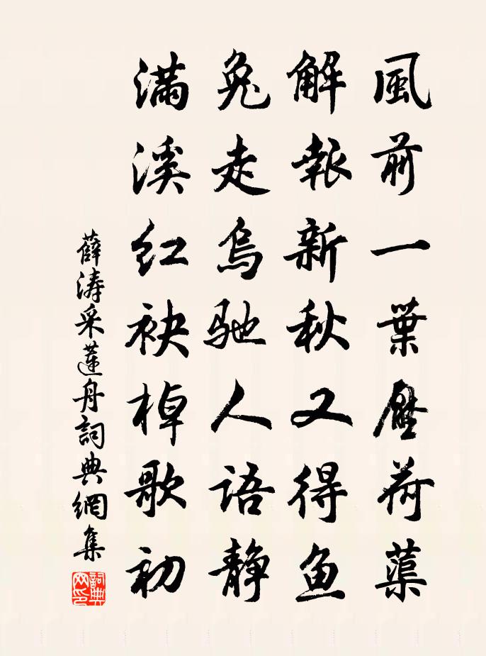 詩詞名句歷史字典書法欣賞書法字典國語詞典說文解字康熙字典古漢語字典標 題 作 者 詩 句 採蓮舟作者:薛濤 朝代:唐代採蓮舟原文風前一葉壓荷蕖,解報新秋又得魚。兔走烏馳人語靜,滿溪紅袂棹歌初。詩詞問答問:採蓮舟的作者是誰?答:薛濤問:採蓮舟寫於哪個朝代?答:唐代問:採蓮舟是什麼體裁?答:七絕薛濤採蓮舟書法欣賞採蓮舟書法作品注釋全唐詩詩詞推薦憶暢慶玉如四上人仇遠〔宋代〕臘中晴色久,霜月冷森森。可但思元度,惟應憶道林。三更難得曉,一片欲歸心。有約分苔石,南山蒼樹陰。畫菊與某官留別鄭燮〔清代〕進又無能追又難,宦途跼蹐不堪看。 吾家頗有東籬菊,歸去秋風耐歲寒。 和送牡丹韻劉過〔宋代〕娉娉嫋嫋洛陽花,合在瑤池阿母家。乞與老人渾不愛,白髯相對毿烏紗。元日二首呈永豐劉叔冶知縣戴復古〔宋代〕焚香拜元日,受歲客他州。白髮難遮老,新年諱說愁。無人能訪戴,有地足依劉。桃李爭春事,梅花笑未休。初秋憶湖上諸山釋永頤〔宋代〕山中夏日足幽娛,葛帔藤休誦寶書。白拂惹雲黏几案,清香緣竹上空虛。草堂夜月秋花近,水閣晨霞夕霓疏。遙憶浣溪沙向子諲〔宋代〕南國風煙深更深。清江相結是廬陵。甘棠兩地綠成陰。九日黃花兄弟會,中秋明月故人心。悲歡離合古猶今。盧山五詠 飲酒台蘇軾〔宋代〕博士雅好飲,空山誰與娛。莫向驪山去,君王不喜儒。水仙子佚名〔宋代〕晚節寒花猶帶蕊。隱映老人星瑞世。綠衣初是政成歸,真盛事。誰可比。那更新來孫又子。煙細金爐香旖旎。想像寄答李方叔陳師道〔宋代〕平生經世策,寄食不資身。孰使文章著,能辭轍跡頻。帝城分不入,書札詗何人。子未知吾懶,吾寧覺子貧。用子存韻寄乃兄雪香趙善括〔宋代〕要識居塵不染塵,小窗容膝近東鄰。香梢不老偏宜曉,瘦節常寒別是春。侑坐圖書情頗厚,對床風雨夢還新。擬將首尾吟邵雍〔宋代〕堯夫非是愛吟詩,詩是堯夫確論時。若以後時為失計,必將先手作知幾。三午賓客成何夢,百二山河付阿誰。弄巧即席陸游〔宋代〕稚荷出水榴花開,長苖圜鼙送舉杯。村鄰相樂君勿笑,要是安健無凶災。寄題義門胡氏華林書院王禹偁〔宋代〕水閣三齋架碧虛,亭亭華表映門閭。力田歲取千箱稻,好事家藏萬卷書。旋對杯盤燒野筍,別開池沼養溪魚。吾生秋興九首其一擬韓退之秦觀〔宋代〕逍遙北窗下,百事遠客慮。無端葉間蟬,催促時節去,愁起如亂絲,縈纏不如緒。日月豈得已,還復役朝暮。人生憩瑞安北湖詩三首林季仲〔宋代〕逕深松翠重,風軟馬蹄驕。水繞誰家屋,門飛小竹橋。龜開平野兆,蜂引斷山腰。生理吾能免,趨林拾墮樵。登浙江樓趙與滂〔宋代〕兩岸共明月,闌乾霄漢間。風波浙江水,砥柱海門山。晝夜潮消長,利名人往還,不如沙上鷺,玉立一身閒。送惠縣丞歸陽羨葉適〔宋代〕三嶺描成翠骨堆,一川罨畫繡徘徊。三年塵土無人識,山水虛閒與喚回。寄元均石介〔宋代〕君為儒者豈知兵,何事欣隨壁馬行。裴度樽前坐韓愈,趙成帳下立荀卿。御戎誰道全無策,對壘寧妨一下枰。須信千秋歲(四明趙制置、史開府勸鄉老眾賓酒)李淛〔宋代〕鄮峰凝瑞,鄞水浮佳氣。晴景轉,花光媚。碧幢森大纛,紅旆紛千騎。相遇處,滿城鶴髮群仙萃。綺席張高會。鼉紹興丁丑題烏石山雲盤山人〔宋代〕烏□□怪石,撐突倚山巔。□□群羊伏,昂昂萬馬聯。何年現蓬島,終古頌桑田。相揖閩王宅,東隅有九仙。名句推薦凡有血氣,皆有爭心左丘明《左傳·昭公·昭公十年》 君看六幅南朝事,老木寒雲滿故城。韋莊《金陵圖》 婿為燕國王,身被詔獄加。李白《秦女休行》 畢竟西湖六月中,風光不與四時同。楊萬里《曉出淨慈寺送林子方》 行人夜宿金陵渚,試聽沙邊有雁聲。李頎《送劉昱》 醉後涼風起,吹人舞袖回。李白《與夏十二登岳陽樓》 忽然一夜清香發,散作乾坤萬里春。王冕《白梅》 破帽遮顏過鬧市,漏船載酒泛中流。魯迅《自嘲》 久雨寒蟬少,空山落葉深。秘演《山中》 仙人琪樹白無色,王母桃花小不香。白居易《牡丹芳》