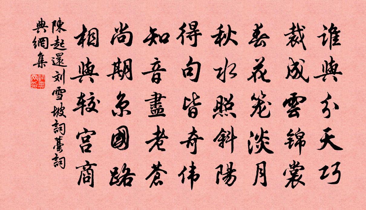 詩詞名句歷史字典書法欣賞書法字典國語詞典說文解字康熙字典古漢語字典標 題 作 者 詩 句 還劉雪坡詞藁作者:陳起 朝代:宋代還劉雪坡詞藁原文誰與分天巧,裁成雲錦裳。春花籠淡月,秋水照斜陽。得句皆奇偉,知音盡老蒼。尚期京國路,相與較宮商。詩詞問答問:還劉雪坡詞藁的作者是誰?答:陳起問:還劉雪坡詞藁寫於哪個朝代?答:宋代陳起還劉雪坡詞藁書法欣賞還劉雪坡詞藁書法作品詩詞推薦四月二十四日喜雨次振之韻蘇泂〔宋代〕朝來驟雨郁煩蒸,晚見疏星掛漢青。大點忽隨風信入,好聲先覺夢魂聽。春過種失農猶及,喜極詩成語未停。每恨送羅季能赴江陵幕李曾伯〔宋代〕留台雄峙渚宮邊,江漢中間別一天。號令半皆歸後務,規模幾不減中權。況從席上分鄒湛,細向樓頭訪仲宣。為報次韻李公擇以惠泉答章子厚新茶二首蘇轍〔宋代〕新詩態度靄春雲,肯把篇章妄與人。性似好茶常自養,交如泉水久彌親。睡濃正想羅聲發,食飽尤便粥面勻。底處秋夜宿淮口景池〔唐代〕露白草猶青,淮舟倚岸停。風帆幾處客,天地兩河星。樹靜禽眠草,沙寒鹿過汀。明朝誰結伴,直去泛滄溟。頌雲門九九八十一釋重顯〔宋代〕三三九九八十一,一一觀風隨召出。千古有誰同共知,一毛師子眾毛畢。歷代詩西周楊簡〔宋代〕后稷文王世幾傳,武王方得天下全。成康昭穆及共懿,孝夷之後厲兼宣。幽王見殺平王立,以上凡經四百年。再至直羅晁說之〔宋代〕百疊荒山人跡絕,飢腸寒色自徘徊。多情只有謝康樂,美酒樂歌寧再來。減字木蘭花尹志平〔元代〕安禪聚落。難免區區閒把捉。聚落安禪。佛祖常憂恐落緣。山林縱臥。無慮無思真快活。縱臥山林。一點靈光無物大醫禪師贊釋慧開〔宋代〕堅辭鳳闕紫泥詔,玷辱宗風個古錐。坐斷雙峰無寸草,愛松留得礙人枝。留衢州王彥博周欽止徐審知趙蕃〔宋代〕風前柳欲千尺,雨後梅才一斑。邂逅紛紛桃李,飄零在在溪山。二郎神長筌子〔元代〕離塵俗,便點檢林泉雅趣。竹杖芒鞋青箬笠,泛煙波、綠蓑柔櫓。月夜江天無盡樂,品短笛、瀟湘蓼渚。此訊息,鹿鳴宴貢士程公許〔宋代〕蜀莊故里好揚鄰,不盡斯文萬古存。漢詔十行銜彩鳳,禹門 * 躍潛鱗。傾心射策恩方渥,努力催堅語忌陳。一第梅角李龍高〔宋代〕朝暮相催鬢易星,酸風無奈送悲聲。丁寧莫過黃蘆塞,月落霜寒客半醒。偶成釋紹嵩〔宋代〕誰復知予懶是真,平生自信解甘貧。苦無名位高今世,為有煙霞伴此身。長掩柴荊避寒暑,猶將談風對風塵。只今少年游晁補之〔宋代〕當年攜手,是處成雙,無人不羨。自間阻、五年也,一夢擁、嬌嬌粉面。柳眉輕掃,杏腮微拂,依前雙靨。盛睡里擬陶馮坦〔宋代〕茅檐人幽徑,風雨聊可棲。喜無車馬喧,而有耒耜隨。緣識宋太宗〔宋代〕遙觀極自望雲頭,碧海波澄瑞日浮。霞彩連天長不斷,須憑仙子敘蹤由。晚日晁說之〔宋代〕晚日勸我行,我欲留晚日。長途行不近,仆馬有倦色。人生為客多,誰解老一室。果有桃源人,應遭渠笑叱。偶書宋祁〔宋代〕病骨岩岩怯早衰,月枝三繞寄身危。避風寧望鶢鶋享,出卜頻遭僂句欺。煙糝蔽江懷隱伴,雨苗頹壟負耕期。開年禪人並化主寫真求贊釋正覺〔宋代〕發白齒豁,鼻垂口闊。坐冷月依依,氣清秋漠漠。離微出入門開,正偏往來機活。雙碧耆婆眼有神,分明百草頭邊名句推薦故父母、學、君三者,莫可以為治法。墨子《墨子·04章 法儀》 忘身辭鳳闕,報國取龍庭。王維《送趙都督赴代州得青字》 兵出無名,事故不成班固《漢書·紀·高帝紀上》 春風桃李花開日,秋雨梧桐葉落時。白居易《長恨歌》 桑之未落,其葉沃若。佚名《氓》 論至德者不和於俗,成大功者不謀於眾。司馬遷《史記·趙世家》 夫兩貴之不能相事,兩賤之不能相使,是天數也。荀子《荀子·王制》 養不教,父之過。教不嚴,師之惰。王應麟《三字經·全文》 白骨如山忘姓氏,無非公子與紅妝。曹雪芹《紅樓夢·第八回》 綺席象床寒玉枕,美人何處醉黃花。汪元量《望江南·幽州九日》