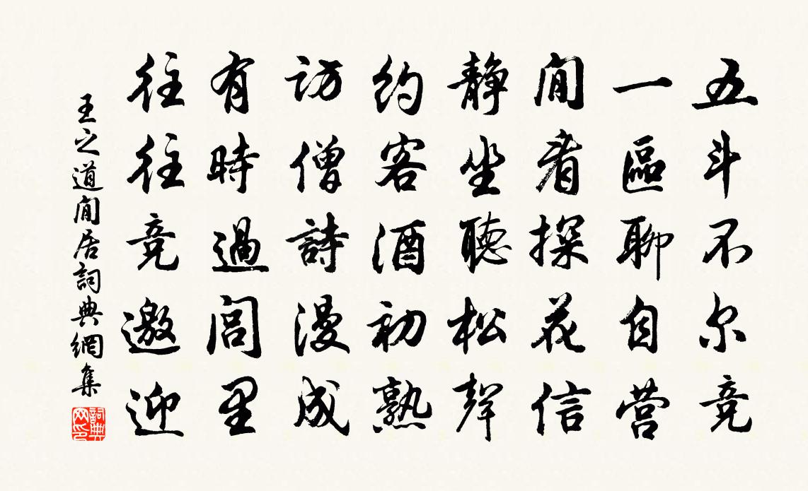 詩詞名句歷史字典書法欣賞書法字典國語詞典說文解字康熙字典古漢語字典標 題 作 者 詩 句 閒居作者:王之道 朝代:宋代閒居原文五斗不爾競,一區聊自營。閒看探花信,靜坐聽松聲。約客酒初熟,訪僧詩漫成。有時過閭里,往往競邀迎。詩詞問答問:閒居的作者是誰?答:王之道問:閒居寫於哪個朝代?答:宋代王之道閒居書法欣賞閒居書法作品詩詞推薦與伯雨登溪山勝概樓倪瓚〔元代〕樓下清溪夏亦寒,溪頭個個白鷗閒。風回綠卷平堤水,林缺青分隔岸山。若士振衣千仞表,何人泛宅五湖間。絕憐守歲李治〔唐代〕今宵冬律盡,來朝麗景新。花余凝地雪,條含暖吹分。綬吐芽猶嫩,冰□已鏤津。薄紅梅色冷,淺綠柳輕春。送迎扈駕西山納蘭性德〔清代〕鳳翥龍蟠勢作環,浮青不斷太行山。九重殿閣蔥蘢里,一氣風雲吐納間。熊虎自當馳道伏,蛟螭長棒御書閒。黃圖哭歐公孤山僧惠思示小詩次韻蘇軾〔宋代〕故人已為土,衰鬢亦驚秋。猶喜孤山下,相逢說舊遊。木芙蓉李石〔宋代〕榮枯一氣內,造化本自公。春花與秋蔕,孰雲有不同。試看木芙蕖,雨露滋芳叢。嫣然生百巧,秀色傾房櫳。婢子牡丹和潘養大韻陳傅良〔宋代〕看花喜極翻愁人,京洛久矣為胡塵。還知姚魏輩何在,但有歐蔡名不泯。夕陽為我作初霽,佳節過此無多春。更燒紹興祈谷三首佚名〔宋代〕三陽筆新,萬物資始。精誠祈天,其聽斯邇。顧均雨晴,田疇之喜。如坻如京,以人百禮。雲夢故城秋望戎昱〔唐代〕故國遺墟在,登臨想舊遊。一朝人事變,千載水空流。夢渚鴻聲晚,荊門樹色秋。片雲凝不散,遙掛望鄉愁。搗衣詩謝惠連〔南北朝〕衡紀無淹度。晷運倏如催。白露滋園菊。秋風落庭槐。肅肅莎雞羽。烈烈寒螿啼。夕陰結空幕。宵月皓中閨。美人出真陽峽十首楊萬里〔宋代〕峽嶺分明是假山,亂堆怪石入雲間。上頭更種青瓊樹,下照春江玉鏡寒。楊柳枝方岳〔宋代〕小橋風定綠煙垂,幾送行人此別離。蹀躞玉驄嘶草去,啼鶯寂螢雨千絲。自興國往筠宿石田驛南二十五里野人舍蘇軾〔宋代〕溪上青山三百疊,快馬輕衫來一抹。倚山修竹有人家,橫道清泉知我渴。芒鞋竹杖自輕軟,蒲薦松床亦香滑。夜深鷓鴣天(杜四侍郎郡君十二姑生日)晁補之〔宋代〕吉夢靈蛇朱夏宜。佳辰阿母會瑤池。竹風荷雨來消暑,玉李冰瓜可療肌。心悟了,道成時。不勞龍女騁威儀。僧祗送張狀元監丞通理陝郊先覲親蜀道宋祁〔宋代〕苑樹櫻殘罷宴甌,驪駒籍籍望西州。左思麗賦都中貴,張載新銘劍外留。幾日戲裳貪潔膳,即時歸雨勸耕疇。如何西歸七首次韻和泗州十五叔父三晁補之〔宋代〕暮投古店宿,夜聞狐狸嗥,僕夫告行邁,起視月尚高,清霜來何許,不覺滿我袍,逆舍良非時,求前茲已勞,璧月堂/小重山賀鑄〔宋代〕夢草池南璧月堂。綠陰深蔽日,囀鸝黃。淡蛾輕鬢似宜妝。歌扇小,煙雨畫瀟湘。薄晚具蘭湯。雪肌英粉膩,更生點絳唇陸文圭〔元代〕笑靨多羞,低頭不覺金釵溜。憑媒將就。鳳枕回雙繡。月地雲階,何日重攜手。心堅否。齊眉相守。願得從今後。獻襄陽於大夫孟郊〔唐代〕襄陽青山郭,漢江白銅堤。謝公領茲郡,山水無塵泥。鐵馬萬霜雪,絳旗千虹霓。風漪參差泛,石板重疊躋。舊淚送友封元稹〔唐代〕輕風略略柳欣欣,晴色空濛遠似塵。斗柄未回猶帶閏,江痕潛上已生春。蘭成宅里尋枯樹,宋玉亭前別故人。心斷寄林子方陳俊卿〔宋代〕雙闕門高襲慶余,相望再世擁軺車。清名益重先君子,遠俗爭看行秘書。醫國十全姑小試,蠹民五瘴想先除。炎州名句推薦翻被梨花冷看,人生苦戀天涯。張炎《朝中措·清明時節》 摩頂放踵利天下,為之。孟子《孟子·盡心章句上·第二十六節》 遊子乍聞征袖濕,佳人才唱翠眉低。鄭谷《鷓鴣》 採蓮南塘秋,蓮花過人頭。佚名《西洲曲》 或理在方寸而求之域表,或義在咫尺而思隔山河。劉勰《文心雕龍·神思》 雲山萬重兮歸路遐,疾風千里兮揚塵沙。蔡文姬《胡笳十八拍》 秋來愁更深,黛拂雙蛾淺楊無咎《生查子·秋來愁更深》 天明登前途,獨與老翁別。杜甫《石壕吏》 入則無法家拂士,出則無敵國外患者,國恆亡。孟子及其弟子《生於憂患,死於安樂》 繞遍迴廊還獨坐。月籠雲暗重門鎖。蘇軾《蝶戀花·雨霰疏疏經潑火》