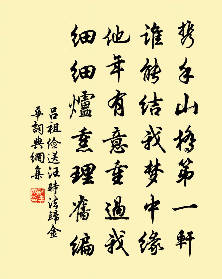 詩詞名句歷史字典書法欣賞書法字典國語詞典說文解字康熙字典古漢語字典標 題 作 者 詩 句 送汪時法歸金華作者:呂祖儉 朝代:宋代送汪時法歸金華原文攜手山橋第一軒,誰能結我夢中緣。他年有意重過我,細細爐熏理舊編。詩詞問答問:送汪時法歸金華的作者是誰?答:呂祖儉問:送汪時法歸金華寫於哪個朝代?答:宋代呂祖儉送汪時法歸金華書法欣賞送汪時法歸金華書法作品詩詞推薦李粹伯挽章二首陳造〔宋代〕病酒漳濱久,傳聞信復疑。為郎真地下,哭友漫天涯。雨紼何由挽,風松想助悲。自今思有道,時展蔡邕碑。記小圃花果二十首劉克莊〔宋代〕雨惱顰西子,晴扶睡貴妃。老夫方入定,為爾一撩詩。秋興陸游〔宋代〕樵客高僧兩斷蓬,偶同煙搒泛秋風。棲賢雪夜匆匆別,豈意相逢在剡中。十月十九日小酌分韻得里字方回〔宋代〕奠國荷隆棟,扶世納夷軌。勛。勛庸書盟府,名氏垂信史。畫餅既無成,墜甑亦云已。幽喔陶倦情,閒讀探玄理。和游歸來園韻廖行之〔宋代〕咄咄紫桑久卜鄰,軒軒少室竟何人。一丘奇興心猶遠,千古論交跡未陳。奮鍤自隨天地闊,園林好在歲時新。東風無題三首陳造〔宋代〕酒鴟車後無何飲,易卷床頭脫復看。豈謂浮生須此具,世紛方解不相干。六月喜雨三首楊萬里〔宋代〕玄雲直下素光開,雨到前山只恐回。霹靂一聲風一陣,為儂催上半天來。再作項安世〔宋代〕遇物無汙潔,經林失盛衰。坐令磚似玉,立見發如肌。鳥化瑤池鶴,騅成石闕獅。傾都陳鷺翿,連野獵麑皮。山裹訪開公不遇鬍子期〔宋代〕獨步小庵清,憑軒數小星。霜華連野白,山色滿門青。風定松猶響,香銷室自馨。孤云何處宿,案上掩蓮經。雜興鄭剛中〔宋代〕不似張蒼作瓠肥,衰顏折發就昏痴。近來終日扃柴戶,靜盾微風過竹枝。櫻桃煎楊萬里〔宋代〕含桃丹更圜,輕質觸必碎。外看千粒珠,中藏半泓水。何人弄好手?萬顆搗虛脆。印成花鈿薄,染作水澌紫。北果東武吟 ( 一作出東門後書懷留別翰林諸公 )李白〔唐代〕好古笑流俗,素聞賢達風。方希佐明主,長揖辭成功。白日在高天,回光燭微躬。恭承鳳凰詔,欻起雲蘿中。清切與榮西釋懷敞〔宋代〕不露鋒芒意已彰,揚眉早墮識情鄉。著衣吃飯自成現,打瓦鑽龜空著忙。若信師姑元女子,無疑日本即南唐。一天和裴仲謨摘白須行秦觀〔宋代〕仲將題凌雲,比訖顟盡白。陸展媚側室,星星染為黑。人生如寄耳,況復形與色。澤壑藏山舟,夜半輸有力。厖眉郭熙秋山平遠用東坡韻樓鑰〔宋代〕槐花忙過花舉子閒,花舊遊憶在花夷門山花。玉堂會見郭熙畫,拂拭縑素塵埃間。楚天極目江天遠,楓林渡頭秋思依韻四和正仲梅堯臣〔宋代〕四和還如九酘醅,更醇更美未嫌來。相逢莫作兩般眼,一飲不辭三百杯。嵇阮當時無俗慮,山王雖貴亦能陪。如今庚戍歲旦次張以道韻張鎡〔宋代〕農定正旦喜占晴,老圃觀風趁早春。兩事欲尋強健日,一生常作太平民。紹熙初歲新開歷,典凹崇儀極奉親。詞拙益壽美金花侯善淵〔元代〕默然內守。混里傾陽無中有。有里何如。獨體圓通照海珠。神清氣秀。游奕丹天明如晝。上下無拘。密布靈華滿太寒夜蘇籀〔宋代〕鐵檠知漏永,熠燿照蚍蜉。三策遺當世,一封陳厥謨。甫田須疾耒,巨浸想乘桴。應猝誠乖用,何名道不誣。上陌梯寺懷舊僧二首司空圖〔唐代〕雲根禪客居,皆說舊無廬。松日明金像,山風向木魚。依棲應不阻,名利本來疏。縱有人相問,林間懶拆書。高鴉名句推薦南陵水面漫悠悠,風緊雲輕欲變秋。杜牧《南陵道中 / 寄遠》 天生我材必有用,千金散盡還復來。李白《將進酒》 上所用者,奸亦為忠;上所棄者,忠亦為奸。來俊臣《羅織經·察奸卷第八》 萬里平湖秋色冷,星辰垂影參然。牛希濟《臨江仙·洞庭波浪颭晴天》 獨寫菖蒲竹葉杯,蓬城芳草踏初回。湯顯祖《午日處州禁競渡》 傷心庾開府,老作北朝臣。司空曙《金陵懷古》 楚人悲屈原,千載意未歇。蘇軾《屈原塔》 莫遣只輪歸海窟,仍留一箭射天山。李益《塞下曲》 利之中取大,害之中取小。墨子《墨子·44章 大取》 爭奈愁來,一日卻為長賀鑄《行路難·縛虎手》