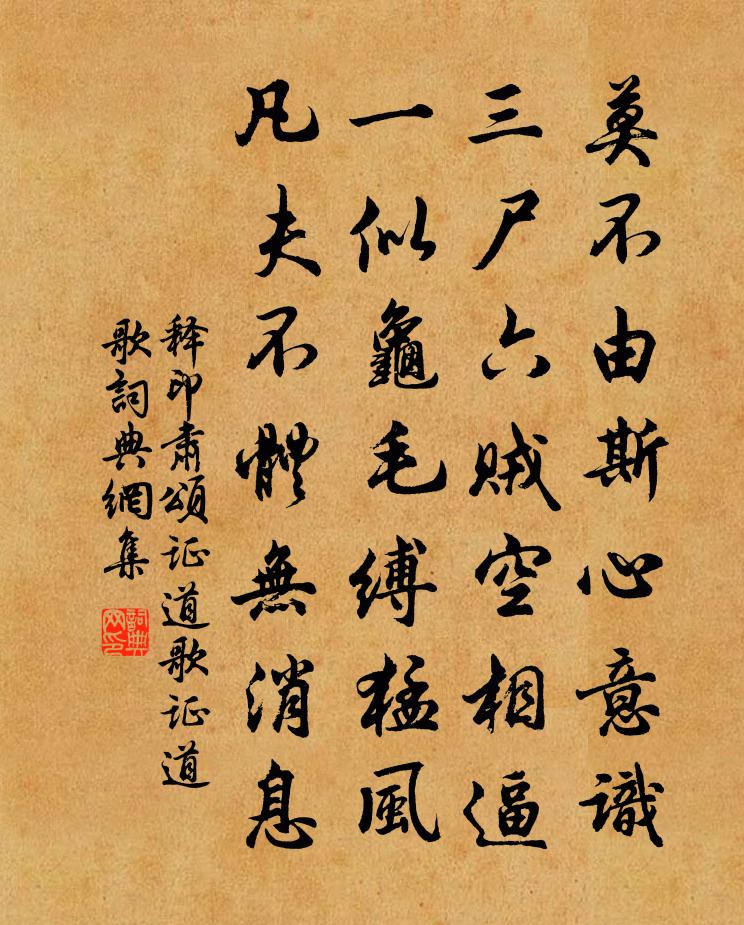 詩詞名句歷史字典書法欣賞書法字典國語詞典說文解字康熙字典古漢語字典標 題 作 者 詩 句 頌證道歌證道歌作者:釋印肅 朝代:宋代頌證道歌證道歌原文莫不由斯心意識,三屍六賊空相逼。一似龜毛縛猛風,凡夫不體無訊息。詩詞問答問:頌證道歌證道歌的作者是誰?答:釋印肅問:頌證道歌證道歌寫於哪個朝代?答:宋代釋印肅頌證道歌證道歌書法欣賞頌證道歌證道歌書法作品詩詞推薦好事近朱敦儒〔宋代〕深住小溪春,好在柳枝桃葉。風澹水軒人靜,數雙飛胡蝶。日長時有一鶯啼,蘭佩為誰結。銷散舊愁新恨,泛琴心感皇恩·一個小園兒朱敦儒〔宋代〕一個小園兒,兩三畝地。花竹隨宜旋裝綴。槿籬茅舍,便有山家風味。等閒池上飲,林間醉。都為自家,胸中無事秋日遣興孫應時〔宋代〕學書成癖故童心,頗復抱然得趣深。一字千金亦安用,等間容我度光陰。滄洲白鷺軒五首汪炎昶〔宋代〕荷葉蒲寒煙漠漠,牙花洲晚雨疏疏。雖然亦有魚暇志,難把虛鶿比羔渠。自題肖像釋景元〔宋代〕生平只說聱頭禪,撞著聱頭如鐵壁。脫卻羅籠截腳跟,大地撮來墨漆黑。晚年轉復沒刀刀,奮金剛杵碎窠窟。他時贈詹道人劉子翬〔宋代〕道人山北住,鄉曲舊知名。語妙初疑簡,神藏久益清。夜衾寒楮白,歸舄兩鳧輕。心靜皆仙境,何勞款玉京。李文饒一首劉克莊〔宋代〕畫取維州如槁葉,策禽潞將似嬰兒。九原精爽人猶畏,想見中書秉筆時。淳熙八年春帖子詞太上皇帝合六首崔敦詩〔宋代〕翠管吹寒去,青旗卷仗來。慈皇千萬壽,春日上春杯。訪人不遇汪炎昶〔宋代〕寥寥空谷噓紫霞,誰知有此幽人家。洞門深鎖蒼蘚滑,風藤簌簌吹殘花。湘寇曾鞏〔宋代〕衡湘有寇未誅剪,殺氣凜凜圍江潯。北兵居南匪便習,若以大舶乘高岑。傖人操兵快如鶻,千百其旅巢深林。超突大望州范成大〔宋代〕望州山頭天四低,東瞰夷陵西秭歸。峽江微茫細如帶,江外千峰青打圍。黃牛廟磯石如劈,想看驚湍虎鬚白。水行書韓生壁李新〔宋代〕欲為洛中英,竟成秦地鬼。音書雲雁絕,故園四千里。望歸今不歸,愁滿西江水。伊川道中李復〔宋代〕溪流水盡搖日光,夾岸弱柳千縷長。野鳥深藏但聞語,山花半開初有香。今朝伊川首西路,昔年潏水過南塘。安得瑞鶴仙佚名〔宋代〕五雲翔碧漢。望卿月光中,老人星現。黃堂盛華宴。慶君恩、許奉安輿游衍。鹿城壯觀。幸王母、人間得見。望君題搨本姜楚公鷹陸游〔宋代〕弓面霜寒鬥力增,坐思鐵馬蹴河冰。海東俊鶻何由得,空看綿州舊畫鷹。次韻秦觀梅花蘇轍〔宋代〕病夫毛骨日凋槁,愁見米鹽惟醉倒。忽傳騷客賦寒梅,感物傷春同懊惱。江邊不識朔風勁,牆頭亦有南枝早。未開瞿秘校新授官還南豐曾鞏〔宋代〕柳色映馳道,水聲通御溝。雖喜芳物盛,未同故人游。叩門忽去我,躍馬振輕裘。佩印自茲始,過家當少留。中園師繹題宮姊夫惠示湖莊佳句輒次韻曹彥約〔宋代〕願學言詩賜,降心識字雄。絕塵嗟莫及,雅趣喜相同。任性天憐老,貪閒鬼笑窮。可堪香火分,誤入武陵中。答簡夫孫應時〔宋代〕不怪年來萬事非,聊須把酒賦新詩。乾坤正自無今昔,草木何妨有變衰。白髮我甘投老去,紅顏君惜臥春時。古人永遇樂(甲午走筆和岳大用梅詞韻)趙師俠〔宋代〕秋滿衡皋,淡雲籠月,晚來風勁。一抹殘霞,數聲過雁,遠是黃昏近。憑高臨遠,倚樓凝睇,多少斷愁幽興。聽漁名句推薦萬物並育而不相害。道並行而不相悖。小德川流;大德敦化。子思《中庸·第三十章》 獨出前門望野田,月明蕎麥花如雪。白居易《村夜》 東船西舫悄無言,唯見江心秋月白。白居易《琵琶行 / 琵琶引》 採桑秦氏女,織錦竇家妻。薛道衡《昔昔鹽》 攻取者先兵權,建本者尚德化。陳壽《三國志·魏書·荀彧攸賈詡傳》 到家應是,童稚牽衣,笑我華顛。吳激《訴衷情·夜寒茅店不成眠》 霜風搗盡千林葉,閒倚筇枝數鸛巢。范成大《冬日田園雜興》 溪深古雪在,石斷寒泉流。李白《尋高鳳石門山中元丹丘》 不力行,但學文。長浮華,成何人。李毓秀《弟子規·餘力學文》 自與東君作別,剗地無聊。納蘭性德《風流子·秋郊即事》