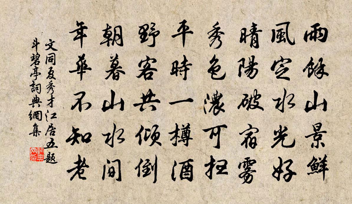 詩詞名句歷史字典書法欣賞書法字典國語詞典說文解字康熙字典古漢語字典標 題 作 者 詩 句 夏秀才江居五題斗碧亭作者:文同 朝代:宋代夏秀才江居五題斗碧亭原文雨余山景鮮,風定水光好。晴陽破宿霧,秀色濃可掃。平時一樽酒,野客共傾倒。朝暮山水間,年華不知老。詩詞問答問:夏秀才江居五題斗碧亭的作者是誰?答:文同問:夏秀才江居五題斗碧亭寫於哪個朝代?答:宋代文同夏秀才江居五題斗碧亭書法欣賞夏秀才江居五題斗碧亭書法作品詩詞推薦和高平朱(一作米)參軍思歸作韓翃〔唐代〕髯參軍,髯參軍,身為北州吏,心寄東山雲。坐見萋萋芳草綠。遙思往日晴江曲。刺船頻向剡中回,捧被曾過越人題橫江館杜牧〔唐代〕孫家兄弟晉龍驤,馳騁功名業帝王。至竟江山誰是主?苔磯空屬釣魚郎。再游吳寺釋雲岫〔宋代〕南流吳家三冢寺,老僧死盡樹重栽。繞廊行問無相識,認得冥真是舊齊。魯望示廣文先生吳門二章情格高散可醒俗態…魯望之命也皮日休〔唐代〕我見先生道,休思鄭廣文。鶴翻希作伴,鷗卻覓為群。逸好冠清月,高宜著白雲。朝廷未無事,爭任醉醺醺。能諳溪上張蘊〔宋代〕今夕知何夕,吾意亦良適。明月滿船蓬,清風動帷席。過雨前溪渾,停雲半空白。衰荷無嬌紅,老梧有枯碧。頻更次韻李大著春日雜詩十首喻良能〔宋代〕素髮已垂領,故園猶未歸。鳥聲思磴道,柳色憶荊扉。嫩綠枝邊暗,殘紅葉底稀。幾多新乳燕,一一出巢飛。依韻和原甫早赴紫宸朝待旦假寐梅堯臣〔宋代〕月落西樓露氣寒,大明將謁望清班。燭房猶照衣冠上,漏舍欲為魚鳥間。入仗采旗開日月,在庭金袞儼雲山。我慚雜記六言五首劉克莊〔宋代〕上界尤多官府,丹成不必飛沖。回仙一歲一度,來聽蓬萊松風。悼玉溪張九成〔宋代〕長年聞老病,終日擁柴門。冷落田文飯,淒涼北海樽。功名看似夢,術業付諸孫。慷慨臨終語,精誠徹九閽。高宗建炎初祀昊天上帝佚名〔宋代〕[姑洗為羽一奏]惟天為大,物始攸資。恭承祠祀,以報以祈。神不可度,日監在茲。有聲明德,庶其格思。次韻石湖居士瓶中早梅二首陳造〔宋代〕詩翁靜三昧,筇杖壁間橫。小合自清絕,幽芳從瘦生。巧當窗影見,時映燭花明。底用尋春去,沖寒踏月行。發中橋二首楊萬里〔宋代〕新雨豐今歲,初晴屏積陰。猛收千疋練,微露一棱金。天熨粉青嫩,山描愁黛深。誰言殘剩暑,卓午不相尋。鵯鵊詞歐陽修〔宋代〕龍樓鳳闕郁崢嶸,榮宮不聞更漏聲。紅紗蠟燭愁夜短,綠窗鵯鵊催天明。一聲兩聲人漸起,金井轆轤聞汲水。三聲醜奴兒(慶鄧彥鱗生子)廖行之〔宋代〕一春底事多佳氣,非霧非雲。鬱郁氳氳。端為君家誕阿興。慶源袞袞由高密,福有多根。百子千孫。此是元侯嫡耳偈頌二百零五首釋正覺〔宋代〕一色是須轉,大功不我居,珠走碧盤盤走珠。直下滄溟取明月,吾家自有崑崙。天宇豁空雲卷雨,溪容澄澈水懷秋感舊詩蘇軾〔宋代〕床頭枕馳道,雙闕夜未央。車轂鳴枕中,客夢安得長。新秋入梧葉,風雨驚洞房。獨行殘月影,悵焉感初涼。筮仕和顏長官百詠貧女朱繼芳〔宋代〕洗盡銅華淨潔貧,嫁衣莫說為他人。絕憐父母窮相守,不為金多賤卻身。送薛秀才歸鄉余靖〔宋代〕半歲接高論,一朝歸故關。道存慙設醴,別易忍登山。進即龜龍瑞,退當江海閒。無為牽俗趣,碌碌利名間。耕堂雜興蘇濱〔宋代〕背鄉不過五十日,世事如雲逐段移。客里念家家念客,歸來一似未午地。和寇十一雨後登樓陳師道〔宋代〕秀嶺歸雲里,華譙夕照中。登臨終不數,吟笑近多同。麥秀知春力,人和驗歲豐。預為逃暑約,一快楚颱風。名句推薦春思遠,誰嘆賞、國香風味。周密《繡鸞鳳花犯·賦水仙》 窗外日光彈指過,席間花影坐前移。施耐庵《水滸傳·第二回》 傷心莫語,記那日旗亭,水嬉散盡,中酒阻風去。納蘭性德《摸魚兒·午日雨眺》 眼裡無點灰塵,方可讀書千卷;胸中沒些渣滓,才能處世一番。陳繼儒《小窗幽記·集靈篇》 我家洗硯池邊樹,朵朵花開淡墨痕。王冕《墨梅》 或飲食,或坐走。長者先,幼者後。李毓秀《弟子規·出則弟》 冬夜夜寒覺夜長,沉吟久坐坐北堂。李白《夜坐吟》 醉翁之意不在酒,在乎山水之間也。歐陽修《醉翁亭記》 畫圖省識春風面,環珮空歸夜月魂。杜甫《詠懷古蹟五首·其三》 山驛淒涼,燈昏人獨寢。陸游《清商怨·葭萌驛作》