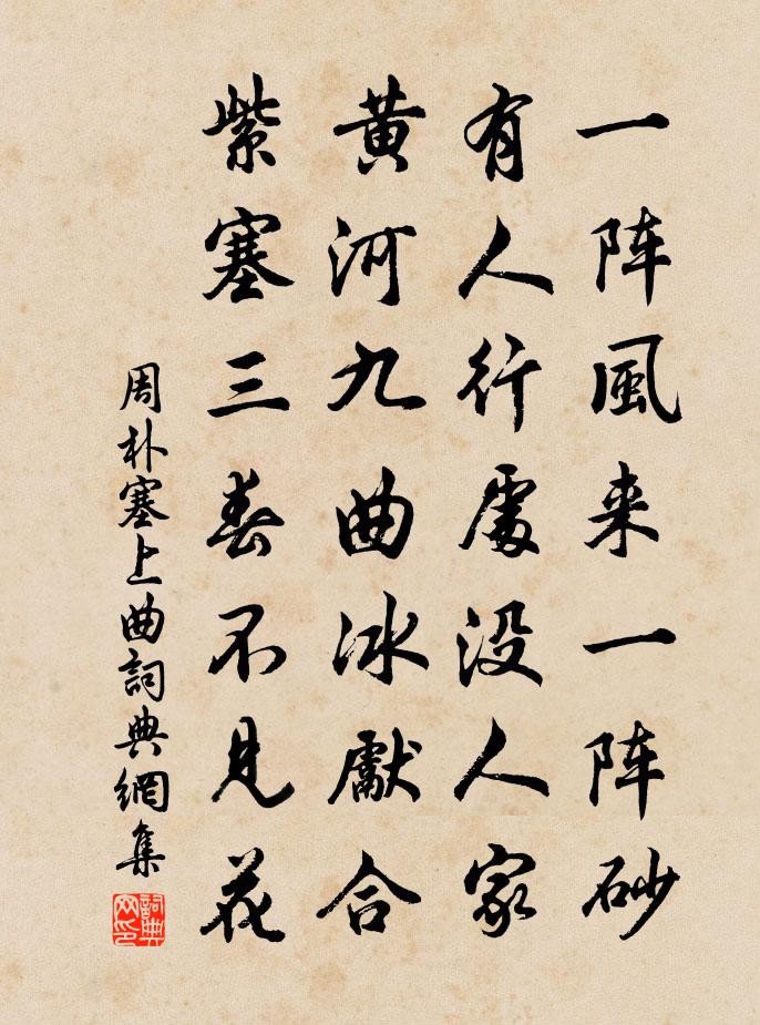 詩詞名句歷史字典書法欣賞書法字典國語詞典說文解字康熙字典古漢語字典標 題 作 者 詩 句 塞上曲作者:周朴 朝代:唐代塞上曲原文一陣風來一陣砂,有人行處沒人家。黃河九曲冰先合,紫塞三春不見花。詩詞問答問:塞上曲的作者是誰?答:周朴問:塞上曲寫於哪個朝代?答:唐代問:塞上曲是什麼體裁?答:七絕周朴塞上曲書法欣賞塞上曲書法作品注釋全唐詩:卷673_39詩詞推薦夏日游慈恩寺劉得仁〔唐代〕何處消長日,慈恩精舍頻。僧高容野客,樹密絕囂塵。閒上凌虛塔,相逢避暑人。卻愁歸去路,馬跡並車輪。梅花已過聞東村一樹盛開特往尋之慨然有感陸游〔宋代〕春晚城南十里陂,亭亭獨立見奇姿。品流不落松竹後,懷抱惟應風月知。旋拂亂雲成小佇,重攜芳榼卜幽期。佳人次亞愚韻王諶〔宋代〕絲絲楊柳拂輕煙,那惜床頭買酒錢。此段風流如不賞,一般佳致又明年。次韻道輔雙嶺見寄三疊黃庭堅〔宋代〕蓮塘倒箭靫,桂影涼霜兔。平生知音地,地下無尺素。十夜九作夢,虜乘驚沙度。時不與我謀,征西枕戈去。至啟伏蒙台慈以南至之後見寄佳篇豈曰奉酬輒李至〔宋代〕流年冉冉不曾停,合向勞生養道情。萬物已憐成復象,一陽還見動勾萌。南躔日轉階前影,北陸風吹枝杪聲。看即芝秀軒詞四首楊維楨〔元代〕芝秀兮煌煌,羅生兮滿堂。紫雲煙囷兮如蓋,露湛湛兮沐芳。美美夫人兮賢姱,集靈瑞兮未類。芝何為兮為秀,匪戊子新元老人七十有詩自述敬和洪咨夔〔宋代〕松鶴昂昂省見稀,獨游汗漫友佺期。光風霽日安排好,秀水佳水鬥飣奇。嘉慶圖中身最貴,耆英會上爵猶卑。縱心治圃韓維〔宋代〕久雨地氣泄,百草日以滋。勃然翳我圃,積茀不可治。遂信蕭艾質,唐突蘭蕙姿。鴻鵠不肯下,跳蛙恃而嘻。長林挽趙子固左司孫應時〔宋代〕只道功名晚,居然穹數蕃。偏令淮楚地,屢睹鉞旄尊。身隔公卿議,民私父母恩。東關往來處,腸斷不堪論。和表之清陰亭作李彌遜〔宋代〕西山朝來多爽氣,露沐風梳發新翠。泄雲無力占山腰,初日分光上山背。遠山蒼茫近山紫,四面鐘魚談佛事,人間烏夜啼(八之三)陸游〔宋代〕我校丹台玉字,君書蕊殿雲篇。錦官城裡重相遇,心事兩依然。攜酒何妨處處,尋梅共約年年。細思上界多官府,十二月旦雪霰大縶張嵲〔宋代〕憶昔尋梅漢水旁,故乘微霰渡澄江。如今飄泊閩山側,擁褐安禪聽打窗。上竺柏庭月法師畫像贊釋智遇〔宋代〕厚重如山,寬大如海。丹青有神,莫擬其蹤。僧繇筆妙,雖狀共跡。如上國這春歸,香風四吹。如銀蟾之出水,萬江神子(金山會飲)韓元吉〔宋代〕金銀樓閣認蓬萊。曉煙開。上崔嵬。風引孤帆,誰道卻船回。鵬翼倚天鰲背穩,驚浪起,雪成堆。翩翩黃鶴為誰來閉合陸游〔宋代〕閉合孤城剩放慵,桐江清絕勝吳松。雲收忽見北山雪,月落正聞西寺鐘。世味老來無奈薄,土思病後不勝濃。蓴羹禮殿李石〔宋代〕雨老苔荒墨色昏,漢人兩序姓名存。六經絲竹升堂後,千古衣冠此地尊。但使高文無廢祀,只今揚馬未招魂。寥寥簡史子由主簿釋寶曇〔宋代〕曉行雲海意蒼茫,畫入王維鴻雁行。煙樹屏山分遠近,風帆沙鳥認微芒。筆端應有鮫人淚,句法仍搜墨客腸。日暮題虎邱顧逢〔宋代〕此山雖小眾山尊,半近吳城半近村。一壑風煙龍窟宅,滿堂巾盔佛兒孫。生公說法台空在,陸羽煎茶井不存。喚起得友人俞玉汝書雲客游建業月嘗能致錢十萬時趙蕃〔宋代〕士有孟東野,薦乃乾退之。五十才一尉,俸錢仍半支。嗟予亦蹇者,白髮方糟醨。因聲謝吾友,十萬亦多為。宋江三十六贊龔開〔宋代〕昔樊將軍,鴻門直撞。斗酒肉肩,其言甚壯。名句推薦滿川風雨獨憑欄,綰結湘娥十二鬟。黃庭堅《雨中登岳陽樓望君山》 日出江花紅勝火,春來江水綠如藍。白居易《憶江南·江南好》 黃鶴樓前日欲低,漢陽城樹亂烏啼李夢陽《夏口夜泊別友人》 花時同醉破春愁,醉折花枝作酒籌。白居易《同李十一醉憶元九》 吏呼一何怒,婦啼一何苦。杜甫《石壕吏》 佇久河橋欲去,斜陽淚滿。吳文英《三姝媚·過都城舊居有感》 明日巴陵道,秋山又幾重。李益《喜見外弟又言別》 旅客三秋至,層城四望開。杜審言《登襄陽城》 好風憑藉力,送我上青雲。曹雪芹《臨江仙·柳絮》 寒眼亂空闊,客意不勝秋。楊炎正《水調歌頭·登多景樓》