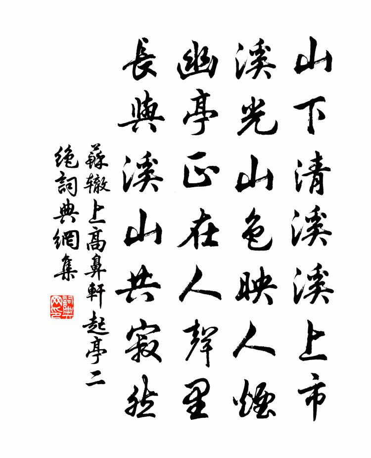 詩詞名句歷史字典書法欣賞書法字典國語詞典說文解字康熙字典古漢語字典標 題 作 者 詩 句 上高鼻軒起亭二絕作者:蘇轍 朝代:宋代上高鼻軒起亭二絕原文山下清溪溪上市,溪光山色映人煙。幽亭正在人聲里,長與溪山共寂然。詩詞問答問:上高鼻軒起亭二絕的作者是誰?答:蘇轍問:上高鼻軒起亭二絕寫於哪個朝代?答:宋代問:蘇轍的名句有哪些?答:蘇轍名句大全蘇轍上高鼻軒起亭二絕書法欣賞上高鼻軒起亭二絕書法作品詩詞推薦送程給事知越州韓鐸〔宋代〕青瑣身榮故國遙,除書催下紫宸朝。金籯舊學辭仙殿,玉帳新兵擁使橈。閣上雲山圍畫壁,軍中鼓角戰江潮。珠璣頌古四十八首釋慧開〔宋代〕描不成兮畫不就,贊不及佤休生受。本來面目沒處藏,世界壞時渠不朽。宿玉龍宮周承勛〔宋代〕夜爇松脂火,朝焚柏子香。舉家來萬壽,佳節遇重陽。雨止雲穿日,風高天欲霜。吾廬籬下菊,應怪未還鄉。南柯子劉志淵〔元代〕體若虛空淨,心如泰華安。萬緣妄想不相干。正住無思,觸處得安閒。覺海神珠瑩,禪天性月寒。圓明不昧顯**句王琪〔宋代〕誰將水調歌秋雁,不遣君王待曲終。休日留園中至暮乃歸陸游〔宋代〕盡道官身屬太倉,未妨寄傲向林塘。綠波春漲群魚樂,清露晨流蔓草香。閒試名弓來射圃,醉盤驕馬出球場。長城宿法華寺簡靈澈上人皎然〔唐代〕至道無機但杳冥,孤燈寒竹自青熒。不知何處小乘客,一夜風來聞誦經。木蘭花慢·送翁五峰游江陵吳文英〔宋代〕送秋雲萬里,算舒捲、總何心。嘆路轉羊腸,人營燕壘,霜滿蓬簪。愁侵。庾塵滿袖,便封侯、那羨漢淮陰。一醉見梁檢法書懷八絕句於廣文尉曹處次韻趙蕃〔宋代〕辭好曾聞喻色絲。那知妙處本天姿。若窮句法源流遠,曾見梅山唱和詩。次韻月中聞鶴張蘊〔宋代〕孤影徘徊且月中,流離滿貯酒如空。東皇太一應來下,笑指梅花一信通。送張問南遊宋祁〔宋代〕草遠花明溝水頭,同君此地並離愁。蓋餘瓮酒沈三賦,合作盤鯖厭五侯。覺在他鄉應有夢,信非吾土少登樓。楚山因目痛有作梅堯臣〔宋代〕已為貧孟郊,拚作瞎張籍。詩句但口吟,世事不眼歷。既能分好惡,難用變青白。讀書聽吾兒,且未廢朝夕。登東海龍興寺高頂望海,簡演公劉長卿〔唐代〕朐山壓海口,永望開禪宮。元氣遠相合,太陽生其中。豁然萬里餘,獨為百川雄。白波走雷電,黑霧藏魚龍。變化寄吳處厚邵亢〔宋代〕流年直是隙中駒,別後情懷懶似疏。天上又頒新歲歷,床頭未答故人書。殷勤魚雁功曹檄,狼藉杯盤上客魚。好在除夜方岳〔宋代〕更與梅花把一杯,醉題帖子等春來。須臾便是隔年事,留得寒香一併開。殘句飲非其人茶有語蘇軾〔宋代〕飲非其人茶有語,閉門獨啜心有愧。賀新郎(乙亥春題雁盪山)王義山〔宋代〕雅有登山癖。覺老來、尚可躋攀,浪遊躡屐。險怪嶕嶢稱雁盪,爭秀群山第一。更聳出、穹崖千尺。景物深藏長谷景伯正字招東郊觀梅晚集花院秀遠堂舉之舍弟李益謙〔宋代〕十里寒梅欲鬥妍,東郊尋勝喜聯翩。漸看冰泮池塘外,又見春生島嶼邊。漁艇招招浮遠水,畲田漠漠起平川。惜無偈六十三首釋道寧〔宋代〕開門待知識,知識不來過。知識既過,憑何施設。金果早期猨摘去,玉花晚後鳳銜來。南軒竹曾鞏〔宋代〕密竹娟娟數十莖,旱天蕭灑有高情。風吹已送煩心醒,雨洗還供遠眼清。新筍巧穿苔石去,碎陰微破粉牆生。應須名句推薦五馬如飛龍,青絲結金絡。李白《陌上桑》 已訝衾枕冷,復見窗戶明。白居易《夜雪》 雁過也,正傷心,卻是舊時相識。李清照《聲聲慢·尋尋覓覓》 喃喃教言語,一一刷毛衣。白居易《燕詩示劉叟》 以銅為鑑,可整衣冠;以古為鑑,可知興替。程登吉《幼學瓊林·卷三·器用》 空獨倚東風,芳思誰寄。周密《繡鸞鳳花犯·賦水仙》 歲月匆匆留不住,鬢已星星堪鑷。吳淵《念奴嬌·我來牛渚》 聞道皇華使,方隨皂蓋臣。王維《送李判官赴東江》 夜雨滴空階,孤館夢回,情緒蕭索。柳永《尾犯·夜雨滴空階》 築室兮水中,葺之兮荷蓋;屈原《九歌·湘夫人》