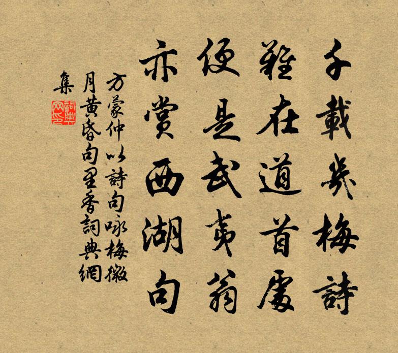 詩詞名句歷史字典書法欣賞書法字典國語詞典說文解字康熙字典古漢語字典標 題 作 者 詩 句 以詩句詠梅微月黃昏句里香作者:方蒙仲 朝代:宋代以詩句詠梅微月黃昏句里香原文千載幾梅詩,難在道首處。便是武夷翁,亦賞西湖句。詩詞問答問:以詩句詠梅微月黃昏句里香的作者是誰?答:方蒙仲問:以詩句詠梅微月黃昏句里香寫於哪個朝代?答:宋代方蒙仲以詩句詠梅微月黃昏句里香書法欣賞以詩句詠梅微月黃昏句里香書法作品詩詞推薦瑞鶴仙(母氏生朝二首)趙善括〔宋代〕月華凝露掌。正極目鸞霄,望風鯨壤。深宮注遐想。聽點點花漏,盈盈仙仗。笙簫迎響。降瓊輪、玄雲步障。洞□和徐季功舒蘄道中二十首王之道〔宋代〕庭閒人靜鳥窺簾,坐對文書亦倦拈。春旱正須三尺雨,江湖寧放老蛟潛。晚晴衛涇〔宋代〕雨斷風回忽報晴,山顛初日掛銅鉦。雲煙藏跡千峰翠,草木增華兩眼明。桑野枝空蠶杼歇,溪泉溜急水車鳴。鳥啼次韻陳季鄰戶部旦過庵范成大〔宋代〕宦遊觸處似懸匏,北嶽南山想獻嘲。拍手百年休鑄鐵,蓋頭一把暫誅茅。玉京歲晚梧桐落,水國霜清橘柚包。飛錫陸君置酒為予唱陽關即席有作強至〔宋代〕陽關何處草煙平,不識陽關空記名。古人驅車欲西過,吟成繕寫離群情。天涯此去故人絕,雖有樽酒同誰傾。古人乙卯端午十絕劉克莊〔宋代〕兒女需京纈,經時買未歸。似嫌無艾虎,不肯換生衣。漁家傲可旻〔宋代〕人世罪冤知底數。前程不是無冥府。爭似靜焚香一炷。無行住。聲聲稱念彌陀父。罪業盡消生有處。彌陀願力堪憑沁園春佚名〔宋代〕蠻柳眠風,妃棠醉日,春意方濃。怪凌晨乾鵲,歡聲嘖嘖,充閭瑞靄,佳氣蔥蔥。白鹿效靈,黃龜獻夢,還應君生和子由木山引水二首蘇軾〔宋代〕蜀江久不見滄浪,江上枯槎遠可將。去國尚能三犢載,汲泉何愛一夫忙。崎嶇好事人應笑,冷淡為歡意自長。遙想偈頌一百二十三首釋普度〔宋代〕踏斷洛陽橋,直上妙峰頂。拈得家傳黑竹篦,攪動龍淵千尺井。四五處雷動風行, * 十春花月影。為人端的無情初冬風雨驟寒作短歌陸游〔宋代〕東園日淡雲容薄,綸巾朝暮闌乾角。北風動地萬木號,不料一寒如此惡。豈惟半夜雨打窗,便恐明朝雪平壑。綠酒伐雙谷蘇轍〔宋代〕芳蘭非不嘉,當門自宜鋤。矧此惡木陰,久妨長者車。僕夫礪尋斧,告 * 方除。久持不忍意,柯條益扶疏。植根茶庵逍遙子〔宋代〕道人宴坐碧山阿,,啄木敲門擬客過。吾境本無妖魅事,日長翻有睡為魔。源里劉克莊〔宋代〕一洞沾秦俗,疑非太古民。盡將源里事,報與世間人。出見京華之盛而作晁說之〔宋代〕飄零羇客尚驚魂,乍見王居白玉城。三市盡迷南北向,入騶爭禁短長行。花栘陸海春常在,樓接神山月不傾。安得滿江紅王質〔宋代〕紙張梅花,有叢桂、又有修竹。是何聲、雪飄遠渚,泉鳴幽谷。紅蓼白苹須拂袖,餘音尚帶清香馥。挽素娥青女、寄徐濟進士(一本題下無進士二字)羅隱〔唐代〕往年疏懶共江湖,月滿花香記得無。霜壓楚蓮秋後折,雨催蠻酒夜深酤。紅塵偶別迷前事,丹桂相傾愧後徒。出得清明日與友人游玉粒(一本無粒字)塘莊來鵠〔唐代〕幾宿春山逐陸郎,清明時節好煙光。歸穿細荇船頭滑,醉踏殘花屐齒香。風急嶺雲飄迥野,雨余田水落方塘。不堪武陵開元觀黃鍊師院三首王昌齡〔唐代〕松間白髮黃尊師,童子燒香禹步時。欲訪桃源入溪路,忽聞雞犬使人疑。先賢盛說桃花源,塵忝何堪武陵郡。聞道和陶貧士七首蘇軾〔宋代〕我家六兒子,流落三四州。辛苦見不識,今與農圃儔。買田帶修竹,築室依清流。未能遣一力,分汝薪水憂。坐念名句推薦人生天地間,忽如遠行客。佚名《青青陵上柏》 重賞之下,必有勇夫。畢沅《續資治通鑑·宋紀·宋紀十七》 黃河之水天上來,奔流到海不復回。李白《將進酒》 庶人莫與官爭,貴人不結人怨。來俊臣《羅織經·保身卷第七》 燕子不歸春事晚,一汀煙雨杏花寒。戴叔倫《蘇溪亭》 未覺池塘春草夢,階前梧葉已秋聲。朱熹《偶成》 一夜東風,枕邊吹散愁多少。曾允元《點絳唇·一夜東風》 見面憐清瘦,呼兒問苦辛。蔣士銓《歲暮到家》 濛柳添絲密,含吹織空羅。李世民《詠雨》 雞鳴紫陌曙光寒,鶯囀皇州春色闌。岑參《奉和中書舍人賈至早朝大明宮》
