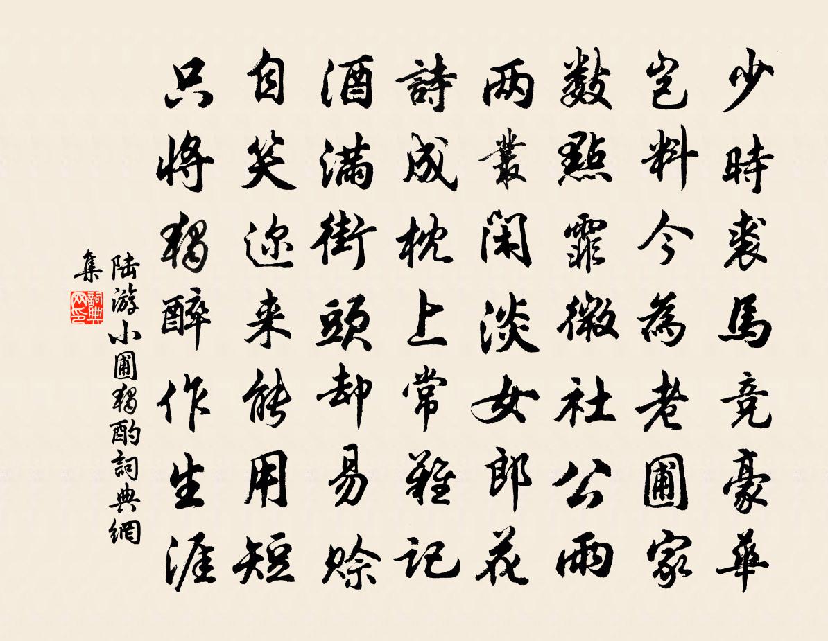 詩詞名句歷史字典書法欣賞書法字典國語詞典說文解字康熙字典古漢語字典標 題 作 者 詩 句 小圃獨酌作者:陸游 朝代:宋代小圃獨酌原文少時裘馬競豪華,豈料今為老圃家。數點霏微社公雨,兩叢閒淡女郎花。詩成枕上常難記,酒滿街頭卻易賒。自笑邇來能用短,只將獨醉作生涯。詩詞問答問:小圃獨酌的作者是誰?答:陸游問:小圃獨酌寫於哪個朝代?答:宋代問:陸游的名句有哪些?答:陸游名句大全陸游小圃獨酌書法欣賞小圃獨酌書法作品詩詞推薦挽胡季昭用王盧溪韻羅疸〔宋代〕百世期令固本支,一身寧復許安危。前瞻象郡賢方去,後有鶴山人效奇。地接宜陽山谷笑,舟回湘水屈原知。櫝中比干墓汪元量〔宋代〕衛州三十里,荒墩草無數。忽聽路人言,此葬比干處。下馬拊石碑,三嘆不能去。斐然成歌章,聊書墓頭樹。我吊悼王習之吳芾〔宋代〕兩州佳政萬人傳,一旦那知遂溘然。到底久生從古少,要須乘健早歸田。種芥方岳〔宋代〕不論青紫已離離,煙濕春畦手自治。一笑摩挲空洞腹,是間盡納幾須彌。題吳寺傅夢得〔宋代〕不到吳墳久,重來又七春。山巒如舊識,猿鶴復相親。往事皆成夢,清游不厭頻。倦行難喚酒,信步出湖濱。紫雲洞員興宗〔宋代〕君不見茂州長史文章翁,生平姓字懸天東,英言撼帝帝不從,建隆以來無此忠。今焉棲神寓玄躬,道在翳嘶峰外之宿漁梁驛蔡襄〔宋代〕庭樹疏疏河漢低,瓦溝霜白月平西。寒鴉不奈單棲苦,落泊驚飛到曉啼。和用明梅十三絕胡寅〔宋代〕綠萼全勝紅萼好,新枝爭亞舊枝長。賞心未減春風蝶,傍蕊穿花栩栩狂。次韻子瞻聞不赴商幕三首蘇轍〔宋代〕塤動篪鳴只自知,憂輕責少幸官卑。聲名謾作耳中瑱,科第空收頜底髭。西鄙猖狂猶將將,中朝閒暇自師師。近成先帝登遐聖君嗣位追惟恩顧涕泣成章王禹偁〔宋代〕鼎湖髯斷去難攀,九五飛龍已御乾。兩制舊臣生白髮,一番新貴上青天。老為郎吏承縗絰,假作諸侯哭几筵。疏賤寓居寄友人劉滄〔唐代〕雨餘虛館竹陰清,獨坐書窗軫旅情。芳草衡門無馬跡,古槐深巷有蟬聲。夕陽雲盡嵩峰出,遠岸煙消洛水平。今夜罔象得玄珠張籍〔唐代〕赤水今何處,遺珠已渺然。離婁徒肆目,罔象乃通玄。皎潔因成性,圓明不在泉。暗中看夜色,塵外照晴田。無脛氐州第一·波落寒汀周邦彥〔宋代〕波落寒汀,村渡向晚,遙看數點帆小。亂葉翻鴉,驚風破雁,天角孤雲縹緲。官柳蕭疏,甚尚掛微微殘照?景物關寄題莊器之招隱樓張鎡〔宋代〕得時則為人,此固丈夫志。生前必功名,說實起後世。君看禹稷徒,烏有覬望意。偶然事逢手,勢若破竹易。所以清平樂晏幾道〔宋代〕蕙心堪怨,也逐春風轉。丹杏牆東當日見,幽會綠窗題遍。眼中前事分明,可憐如夢難憑。都把舊時薄倖,只消今美原縣北軒李復〔宋代〕淵明昔遯世,北窗朝脫巾。清風一披拂,自謂義皇人。冥冥孤鴻姿,真與浮雲親。寂寞千載後,遐躅空遺塵。嗟予嫦娥李商隱〔唐代〕雲母屏風燭影深,長河漸落曉星沉。嫦娥應悔偷靈藥,碧海青天夜夜心。寄韓蛻秀才齊己〔唐代〕松門高不似侯門,蘚徑鞋蹤觸處分。遠事即為無害鳥,多閒便是有情雲。那憂寵辱來驚我,且寄風騷去敵君。知伴龍門鎮(龍門鎮在成縣東後改府城鎮)杜甫〔唐代〕細泉兼輕冰,沮洳棧道濕。不辭辛苦行,迫此短景急。石門雪雲隘,古鎮峰巒集。旌竿暮慘澹,風水 * 澀。胡馬結交孟郊〔唐代〕鑄鏡須青銅,青銅易磨拭。結交遠小人,小人難姑息。鑄鏡圖鑑微,結交圖相依。凡銅不可照,小人多是非。名句推薦北極朝廷終不改,西山寇盜莫相侵。杜甫《登樓》 榮寵有初,鮮有終者;吉凶無常,智者少禍。來俊臣《羅織經·固榮卷第六》 父子之嚴,不可以狎;骨肉之愛,不可以簡。顏之推《顏氏家訓·教子篇》 當年得意如芳草。日日春風好。辛棄疾《虞美人·賦虞美人草》 十有九人堪白眼,百無—用是書生。黃景仁《雜感》 玉人初上木蘭時。懶妝斜立澹春姿。吳文英《浣溪沙·題李中齋舟中梅屏》 馬思邊草拳毛動,雕眄青雲睡眼開。劉禹錫《始聞秋風》 古人學問無遺力,少壯工夫老始成。陸游《冬夜讀書示子聿》 閒鷺棲常早,秋花落更遲。錢起《谷口書齋寄楊補闕》 江涵秋影雁初飛,與客攜壺上翠微。杜牧《九日齊山登高》