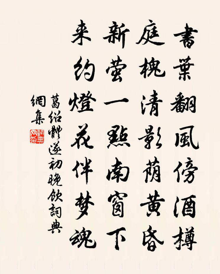 詩詞名句歷史字典書法欣賞書法字典國語詞典說文解字康熙字典古漢語字典標 題 作 者 詩 句 遂初晚飲作者:葛紹體 朝代:宋代遂初晚飲原文書葉翻風傍酒樽,庭槐清影蔭黃昏。新螢一點南窗下,來約燈花伴夢魂。詩詞問答問:遂初晚飲的作者是誰?答:葛紹體問:遂初晚飲寫於哪個朝代?答:宋代葛紹體遂初晚飲書法欣賞遂初晚飲書法作品詩詞推薦送丁懷忠教授象州陳傅良〔宋代〕二毛羈旅久,一飯瘴鄉輕。把酒時相屬,令人意自平。校官無簿領,帥閫甚聲名。所恨冥冥雨,梅天不肯明。五月七日夜夢中作陸游〔宋代〕征行過孤壘,寂寞已千年。馬病霜菅瘦,狐鳴古冢穿。煙塵身欲老,金石志方堅。零落英雄盡,何人共著鞭?禪人請贊釋師範〔宋代〕眼裹沒瞳人,鼻頭無孔竅。單賣赤發綜,鬼見拍手笑。世有愚痴個樣僧,難為名字上傳燈。天寶歌和魏定公文次韻王之道〔宋代〕連昌宮中馬為樂,一時舞馬黃金絡。君王養欲臣養文,忠鯁漫多寧救藥。嗷嗷萬國風中船,檣傾柂壞夫何言。潼關過武連縣北柳池安國院煮泉試日鑄顧渚茶院有陸游〔宋代〕行殿淒涼跡已陳,至今父老記南巡。一泓寒碧無今古,付與閒人作主人。句劉筠〔宋代〕桃葉橫波人共醉,劍光沖斗獄常空。望岳三首杜甫〔唐代〕岱宗夫如何?齊魯青未了。造化鍾神秀,陰陽割昏曉。盪胸生曾雲,決眥入歸鳥。會當凌絕頂,一覽眾山小。西嶽明招雜詩四首呂祖謙〔宋代〕風檐裊茶煙,銅瓶語相泣。清陰一疎箔,不礙飛花入。鄉禪嵩老集古人佳句成詩編成巨帙以示余欽不楊夢信〔宋代〕胸中歷歷古人詩,妙用縱橫自一機。管得杜韓驚且泣,斕斑要作百家衣。學詩元不離參禪,萬象森羅總現前。觸著再游棲霞洞劉克莊〔宋代〕直路幽陰側路明,玉為牆壁雪為城。殷勤報有詩翁到,萬一仙人肯出迎。組以時果供饋予以酒為報張舜民〔宋代〕饉歲無時果,秦人饜草茶。開奩驚見李,對客喜浮瓜。為乏瓊瑤報,聊稱旨酒嘉。中郎不憂老,有女可傳家。錢塘有作張繼先〔宋代〕紅霞映朱欄,白雲隱青山。塵中人不到,雙鶴舞柴關。瑤琴一曲詩數篇,山童煮茗爐無煙。為思塵世去遊樂,一別日暮雪將作掃門待之舒岳祥〔宋代〕凍鴉膠樹水雲迷,雀語相邀作早棲。淨掃門庭延雪集,可容圭璧委塵泥。首尾吟邵雍〔宋代〕堯夫非是愛吟詩,詩是堯夫登閣時。往事千年徒渺漭,斜陽一片漫光輝。伊川洛川水似線,太室少室峰如錐。爭者次韻答元素(並引)蘇軾〔宋代〕余舊有贈元素〔詞〕雲天涯同是傷流落,元素以為今日之先兆,且悲當時六客之存亡。六客蓋張子野、劉孝叔、陳江神子(別子似,未章寄潘德久)辛棄疾〔宋代〕看君人物漢西都。過吾廬。笑談初。便說公卿,元自要通儒。一自梅花開了後,長怕說,賦歸歟。而今別恨滿江湖次韻八弟西園課經二首二晁補之〔宋代〕懶曠期陶謝,呼兒讀晉書。葛巾傾泛瀲,蠟屐上嶔嶇。回向空門舊,揩磨意地初。未堪朝市隱,且欲去衡廬。題趙昌父山居八詠已矣軒楊萬里〔宋代〕蠻觸無休日,菟裘有別天。撫松非已矣,釆菊未悠然。次韻趙帥四首陳造〔宋代〕月姊多情闖綺窗,停雲著意護飛霜。艷桃濃李寬圍坐,舞雪歌雲各擅場。醉倒不堪酬禮數,歸來贏得夢魂香。明朝東西道元稹〔唐代〕 * 開四極,便有東西道。萬古閱行人,行人幾人老。顧我倦行者,息陰何不早。少壯塵事多,那言壯年好。名句推薦獨抱濃愁無好夢,夜闌猶剪燈花弄。李清照《蝶戀花·暖雨晴風初破凍》 玉露金風報素秋,穿針樓上獨含愁。德容《七夕二首·其一》 棲霞山裂;沂水陷穴,廣數畝蒲松齡《地震》 嘆流年、又成虛度。陸游《謝池春·壯歲從戎》 奢者富而不足,何如儉者貧而有餘。洪應明《菜根譚·概論》 三月休聽夜雨,如今不是催花。張炎《清平樂·采芳人杳》 和氏之璧乎?價重千金,然以之間紡,曾不如瓦磚。劉向《說苑·雜言》 生怕見花開花落,朝來塞雁先還。辛棄疾《漢宮春·立春日》 小娃撐小艇,偷采白蓮回。白居易《池上》 高梧百尺夜蒼蒼,亂掃秋星落曉霜。鄭燮《詠梧桐》