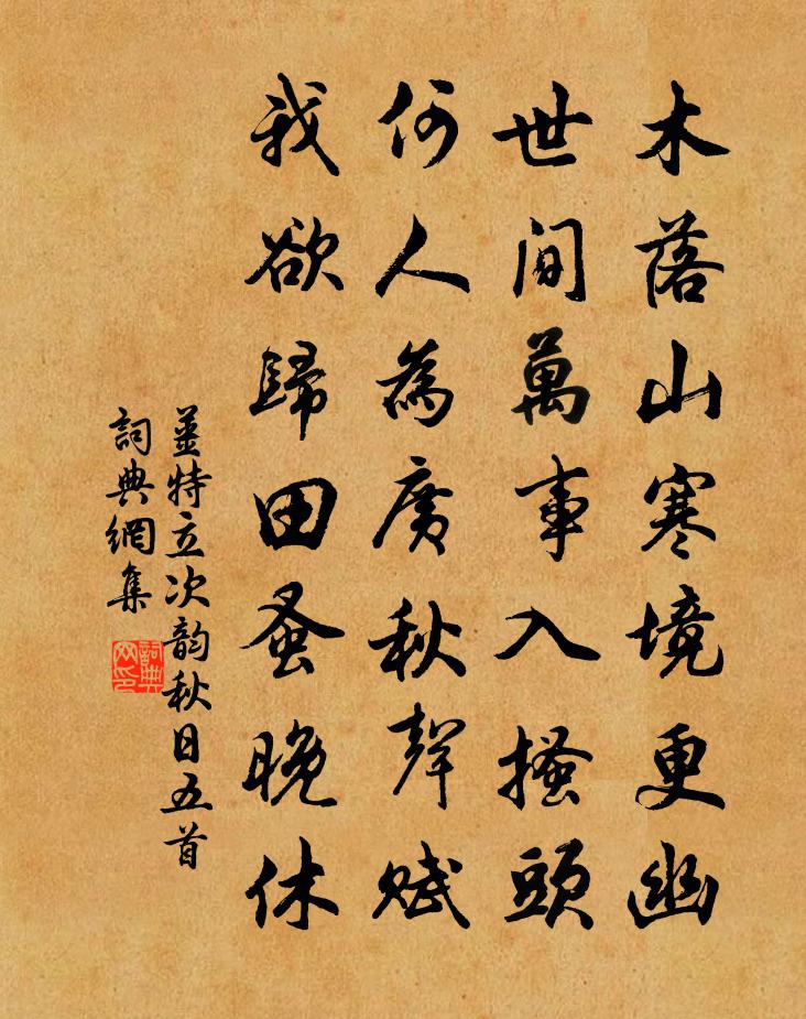 詩詞名句歷史字典書法欣賞書法字典國語詞典說文解字康熙字典古漢語字典標 題 作 者 詩 句 次韻秋日五首作者:姜特立 朝代:宋代次韻秋日五首原文木落山寒境更幽,世間萬事入搔頭。何人為廣秋聲賦,我欲歸田蚤晚休。詩詞問答問:次韻秋日五首的作者是誰?答:姜特立問:次韻秋日五首寫於哪個朝代?答:宋代姜特立次韻秋日五首書法欣賞次韻秋日五首書法作品詩詞推薦客意五首陳舜俞〔宋代〕高岸聳如陵,秋光著處清。遙山照眼碧,黃葉逐人行。莫怪新煙火,曾經古戰爭。深林茅屋小,氣象亦豪英。次韻子瞻廣陵會三同舍各以其字為韻 劉莘老蘇轍〔宋代〕莘老奮徒步,首與觀國賓。儼然自約束,被服韍與紳。黽勉丞相府,接跡輿台臣。顧嫌任安躁,未忍裂坐茵。推置迷神引 貶玉溪,對不山作晁補之〔宋代〕黯黯青山紅日暮。浩浩大江東注。餘霞散綺,向煙波路。使人愁,長安遠,在何處。幾點漁燈小,迷近塢。一片客次韻游山門寺望文脊山王安石〔宋代〕宣城封百山間,封文脊尤奇封峰。拔出封飛鳥上,圖畫難為容。聞昔有幽人,捫蘿追赤松。遺形此古室,孤坐鹿裘寫懷釋行海〔宋代〕獨立吳山望越山,海門人去幾時還。故鄉猶隔蒼茫外,一點征愁落日間。九日徐似道〔宋代〕衰容不似秋容好,坐上誰憐老孟嘉。牢裹烏紗莫吹卻,免教白髮見黃花。回溪道中楊公遠〔宋代〕山束溪流窄逕迂,眼前景物入詩無。田中蝌蚪古文字,柳下舂鉏新畫圖。巨室儲茶供客販,小旗夸酒誘人沽。行行郊廟歌辭。梁太廟樂舞辭。大合舞佚名〔唐代〕於穆皇祖,浚哲雍熙。美溢中夏,化被南陲。后稷累德,公劉創基。肇興九廟,樂合來儀。重九考罷試卷書呈同院諸公張耒〔宋代〕回首登高行復冬,後時只合嘆龍鍾。愁須白酒來酣戰,詩為黃花吊不逢。十日飛騰過眼疾,萬簽甲乙定誰從。共應巫山一段雲姬翼〔元代〕雲散金風勁,天開玉宇新。亭亭孤月轉冰輪。光彩破黃昏。清坐*然韻勝。縹緲太虛真境。不煩風馭與飈輪。平步寄靈一上人初歸雲門寺張籍〔唐代〕寒山白雲里,法侶自招攜。竹徑通城下,松門隔水西。方同沃洲去,不作武陵迷。仿佛遙看處,秋風是會稽。登天清寺塔陳與義〔宋代〕為眼不計腳,攀梯受微辛。半天拍闌乾,驚倒地上人。風從萬里來,老夫方岸巾。荒荒春浮木,浩浩空納塵。夕陽次韻仇仁近用韻見示五首方回〔宋代〕時驚驛走聽庭宣,老朽於予孰使年。鳴玉久忘綪結佩,穿花空憶錦連錢。愧非今代王摩詰,許識能詩孟浩然。野服和人游嵩山十二題其七天門范仲淹〔宋代〕天門絕境游,熙然揖灝氣。下顧莽蒼間,雲雷走平地。天威不遠人,孰起欺天意。十一月七日五首張耒〔宋代〕山與晴天晚,江連夕照紅。高鴻知夜渚,喬木要霜風。買酒缸須滿,溫爐火屢供。窮通定何物,隨意樂衰翁。次行奚山蘇頌〔宋代〕奚山繚繞百重深,握節何妨馬上吟。當路牛羊眠薦草,避人鳥鵲噪寒林。羸肌已怯旜裘重,衰鬢寧禁霜雪侵。獨愛和周仲嘉再示三篇王洋〔宋代〕花有芳叢竹有林,春來各競趁光陰。妍媸等是目前事,冷淡方知異日心。十二里山長隔面,一帆風地每傳吟。高山讀詔書石介〔宋代〕關中有山生虎狼,虎狼性{左虎右武}不可當。去歲食人十有一,無辜被此惡物傷。守臣具事奏聖帝,聖帝讀之惻韓相生日金君卿〔宋代〕商飈迎素律,兌澤薦元精。象順奎鈞爛,天鍾義氣清。千齡將聖偶,冢輔為時生。粹蘊森群玉,沖襟貯四瀛。大方神弦李賀〔唐代〕女巫澆酒雲滿空,玉爐炭火香咚咚。海神山鬼來座中,紙錢窸窣鳴旋風。相思木貼金舞鸞,攢蛾一啑重一彈。呼星名句推薦易漲易退山溪水,易反易覆小人心。佚名《增廣賢文·上集》 崖崩路絕猿鳥去,惟有喬木攙天長。蘇軾《李思訓畫長江絕島圖》 爭名者於朝,爭利者於市。劉向《戰國策·秦一·司馬錯與張儀爭論於秦惠王前》 烽火平安夜,歸夢到家山。崔與之《水調歌頭·題劍閣》 應是天仙狂醉,亂把白雲揉碎。李白《清平樂·畫堂晨起》 前經洛陽陌,宛洛故人稀。王維《送魏郡李太守赴任》 雲無心以出岫,鳥倦飛而知還。陶淵明《歸去來兮辭·並序》 萬里人南去,三春雁北飛。韋承慶《南中詠雁詩》 江寒水不流,魚嚼梅花影。釋敬安《題寒江釣雪圖》 何處是歸程?長亭連短亭。李白《菩薩蠻·平林漠漠煙如織》