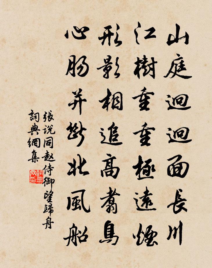 詩詞名句歷史字典書法欣賞書法字典國語詞典說文解字康熙字典古漢語字典標 題 作 者 詩 句 同趙侍御望歸舟作者:張說 朝代:唐代同趙侍御望歸舟原文山庭迥迥面長川,江樹重重極遠煙。形影相追高翥鳥,心腸並斷北風船。詩詞問答問:同趙侍御望歸舟的作者是誰?答:張說問:同趙侍御望歸舟寫於哪個朝代?答:唐代問:同趙侍御望歸舟是什麼體裁?答:七絕張說同趙侍御望歸舟書法欣賞同趙侍御望歸舟書法作品注釋全唐詩:卷89_37詩詞推薦謫居王禹偁〔宋代〕親老復嬰孩,吾生自可哀。無田得歸去,有俸是嗟來。直道雖已矣,壯心猶在哉。端居寡儔侶,懷抱向誰開。悲夏畦喻良能〔宋代〕悲夏畦,南畝苗未長,東皋草已齊。旋令嫗婦辦餉饁,獨引丁男耘稗稊。悲夏畦,炎天炙背如爇雞,渴來不得飲清久不作詩詩思甚涸春物日盛漫興三章用常德棗趙蕃〔宋代〕威嚴退冰霜,清潤歸梅柳。法時騁青春,老至傷白首。日長卷添書,病倦杯費酒。姑置雁鶩行,顧慚牛馬走。鄭州浮波亭呂夷簡〔宋代〕清波環繞地無塵,榜署嘉名得意新。若問經綸康濟術,亭中兼有釣璜人。次韻蘇和甫雨後觀梅魏了翁〔宋代〕歲寒賓友伴蕭蕭,客氣無根已盡凋。疏影照人騷夢冷,清香徹骨醉痕銷。話逢理到春生坐,飲為心知月滿瓢。更祝雜曲歌辭。車遙遙胡曾〔唐代〕自從車馬出門朝,便入空房守寂寥。玉枕夜殘魚信絕,金鈿秋盡雁書遙。臉邊楚雨臨風落,頭上春雲向日銷。芳草自貽鄭谷〔唐代〕飲筵博席與心違,野眺春吟更是誰。琴有澗風聲轉淡,詩無僧字格還卑。恨拋水國荷蓑雨,貧過長安櫻筍時。頭角過嘉興道中接待寺丁丑十二月赴逮揚州遇雪留方回〔宋代〕疇昔留此寺,亦茲臘雪天。天寒了不異,俯仰十一年。是時尚守郡,赴逮趨淮壖。不知坐何事,自省無尤愆。家有杭山八景章鑒〔宋代〕昔賢曾此著名香,地位雙清四座涼。吹送幾多攀桂客,照來無數探花郎。光浮盞面龍鱗動,聲透琴心兔魄揚。爽我黃子京見訪值予未還留詩和韻以謝陳文蔚〔宋代〕自從別去竹林居,暇日尋詩每念渠。疾讀新編慰牢落,清風習習滿襟裾。九日登樟亭驛樓許渾〔唐代〕鱸鱠與蓴羹,西風片席輕。潮回孤島晚,雲斂眾山晴。丹羽下高閣,黃花垂古城。因秋倍多感,鄉樹接鹹京。月夜懷徐冰壑顧逢〔宋代〕靜掩書齋對短檠,夜深風露逼人清。遙思萬壑千山里,猿正啼時月正明。壟穴遺詩沈廷瑞〔唐代〕虛勞營殯玉山前,殯後那知已脫蟬。應是元神歸洞府,更與遺魄在黃泉。靈台已得修真訣,塵世空留悟道篇。堪嘆送李著作倅杭州張諤〔唐代〕輟史空三署,題輿佐一方。祖筵開霽景,征陌直朝光。水陸風煙隔,秦吳道路長。佇聞敷善政,邦國詠惟康。水調歌頭佚名〔宋代〕八蠻朝鳳闕,四境絕狼煙。太平無事,超烘聚哨效梨園。笛弄崑崙上品,篩動雲陽妙選,畫鼓可人憐。亂撒真珠迸玲瓏四犯(大石)周邦彥〔宋代〕穠李夭桃,是舊日潘郎,親試春艷。自別河陽,長負露房煙臉。憔悴鬢點吳霜,念想夢魂飛亂。嘆畫闌玉砌都換。寄舍弟杜荀鶴〔唐代〕世亂信難通,鄉心日萬重。弟兄皆向善,天地合相容。大野陰雲重,連城殺氣濃。家山白雲里,臥得最高峰。次韻朱知裁少卿見貽二首曾惇〔宋代〕丹丘印山水窟,印中有如斗印城。地迥鳥中喧,一葉動亦驚。閒門有勝士,學道師廣成。翛然臥環堵,六印一縷輕天游觀陳元英〔宋代〕琅玕瑤草滿空山,月上丹台鶴未還。夜入瓊樓襟袖冷,始知身在白雲間。不須檀板與金樽趙時韶〔宋代〕醒來拍手倚雕欄,啜茗喔詩子細看。縱有淺斟低唱者,個別清意不相干。名句推薦綠淨春深好染衣。際柴扉。賀鑄《釣船歸·綠淨春深好染衣》 月落烏啼霜滿天,江楓漁火對愁眠。張繼《楓橋夜泊 / 夜泊楓江》 明朝事與孤煙冷,做滿湖、風雨愁人。吳文英《渡江雲三犯·西湖清明》 茶為累也,亦猶人參。陸羽《茶經·一之源》 野雲萬里無城郭,雨雪紛紛連大漠。李頎《古從軍行》 君子恥不修,不恥見污。荀子《荀子·非十二子》 還君明珠雙淚垂,恨不相逢未嫁時。張籍《節婦吟·寄東平李司空師道》 寒氣先侵玉女扉,清光旋透省郎闈。李商隱《對雪二首》 欸乃一聲山水綠。回看天際下中流,岩上無心雲相逐柳宗元《漁翁》 誠者,天之道也。誠之者,人之道也。誠者,不勉而中不思而得:從容中道,聖人也。誠之者,擇善而固執之者也子思《中庸·第二十章》