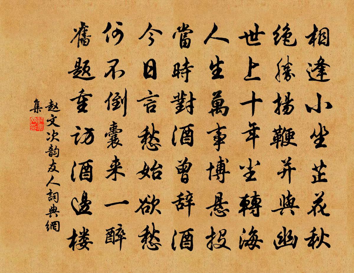 詩詞名句歷史字典書法欣賞書法字典國語詞典說文解字康熙字典古漢語字典標 題 作 者 詩 句 次韻友人作者:趙文 朝代:宋代次韻友人原文相逢小坐芷花秋,絕勝揚鞭並與幽。世上十年塵轉海,人生萬事博懸投。當時對酒曾辭酒,今日言愁始欲愁。何不倒囊來一醉,舊題重訪酒邊樓。詩詞問答問:次韻友人的作者是誰?答:趙文問:次韻友人寫於哪個朝代?答:宋代趙文次韻友人書法欣賞次韻友人書法作品詩詞推薦上元後一日觀燈寄王四蘇轍〔宋代〕城頭月減一分圓,城裡人家萬炬然。紫陌群游逢酒住,紅裙醉舞向人妍。且為行樂終今夕,共道重來便隔年。遙想大行太皇太后高氏輓詞二首蘇軾〔宋代〕卻狄安諸夏,先王社稷臣。固應祠百世,何止活千人。定策天知我,忘家帝念親。萬方何以報,得疾為勤民。解蹀躞·醉雲又兼醒雨吳文英〔宋代〕醉雲又兼醒雨,楚夢時來往。倦蜂剛著梨花、惹遊蕩。還作一段相思,冷波葉舞愁紅,送人雙槳。暗凝想。情共天凌歊台韓元吉〔宋代〕山到西江勢卻回,倚山樓殿更高台。天容水色望中見,帆影車塵窗際來。桑枯棋分千里迥,波濤壁立兩峰開。登臨英宗皇帝寧字御漢體書贊岳珂〔宋代〕惟漢體書,筆法之變。於帝王中,亦有羲獻。有煜昭陵,蒸雲激電。品冠一神,中寓萬善。於惟治平,問安視膳。詩一首姚中〔宋代〕魚龍吹浪起雲煙,來向江湖駕鐵船。捲地黑風吹海立,直將波浪過西天。都下竹枝詞方文〔清代〕自昔旃裘與酪漿,而今啜茗又焚香。雄心盡向蛾眉老,爭肯捐軀入戰場。即事二首劉克莊〔宋代〕非人不暖豈其然,捲起桃笙設艾氈。老物可憎吾頓覺,盛時一失汝堪憐。有分香妓空遺臭,無散花魔莫惱禪。多謝【雙調】撥不斷王和卿〔元代〕大魚勝神鰲,夯風濤,脊樑上輕負著蓬萊島。萬里夕陽錦背高,翻身猶恨東洋小,太公怎釣?綠毛龜綠毛稠,繞池秋湖上晚景四首宋庠〔宋代〕小小江山國,輕輕縞紵衣。波光清作面,天勢碧成圍。岸蝶隨人舞,沙鷗掠坐飛。此心兼此境,安得不忘機。次韻陳晟別瀹陳著〔宋代〕世態悠悠合與分,人生總是一浮雲。瘦□悽惻來東野,妙墨淋漓恍右軍。棠嶠別時如夢寐,竹林何日共朝曛。吾今贈徑山銛書記陸游〔宋代〕徑山老將無勍敵,百萬魔軍俱掃跡。座下何人策雋功,籌略縱橫銛記室。銛公聲名滿吳會,惟有放翁最先識。奕奕醉蓬萊佚名〔宋代〕看梅腮妝臘,柳眼緘春,小寒交候。蓂莢雙開,慶生賢毓秀。早著蜚聲,榮登鶚表,正是當年少。大器能藏,待當寄酬曹伯玉因以招之王安石〔宋代〕寒鴉對立西風樹,幽草環生白露庭。清坐苦無公事擾,高談時有故人經。思君異日投朱紱,過我何時載淥醽。及此紀事文天祥〔宋代〕狼心那顧歃銅盤,舌在縱橫擊可汗。自分身為虀粉碎,虜中方作丈夫看。杜倅再示前韻繼這二首王洋〔宋代〕慚愧詩筒數往回,自嫌侷促困駑材。塵蹤已掛舊官壁,妙語猶隨新雨來。好客共謀良夜醉,養花長得四時開。知君黃昏小雨中蹔憩蒼頭在傍雲初未嘗得瞑予乃甚陸游〔宋代〕人看初無寐,形勞幸少休。夢魂雖栩栩,鼻息未齁齁。輕若風中絮,浮如水上漚。死生君了否?試向此中求。嘉禾百詠施墓張堯同〔宋代〕蒼苔侵壞道,晚雀散空林。莫問人賢否,浮生一古今。高宗皇帝輓詞李祥〔宋代〕七月來同軌,因山儉德昭。堯喪三載慕,禹葬百神朝。寂寞龍樓閟,淒涼鳳輦遙。臣民紛雨潤,血灑浙江潮。寄崇福主澤南洲陳著〔宋代〕天地中閒澒洞塵,山林須是好三分。危時安飯僧家鼓,濁世清風相國墳。老後重來如夢見,靜中自韻以心聞。同游名句推薦馬蹄濃露,雞聲淡月,寂歷荒村路。張榘《青玉案·被檄出郊題陳氏山居》 昨夜江邊春水生,艨艟巨艦一毛輕。朱熹《活水亭觀書有感二首·其二》 樓倚霜樹外,鏡天無一毫。杜牧《長安秋望》 為學日益,為道日損。損之又損,以至於無為。老子《老子·德經·第四十八章》 東風動百物,草木盡欲言。李白《長歌行》 小山重疊金明滅,鬢雲欲度香腮雪。溫庭筠《菩薩蠻·小山重疊金明滅》 絡緯秋啼金井闌,微霜淒淒簟色寒。李白《長相思·其一》 行路難!行路難!多歧路,今安在?李白《行路難三首》 同天下之利者,則得天下;擅天下之利者,則失天下。姜子牙《六韜·文韜·文師》 天下三分明月夜,二分無賴是揚州。徐凝《憶揚州》
