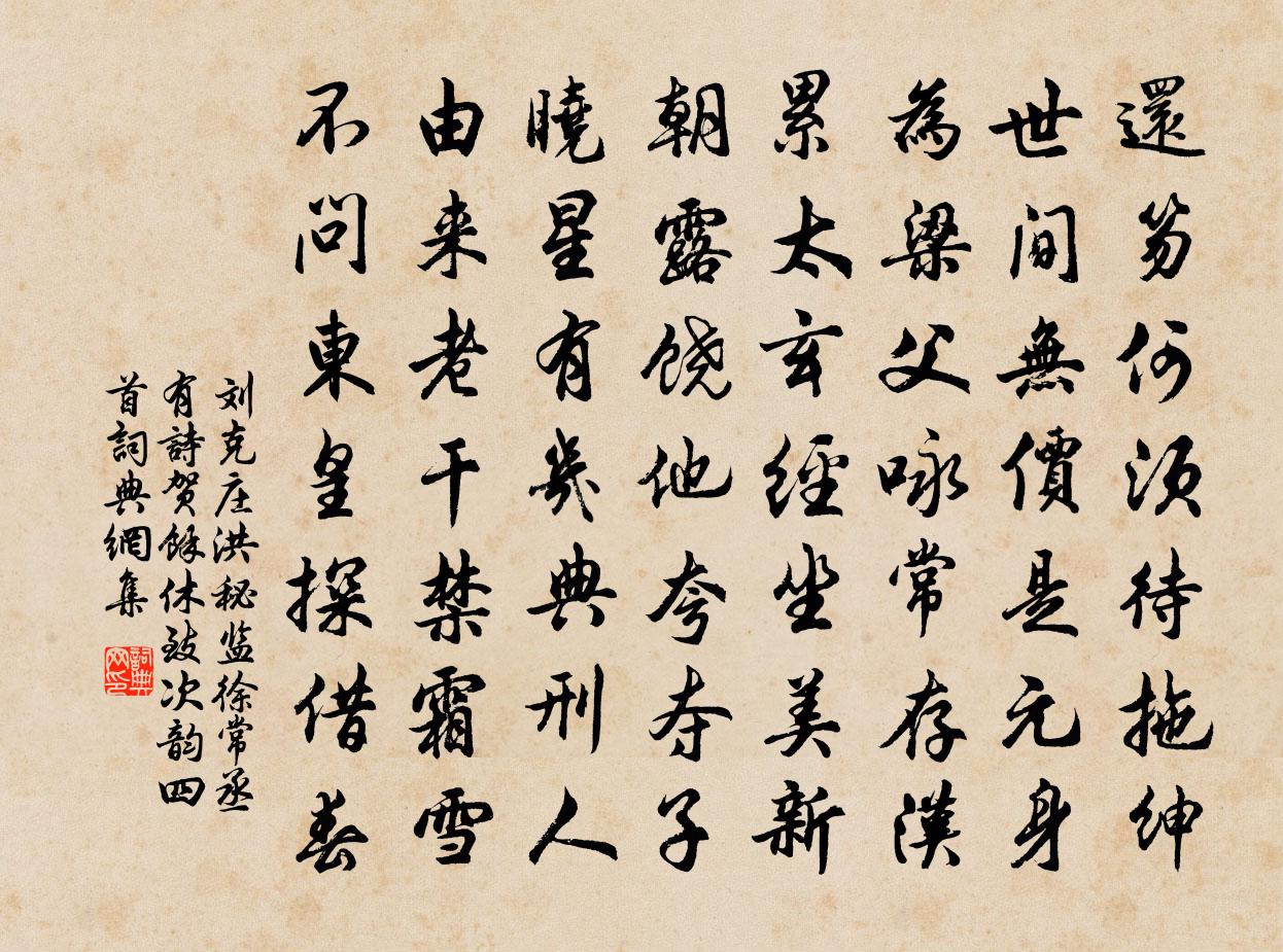 詩詞名句歷史字典書法欣賞書法字典國語詞典說文解字康熙字典古漢語字典標 題 作 者 詩 句 洪秘監徐常丞有詩賀余休致次韻四首作者:劉克莊 朝代:宋代原文還笏何須待拖紳,世間無價是元身。為梁父詠常存漢,累太玄經坐美新。朝露饒他夸奪子,曉星有幾典刑人。由來老乾禁霜雪,不問東皇探借春。詩詞問答問:《洪秘監徐常丞有詩賀余休致次韻四首》的作者是誰?答:劉克莊問:該詩寫於哪個朝代?答:宋代問:劉克莊的名句有哪些?答:劉克莊名句大全書法欣賞洪秘監徐常丞有詩賀余休致次韻四首書法作品詩詞推薦重題薔薇皮日休〔唐代〕濃似猩猩初染素,輕如燕燕欲凌空。可憐細麗難勝日,照得深紅作淺紅。不寐李新〔宋代〕不寐成孤坐,悠悠百感生。燈明將續晝,鼓急欲移更。藥熟知僮倦,杯殘任鼠爭。羈懷忘未得,時作下階行。句李大力〔宋代〕三百年來今幾秋,天地自老江自流。題平江府靈岩寺白玉蟾〔宋代〕萬松挾嶺壯招提,上有琴台與墨池。佛殿尚存今智積,姓宮曾館古西館。太湖遠水如奩鏡,木瀆平田似局棋。策杖自題連文鳳〔宋代〕每恨詩才短,吟來兩目昏。雖然五七字,難似萬餘言。雅道扶不起,苦心誰共論。幾迴風雨夜,哭殺杜陵魂。偈頌六十八首釋法薰〔宋代〕時時九夏,日日三秋。鬧市裹,百草頭。夾山老子賣峭,重價未有輕酬。黃梅五首陳師道〔宋代〕冉冉梢頭綠,婷婷花下人。欲傳千里信,暗折一枝春。句謝希孟〔宋代〕樹既摧為薪,花亦落為塵。送胡康侯使湖南楊時〔宋代〕北溟有潛鱗,其廣數千里。揚鬐厲東海,泛泛等蜉蟻。百川競奔注,漫不見涯涘。寄之天地間,大澤礨空耳。胡侯謝毗陵使君惠畫袁燮〔宋代〕都尉風流貴公子,結交海內知名士。磨礱禁臠驕侈習,雅意登山與臨水。十幅煙江疊嶂圖,當時展玩忘朝晡。老仙水龍吟黃孝邁〔宋代〕閒情小院沈吟,草深柳密簾空翠。風檐夜響,殘燈慵剔,寒輕怯睡。店舍無煙,關山有月,梨花滿地。二十年好夢梅聖俞輓歌二首司馬光〔宋代〕兵形窮勝負,史法貫興衰。落落雖殊眾,恂恂不迕時。位卑名自重,才大命須奇。世俗那能識,傷嗟止為詩。書畫一首劉克莊〔宋代〕大帝昭回獎叢藁,太師行草跋蘭亭。篋藏有物為呵護,巾襲令兒掌鑰扃。目眚端由書作崇,心痴常怕畫通靈。不如洪慶善郎中輓詩四首葛立方〔宋代〕平生氣既凜冰霜,聖讀潛心德愈光。賞善每能擊節,避人寧復解移床。第知中壘序論語,誰測詩仙流夜郎。有道固十二時行孝文白居易〔唐代〕正南午,侍奉尊親莫辭[訴]。回乾就濕長成人,如今去合論辛苦。和純甫獨往至德上方避暑強至〔宋代〕敝屋數楹隘,炎曦一線長。梅仙厭煩溽,蕭寺得清涼。山鳥聒幽耳,澗泉蠲渴腸。茲游君獨勝,河朔浪飛觴。四和劉克莊〔宋代〕誰謂斯文無定價,獨憐之子坐虛名。主司頭與筆俱點,宰物心如秤樣平。駿馬卻還國西域,病鴟墮落屋東坑。老夫索劉述之新釀孫升〔宋代〕稍覺香熏鼻,還思酒人唇。盈缸止三斗,可撥瓮頭春。三日詩謝惠連〔南北朝〕弱柳蔭修衢。菩薩蠻·湘東驛范成大〔宋代〕客行忽到湘東驛。明朝真是瀟湘客。晴碧萬重雲。幾時逢故人。江南如塞北。別後書難得。先自雁來稀。那堪春半名句推薦劍外忽傳收薊北,初聞涕淚滿衣裳。杜甫《聞官軍收河南河北》 居而安,動而變,可以佐王矣。王通《中說·卷七·述史篇》 雲銷雨霽,彩徹區明。王勃《滕王閣序》 柴門寂寂黍飯馨,山家煙火春雨晴。貫休《春晚書山家屋壁二首》 能勝強敵者,先自勝者也。商鞅《商君書·畫策》 百王之無變,足以為道貫。一廢一起,應之以貫,理貫不亂。不知貫,不知應變。荀子《荀子·天論》 晝出耘田夜績麻,村莊兒女各當家。范成大《夏日田園雜興·其七》 三冬暫就儒生學,千耦還從父老耕。陸游《觀村童戲溪上》 霸業成空,遺恨無窮。查德卿《蟾宮曲·懷古》 微暈嬌花濕欲流,簟紋燈影一生愁。納蘭性德《浣溪沙·詠五更和湘真韻》