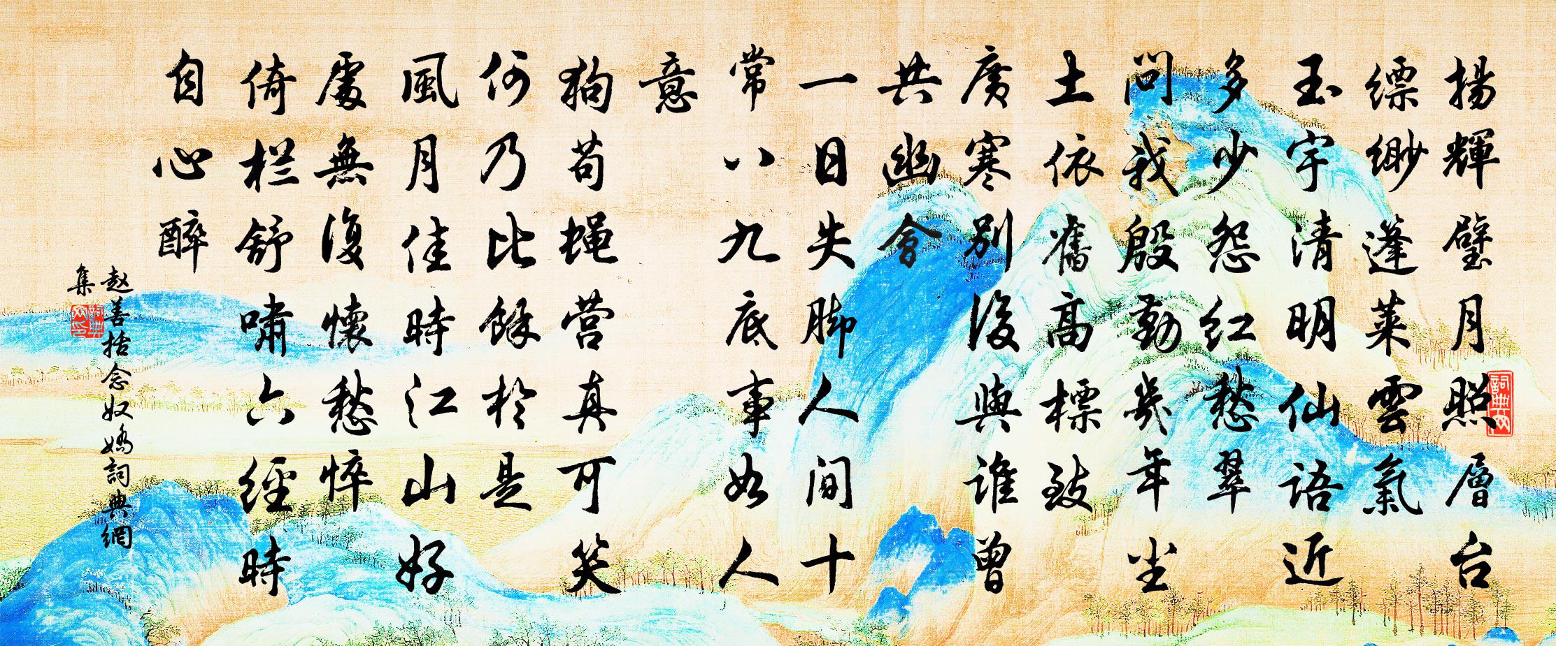 詩詞名句歷史字典書法欣賞書法字典國語詞典說文解字康熙字典古漢語字典標 題 作 者 詩 句 念奴嬌作者:趙善括 朝代:宋代念奴嬌原文揚輝璧月,照層台縹緲,篷萊雲氣。玉宇清明仙語近,多少怨紅愁翠。問我殷勤,幾年塵土,依舊高標緻。廣寒別後,與誰曾共幽會。一日失腳人間,十常八1|1九,底事如人意。狗苟蠅營真可笑,何乃比余於是。風月佳時,江山好處,無復懷愁悴。倚欄舒嘯,六經時自心醉。詩詞問答問:念奴嬌的作者是誰?答:趙善括問:念奴嬌寫於哪個朝代?答:宋代問:念奴嬌是什麼體裁?答:詞趙善括念奴嬌書法欣賞念奴嬌書法作品詩詞推薦次韻子瞻寄賀生日蘇轍〔宋代〕弟兄本三人,懷抱喪其一。頎然仲與叔,耆老天所騭。師心每獨往,可否輒自必。折足非所恨,所恨覆鼎實。上賴牧童釋正覺〔宋代〕水牯老行步穩,蓑郎痴歌笑繁。物外初無塵滓,胸中別有丘園。鴛鴦湖棹歌 之九十九朱彝尊〔清代〕歸人萬里望邱為,白酒黃壺瓠作卮。 來往棹歌無不可,西溪東泖任吾之。落花楊萬里〔宋代〕紅紫成泥泥作塵,顛風不管惜花人。落花辭樹雖無語,別倩黃鸝告許春。向樂古移居山中釋文珦〔宋代〕高懷厭古市,買屋住深峰。束帛不可聘,世人那易逢。故家遺石鼓,好景對金鐘。得句憑誰會,長歌慰井龍。依韻和春日偶書梅堯臣〔宋代〕瓮面春醅壓嫩藍,盤中鵝{上炙下肉}亦肥甘。正宜醉夢輕為蝶,苦怕酬詩密似蠶。病起羊公方隱几,歸來陶令只和朱元弼春遊王令〔宋代〕閉門無著只疏慵,謾出留連與眾同。柳卻有情愁落日,花惟能笑謝東風。恨無日到三春外,盡看人狂六極中。泛泛文章陸游〔宋代〕文章在眼每森然,力弱才疏挽不前。前輩不生吾輩老,恐留遺恨又千年。重至秀山售屋將歸十首方回〔宋代〕離亂斯人致,艱危我輩當。渾淪俄破碎,桀黠盡飛揚。吐舌何能已,捫心肯自量。忍窮非左計,天象看弧狼。在隴頭哭潘學士褚亮〔唐代〕隴底嗟長別,流襟一慟君。何言幽咽所,更作死生分。轉蓬飛不息,悲松斷更聞。誰能駐征馬,回首望孤墳。連年視聽不明有耳雨空花之對今歲尤甚戲成小周必大〔宋代〕夜雨稀聞聞耳雨,春花微見見空花。自憐他日盲宰相,今復痴聾作富家。風流子(贛上飲歸用美成韻)趙必〔宋代〕舊夢憶錢塘。笙歌里、幾度醉斜陽。曾載月一篷,眠楊柳岸, * 深巷,過杏花牆。腸惱斷,香鬟盤鳳髻,櫻口囀送豐稷曾鞏〔宋代〕桃花染破南山青,漢江此時春水生。客舟相語人夜起,勁櫓亂江群雁聲。之君飄泊動歸思,告我舉裝千里行。閎材總戎徐侯伯東遠訪田舍贈詩二首次韻劉克莊〔宋代〕內辭狨橐外菟符,巾褐蕭然一老儒。床上亂書眠當枕,卷中警句摘為圖。雨寒裹飯故人少,雪夜扁舟今世無。惟有牡丹詩十首宋白〔宋代〕錦為行障繡為衾,不殺猩猩色已深。花譜揚名居一品,藥欄才見賞千金。誰忘正為褰珠箔,得意惟能挑玉琴。洛水梅川呈同舟游仲發時中流失舟故云黃大受〔宋代〕投晚鐘公渡放船,急流送我轉千山。群犀戲浴江含石,飢雁悲鳴櫓下灘。吟骨欲投魚腹葬,夢魂那許蝶身閒。可憐寄順適胡仲弓〔宋代〕標格因詩總不群,眼前餘子漫紛紛。江頭社裡新知已,文字行間舊識君。心事正須豪傑道,吟聲莫遣鬼神聞。歲寒水調歌頭(題臨江驛和徐意一韻)李曾伯〔宋代〕君莫厭行役,易爾此非難。人情無已,久陰憂潦霽憂乾。借得庭軒一榻,忘卻征塗炎暑,小駐瀹龍團。世路任渠險台城路(游北山寺別本作雪竇寺訪同野翁日東岩)張炎〔宋代〕雲多不記山深淺,人行半天岩壑。曠野飛聲,虛空倒影,松掛危峰疑落。流泉噴薄。自窈窕尋源,引瓢孤酌。倦倚送王總卿李流謙〔宋代〕北風號霜脫群木,送客東門車萬軸。城中人家作兒啼,若為四角生華轂。公今未上九天上,身雖去此猶在蜀。邊頭名句推薦午醉未醒紅日晚,黃昏簾幕無人卷。蘇軾《蝶戀花·蝶懶鶯慵春過半》 春草如有情,山中尚含綠李白《金門答蘇秀才》 寄語天涯客,輕寒底用愁。于謙《除夜太原寒甚》 眾人皆有以,而我獨頑似鄙。老子《老子·道經·第二十章》 松竹翠蘿寒,遲日江山暮。曹組《卜運算元·蘭》 布衣菜飯,可樂終身,不必作遠遊計也。沈復《浮生六記·閨房記樂》 敏捷詩千首,飄零酒一杯。杜甫《不見》 霓裳片片晚妝新,束素亭亭玉殿春睦石《玉蘭》 蕃漢斷訊息,死生長別離。張籍《沒蕃故人》 照野旌旗,朝天車馬,平沙萬里天低。周密《高陽台·送陳君衡被召》