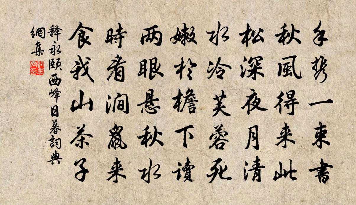 詩詞名句歷史字典書法欣賞書法字典國語詞典說文解字康熙字典古漢語字典標 題 作 者 詩 句 西峰日暮作者:釋永頤 朝代:宋代西峰日暮原文手攜一束書,秋風得來此。松深夜月清,水冷芙蓉死,嫩於檐下讀,兩眼懸秋水。時看澗鼠來,食我山茶子。詩詞問答問:西峰日暮的作者是誰?答:釋永頤問:西峰日暮寫於哪個朝代?答:宋代釋永頤西峰日暮書法欣賞西峰日暮書法作品詩詞推薦和樂道再以詩見寄司馬光〔宋代〕諫垣簪筆接英游,今日華顛昔日尤。邂逅升沉皆是命,逍遙出處本無愁。衡門不羨金門貴,藿食焉知肉食謀。溟海賦黃香梅絕句八首正月二十三作時築樓居將就李壁〔宋代〕一種清香屬當家,將黃對白本非羞。胡床十日花前坐,看得樓成管物華。題范石湖淳熙中出守帖釋善珍〔宋代〕淳熙天子課農桑,黃合鴻儒綰郡章。文物昇平今已遠,斷篇流落入僧房。上清詞蘇軾〔宋代〕南山之幽,雲冥冥兮。孰居此者?帝側之神君。君胡為兮山之幽,顧宮殿兮久淹留。又曷為一朝去此而不顧兮,悲分宜縣項安世〔宋代〕郭內清溪響,溪南列岫光。林花千樹白,嶼柳一川黃。野店明丹堊,郵簽列短長。先生心愛此,車過未須忙。水竹野十詠賞心橋葉茵〔宋代〕沿堤過竹所,履聲驚龜魚。人生適意耳,何必駟馬車。齊天樂 申戌清明雨中感春邵亨貞〔元代〕離歌一曲江南暮,依稀灞橋回首。立馬東風,送人南浦,認得當年楊柳。梨花過後。悄不見鄰牆,弄梅縴手。綺陌送劉晉父監岳樓鑰〔宋代〕濟南劉夫子,生來逢百罹。乃翁負長才,宦遊至京西。時當建炎間,寇盜紛不齊。轉徙入湖廣,一家屢阽危。五羊送顧非熊下第歸江南馬戴〔唐代〕無成西別秦,返駕江南春。草際楚田雁,舟中吳苑人。殘雲掛絕島,迥樹入通津。想到長洲日,門前多白苹。羅漢寺白玉蟾〔宋代〕林閒一徑似驚蛇,中有禪關閉紫霞。煙鎖蒼松遮寺額,風搖翠竹撼檐牙。客來寂寞盤香穗,飯後從容瀹 花。到此閏正月二十五日送客尋春集裴氏園宋祁〔宋代〕尋春送客共留連,雨罷春郊物物妍。黃抹柳梢初遍後,紫粘花萼未開前。朋襟自為交歡悴,醉斝誰能辨聖賢。猶賴九日有感再書方回〔宋代〕荒山過雨薄寒新,洗盡西風扇底塵。萍梗江湖今故國,干戈天地幾遺民。向來佳節都如夢,不謂衰年剩此身。草草題玉壺洞玉壺洞客〔宋代〕洞前流水碧於苔,洞口桃花撲面開。轉頭望斷意不斷,長嘯一聲須再來。戲酬盧秘書王建〔唐代〕芸香閣里人,採摘御園春。取此和仙藥,猶治老病身。運判再以前韻見寄韓維〔宋代〕突兀朱堂冠北城,雲峰滿目互陰晴。憑欄不負思山意,對酒何煩考鼓聲。清話從容雙塵禿,雕章溫麗百金輕。歸軒奉和進船洛水應制(一作孫逖詩)薛昚惑〔唐代〕禁園紆睿覽,仙棹葉宸游。洛北風花樹,江南彩畫舟。榮生蘭蕙草,春入鳳凰樓。興盡離宮暮,煙光起夕流。賀新郎(贈張彥功)劉過〔宋代〕曉印霜花步。夢半醒、扶上雕鞍,馬嘶人去。嵐濕青絲雙轡冷,緩鞚野梅江路。聽畫角,吹殘更鼓。悲壯寒聲撩客眼兒媚(泊松洲)方岳〔宋代〕雁帶新霜幾多愁。和月落滄洲。桂花如許,菊花如許,怎不悲秋。江山例合閒人管,也白幾分頭。去年曾此,今年美人曲張鎡〔宋代〕美人娟娟似秋月,宮中女兒妒欲殺。惡言忽入恩家移,自是君王不情察。深宮夜冷調秦箏,曲曲翻成哀怨聲。願得芣苢佚名〔先秦〕采采芣苢,薄言采之。采采芣苢,薄言有之。采采芣苢,薄言掇之。采采芣苢,薄言捋之。采采芣苢,薄言袺之。名句推薦沉舟側畔千帆過,病樹前頭萬木春。劉禹錫《酬樂天揚州初逢席上見贈》 盧家少婦鬱金堂,海燕雙棲玳瑁梁。沈佺期《古意呈補闕喬知之 / 古意 / 獨不見》 學者非必為仕,而仕者必如學。荀子《荀子·大略》 人皆可以為堯舜。孟子《孟子·告子章句下·第二節》 大凡物不得其平則鳴韓愈《送孟東野序》 遺民忍死望恢復,幾處今宵垂淚痕。陸游《關山月》 風雨淒淒,雞鳴喈喈。佚名《風雨》 覆巢毀卵,而鳳皇不翔;刳胎焚夭,而麒麟不至。劉向《戰國策·趙四·秦攻魏取寧邑》 時雨降矣,而猶浸灌,其於澤也,不亦勞乎!莊子《莊子·內篇·逍遙遊》 世事浮云何足問,不如高臥且加餐。王維《酌酒與裴迪》