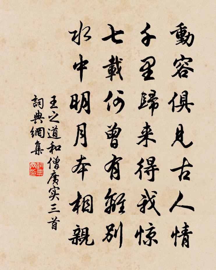 詩詞名句歷史字典書法欣賞書法字典國語詞典說文解字康熙字典古漢語字典標 題 作 者 詩 句 和僧廣實三首作者:王之道 朝代:宋代和僧廣實三首原文動容俱見古人情,千里歸來得我驚。七載何曾有離別,水中明月本相親。詩詞問答問:和僧廣實三首的作者是誰?答:王之道問:和僧廣實三首寫於哪個朝代?答:宋代王之道和僧廣實三首書法欣賞和僧廣實三首書法作品詩詞推薦減字木蘭花范成大〔宋代〕玉煙浮動。銀闕三山連海凍。翠袖闌乾。不怕樓高酒力寒。雙松凍折。忽憶衰翁容易別。想見鷗邊。壓損年時小釣到西峰寺見弟蒙所與僧屋詩因次韻陳著〔宋代〕檄便入雲山,相逢話晚年。慣吟茅屋下,時打葛藤前。應世未圓寬,無人識聖顛。滔滔兒女境,猶抱潁師弦。田家秋日送友於良史〔唐代〕蒼茫日初宴,遙野雲初收。殘雨北山里,夕陽東渡頭。舟依漁溓合,水入田家流。何意君迷駕,山林應有秋。偈頌一百零二首釋紹曇〔宋代〕三十二相,八十種好。馬頷驢腮,彌天羅過。新法華,因甚刺腦入膠盆。過在你,殃及我。立春帖子皇后閣周必大〔宋代〕新年佳節喜相重,屈指元宵五日中。雪柳巧裝金勝綠,燈球斜映玉釵紅。雨中王冕〔元代〕江南江北水滔天,羈客相逢亦可憐。坐覺青山沈席底,行驚白浪上窗前。鵓鳩銜草棲危塔,鴛鴦飛波浴敗船。轉首金剛隨機無盡頌非說所說分第二十一釋印肅〔宋代〕即自謗如來,何因得辨才。和風三二月,花發為誰開。秋日含山道中回寄歷陽希然山人林逋〔宋代〕村落人家總入詩,下驢盤薄立多時。霜陂一掬清於鑒,漱著牙根便憶歸。立春日內出彩花應制沈佺期〔唐代〕合殿春應早,開箱彩預知。花迎宸翰發,葉待御筵披。梅訝香全少,桃驚色頓移。輕生承剪拂,長伴萬年枝。送安律師皇甫冉〔唐代〕出家童子歲,愛此雪山人。長路經千里,孤雲伴一身。水中應見月,草上豈傷春。永日空林下,心將何物親。女冠子(上元)李邴〔宋代〕帝城三五。燈光花市盈路。天街游處。此時方信,鳳闕都民,奢華豪富。紗籠才過處。喝道轉身,一壁小來且住。戲寇君二首陳師道〔宋代〕南鄰歌舞隔牆聽,想對朝窗暈倒青。莫望喚人看娜嫋,只憑幽夢寄丁寧。新雪二首(寄楊舍人)白居易〔唐代〕不思北省煙霄地,不憶南宮風月天。唯憶靜恭楊閣老,小園新雪暖爐前。不思朱雀街東鼓,不憶青龍寺後鍾。唯憶句釋曉瑩〔宋代〕甘棠不翦向來榮。送別周憲使程公許〔宋代〕春風浩蕩龍泓口,逢逢船鼓驚雷吼。皇華使者拜捧徽書,萬里習帆上南斗,岷發報上下十六城,後先持節知幾人。雁山紀游七首靈岩寺薛嵎〔宋代〕千岩崚骨露,隨怪各生形。目力到天盡,心旌倚佛寧。夜鍾傳谷杳,石氣逼燈青。崖腹獼猴住,多年性亦靈。座上贈盧判官白居易〔唐代〕把酒承花花落頻,花香酒味相和春。莫言不是江南會,虛白亭中舊主人。鬬雞詩徐陵〔南北朝〕季子聊為戲。陳王欲聘才。花冠已衝力。芥爪復驚媒。鬬鳳羞衣錦。雙鸞恥鏡台。陳倉若有信。為覓寶雞來。幽程釋文珦〔宋代〕幽程寧憚遠,野外意無窮。山疊高低古,川流宛轉通。采芝隨羽客,拾橡共狙公。爛漫遊三日,塵勞頓覺空。晨坐齋中偶而成詠張九齡〔唐代〕寒露潔秋空,遙山紛在矚。孤頂乍修聳,微雲復相續。人茲賞地偏,鳥亦愛林旭。結念憑幽遠,撫躬曷羈束。仰霄名句推薦輕寒細雨情何限。不道春難管。秦觀《虞美人·碧桃天上栽和露》 更無柳絮因風起,惟有葵花向日傾。司馬光《客中初夏》 想得此時情切,淚沾紅袖黦。韋莊《應天長·別來半歲音書絕》 曉風催我掛帆行,綠漲春蕪岸欲平。查慎行《曉過鴛湖》 十年驅馳海色寒,孤臣於此望宸鑾。戚繼光《望闕台》 道生一,一生二,二生三,三生萬物。老子《老子·德經·第四十二章》 翻空白鳥時時見,照水紅蕖細細香。蘇軾《鷓鴣天·林斷山明竹隱牆》 不蹶于山,而蹶於垤,則細微宜防也。王永彬《圍爐夜話·第五二則》 回首暮雲遠,飛絮攪青冥。蘇軾《水調歌頭·昵昵兒女語》 別來半歲音書絕,一寸離腸千萬結。韋莊《應天長·別來半歲音書絕》