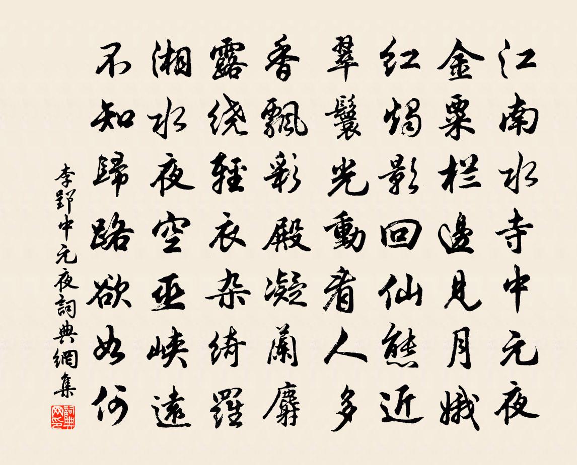 詩詞名句歷史字典書法欣賞書法字典國語詞典說文解字康熙字典古漢語字典標 題 作 者 詩 句 中元夜作者:李郢 朝代:唐代中元夜原文江南水寺中元夜,金粟欄邊見月娥。紅燭影回仙態近,翠鬟光動看人多。香飄彩殿凝蘭麝,露繞輕衣雜綺羅。湘水夜空巫峽遠,不知歸路欲如何。詩詞問答問:中元夜的作者是誰?答:李郢問:中元夜寫於哪個朝代?答:唐代問:中元夜是什麼體裁?答:七律李郢中元夜書法欣賞中元夜書法作品注釋全唐詩:卷590-11詩詞推薦哭孟寂張籍〔唐代〕曲江院裡題名處,十九人中最少年。今日春光君不見,杏花零落寺門前。喜雨呈太守虞儔〔宋代〕精禱能令天意回。猖狂旱魃敢為靈。龍眠熟處雷呼覺,蟻戰酣時雨趁來。耕父荷鋤歌召杜,腐儒秉筆愧鄒杖。太平和孟嶠之諸公游虎邱一首仲並〔宋代〕憑高休惜舉觴頻,聊結華嚴數面親。筇杖止堪扶倦客, * 仍得憩閒身。雪霜侵鬢叵禁老,梅柳迎人俱欲春。後日雜曲歌辭。湖陰曲溫庭筠〔唐代〕祖龍黃須珊瑚鞭,鐵驄金面青連錢。虎髯拔劍欲成夢,日壓賊營如血鮮。海旗風急驚眠起,甲重光搖照湖水。蒼黃和東坡送仲天貺王元直六言韻五首黃庭堅〔宋代〕不怨子堂堂去,蓋念君得得來。家藏會稽妙墨,晚歲喜識方回。書懷寄韋山人寇準〔宋代〕萬事不關慮,孤吟役此生。風騷中旨趣,山水裡心情。眾木凋寒色,空江噴暮聲。終期謁君子,同繞綠苔行。寄夏文州左藏佾文同〔宋代〕寄語文州守,謀邊想甚勞。封疆通鳥鼠,種落雜猿猱。甲馬廉頗少,詩書郄縠高。當須辦乃事,不用恥弓刀。念奴嬌吳儆〔宋代〕相逢恨晚,人誰道、早有輕離輕折。不是無情,都只為、離合因緣難測。秋去雲鴻,春深花絮,風雨隨南北。絮飛吊赤水李先生徐夤〔唐代〕三年悲過隙,一室類銷冰。妻病入仙觀,子窮隨岳僧。荒丘寒有雨,古屋夜無燈。往日清猷著,金門幾欲征。送滕亢擢第歸蘇州拜親岑參〔唐代〕送爾姑蘇客,滄波秋正涼。橘懷三個去,桂折一枝將。湖上山當舍,天邊水是鄉。江村人事少,時作捕魚郎。踏莎行歐陽澈〔宋代〕雁字書空,橘星垂檻。江天水墨秋光晚。香絲裊裊祝堯年,公庭錫宴揮金碗。醉索蠻箋,狂吟象管。珠璣燦燦驚人寄陳適用黃庭堅〔宋代〕日月如驚鴻,歸燕不及社。清明氣妍暖,亹亹向朱夏。輕衣頗宜人,裘褐就椸架。已非紅紫時,春事歸桑柘。空餘新正張耒〔宋代〕春風浩浩春陽盡,老木生芽綠如豆。古巢老烏聲鴉鴉,南陂雨乾麥將秀。人家寒食無一月,青箬蒸魚競時節。白衫題吳參議達觀堂堂牓蓋朱希真所作也僕少亦辱陸游〔宋代〕中原遺老雒川公,鬢須白盡雙頰紅,揮亳為君作齋牓,想見眼中餘子空。餘子碌碌何足數,獨付莊周賈生語。看君河梁吟譚嗣同〔清代〕沙漠多雄風,四顧浩茫茫。落日下平地,蕭蕭人影長。撫劍起巡酒,悲歌慨以慷。束髮遠行游,轉戰在四方。天地鳩梅堯臣〔宋代〕一世為巢拙,長年與鵲爭。欲知雲腳雨,先向屋頭鳴。頸上玉花碎,臆前檀粉輕。何時將刻杖,扶助老夫行。江行遇風董嗣杲〔宋代〕風急難開船,高浪潑銀屋。下水輒畏之,病篙舌愈縮。商人貨物重,久諳風信熟。我舟輕抵葉,帆破無完幅。歸心慶梅州劉侯修葺程鄉學宮落成三章林陶〔宋代〕孰不為邦,孰守其鄉。如被錦衣,晝行輝煌。侯曰上恩,曷敢弭忘。何以報之,俾民向方。對鏡白居易〔唐代〕三分鬢髮二分絲,曉鏡秋容相對時。去作忙官應太老,退為閒叟未全遲。靜中得味何須道,穩處安身更莫疑。若使夜二首杜甫〔唐代〕白夜月休弦,燈花半委眠。號山無定鹿,落樹有驚蟬。暫憶江東鱠,兼懷雪下船。蠻歌犯星起,空覺在天邊。城郭名句推薦末路驚風雨,窮邊飽雪霜文天祥《除夜》 亂山殘雪夜,孤燭異鄉人。崔塗《除夜 / 巴山道中除夜書懷 / 除夜有懷》 以言取人,人飾其言;以行取人,人竭其行。佚名《逸周書·卷九·芮良夫解》 野橋經雨斷,澗水向田分。劉長卿《碧澗別墅喜皇甫侍御相訪》 輪台東門送君去,去時雪滿天山路。岑參《白雪歌送武判官歸京》 以不忍人之心,行不忍人之政,治天下可運之掌上。孟子《孟子·公孫丑章句上·第六節》 鳥向檐上飛,雲從窗里出。吳均《山中雜詩》 又說今夕天津,西畔重歡遇。吳文英《荔枝香近·七夕》 小池寒綠欲生漪,雨晴還日西。秦觀《阮郎歸·春風吹雨繞殘枝》 權衡損益,斟酌濃淡。芟繁剪穢,弛於負擔。劉勰《文心雕龍·熔裁》