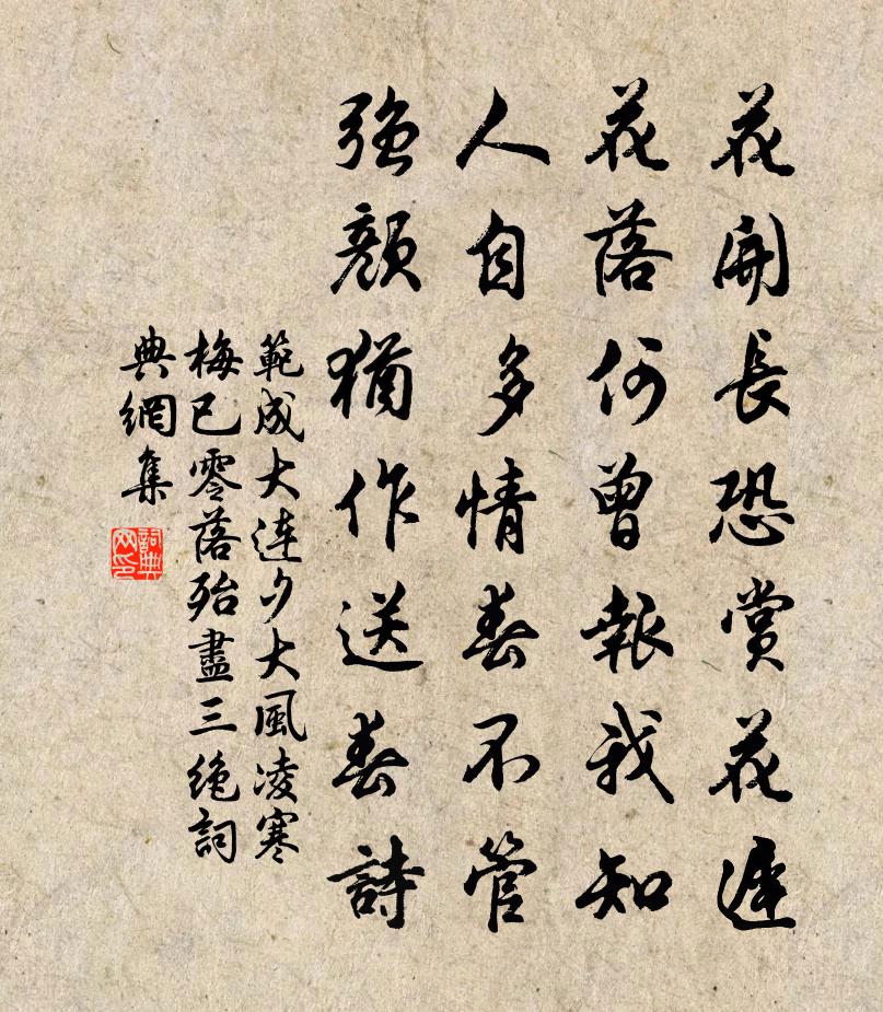 詩詞名句歷史字典書法欣賞書法字典國語詞典說文解字康熙字典古漢語字典標 題 作 者 詩 句 連夕大風,凌寒梅已零落殆盡三絕作者:范成大 朝代:宋代原文花開長恐賞花遲,花落何曾報我知。人自多情春不管,強顏猶作送春詩。詩詞問答問:《連夕大風,凌寒梅已零落殆盡三絕》的作者是誰?答:范成大問:該詩寫於哪個朝代?答:宋代問:范成大的名句有哪些?答:范成大名句大全書法欣賞連夕大風,凌寒梅已零落殆盡三絕書法作品詩詞推薦迎廣帥徐意一大參五首李昴英〔宋代〕杜劉二子潁川居,出處雖同語嘿殊。勿謂寒蟬吾原學,閉門自辦靜工夫。安撫大資李參政生辰喻良能〔宋代〕崧岳生申占臘前,預將和氣作春妍。蟠桃結實三千歲,蓮葉成巢幾百年。聊向蓬萊開燕寢,即紆袞繡畫凌煙。只應洪州曾鞏〔宋代〕洪州城中荒且遠,每到弱馬常驅馳。交朋顧我亦已厚,謝詞有禮寧當違。人生有累乃汲汲,萬事敦迫如銜羈。山中西江月 以上二首見丹經極論,未注作者佚名〔宋代〕一理無今無古,此心何喜何嗔。無相乃為真相。色身即是法身。不消一句半句,活得千人萬人。咦,這裡便是到頭挽陳運管安人孫氏薛嵎〔宋代〕舅家如母在,慟哭淚沾襟。平日經聲斷,茲晨佛力深。墓廬猶手構,梱則是夫箴。山上半慈竹,從知契夙心。道中聞百舌釋紹嵩〔宋代〕一徑尋村渡碧溪,山花紅紫樹高低。如今天下無鳴鳳,說與春鳥自在啼。投李益賈島〔唐代〕四十歸燕字,千年外始吟。已將書北嶽,不用比南金。淳化中朝會二十三首佚名〔宋代〕禮樂昭王業,環區致太平。革車停北狩,雲稼屢四成。國有祥延詔,鄉聞講育聲。日華融五色,遐邇仰文明。六月三日大風雨蔡忠惠家玉堂紅一洗而盡因憶陳宓〔宋代〕三年渴想玉堂紅,六月都隨一夜風。卻憶去年當此際,一時台府饋筠籠。享太廟樂章蕭仿〔唐代〕於鑠丕嗣,惟帝之光。羽籥象德,金石薦祥。聖系無極,景命永昌。神降上哲,維天配長。雙雁兒佚名〔宋代〕這心事、倚他誰。龍鶴禱雨馮時行〔宋代〕地靈丘壑邃,危路入紫煙。藤蘿閟尺水,中有龍潛淵。青曦弄驕暉,紹興丙辰年。嗷嗷周余民,生理諒難全。令尹一春四十日天氣未佳花事行復已矣太息成吟舒岳祥〔宋代〕積翠林塘十畝陰,雨中不覺變流音。江山萬里登樓眼,宇宙千年隱几心。有客不來還日暮,掩書無語自春深。倚闌師文莫君以仆治東園甚力官滿且去為賦詩以道毛滂〔宋代〕小桃繁杏何須論,只要池邊竹半林。不養鳧鷖憐淥淨,苦留風月伴清深。後人來蔭十圍木,故老看移一畝陰。分付石灶孫應時〔宋代〕石灶滄潭上,烹茶定幾回。舟人因記得,俗客未經來。齋中弄筆偶書示子聿陸游〔宋代〕左右琴樽靜不嘩,放翁新作老生涯。焚香細讀斜川集,候火親烹顧渚茶。書為半酣差近古,詩雖苦思未名家。一窗謝寺雙檜(揚州法雲寺謝鎮西宅,古檜存焉)劉禹錫〔唐代〕雙檜蒼然古貌奇,含煙吐霧郁參差。晚依禪客當金殿,初對將軍映畫旗。龍象界中成寶蓋,鴛鴦瓦上出高枝。長明東陽方韶卿惠古意七篇久不得和五月二十六日戴表元〔宋代〕營營寄巢蜂,白書爭空花。跋跋緣壁蟲,喧飛亂如麻。譬如惡俗士,便不揮鞭撾。桐君何處來,隔壁聞瓠巴。永佑陵喻良能〔宋代〕小臣生長宣和初,深仁浹髓淪肌膚。只今白首馮唐似,何幸清齋拜鼎湖。超覽堂徐大忠〔宋代〕君候雅有博大見,胸次不使倥傯蝕。一朝放步城東南,超然神會而心得。咄嗟高棟倚層空,振古奇觀今未識。桃花名句推薦柳庭風靜人眠晝,晝眠人靜風庭柳。蘇軾《菩薩蠻·回文夏閨怨》 秋風起兮木葉飛,吳江水兮鱸正肥。張翰《思吳江歌》 鬧里掙錢,靜處安身。佚名《增廣賢文·上集》 鳥雀呼晴,侵曉窺檐語。周邦彥《蘇幕遮·燎沉香》 醉後涼風起,吹人舞袖回。李白《與夏十二登岳陽樓》 曲岸持觴,垂楊系馬,此地曾經別。辛棄疾《念奴嬌·書東流村壁》 吾嘗跂而望矣,不如登高之博見也。荀子《荀子·勸學》 讀書不作儒生酸,躍馬西入金城關。謝逸《送董元達》 馬思邊草拳毛動,雕眄青雲睡眼開。劉禹錫《始聞秋風》 萬物並育而不相害。道並行而不相悖。小德川流;大德敦化。子思《中庸·第三十章》