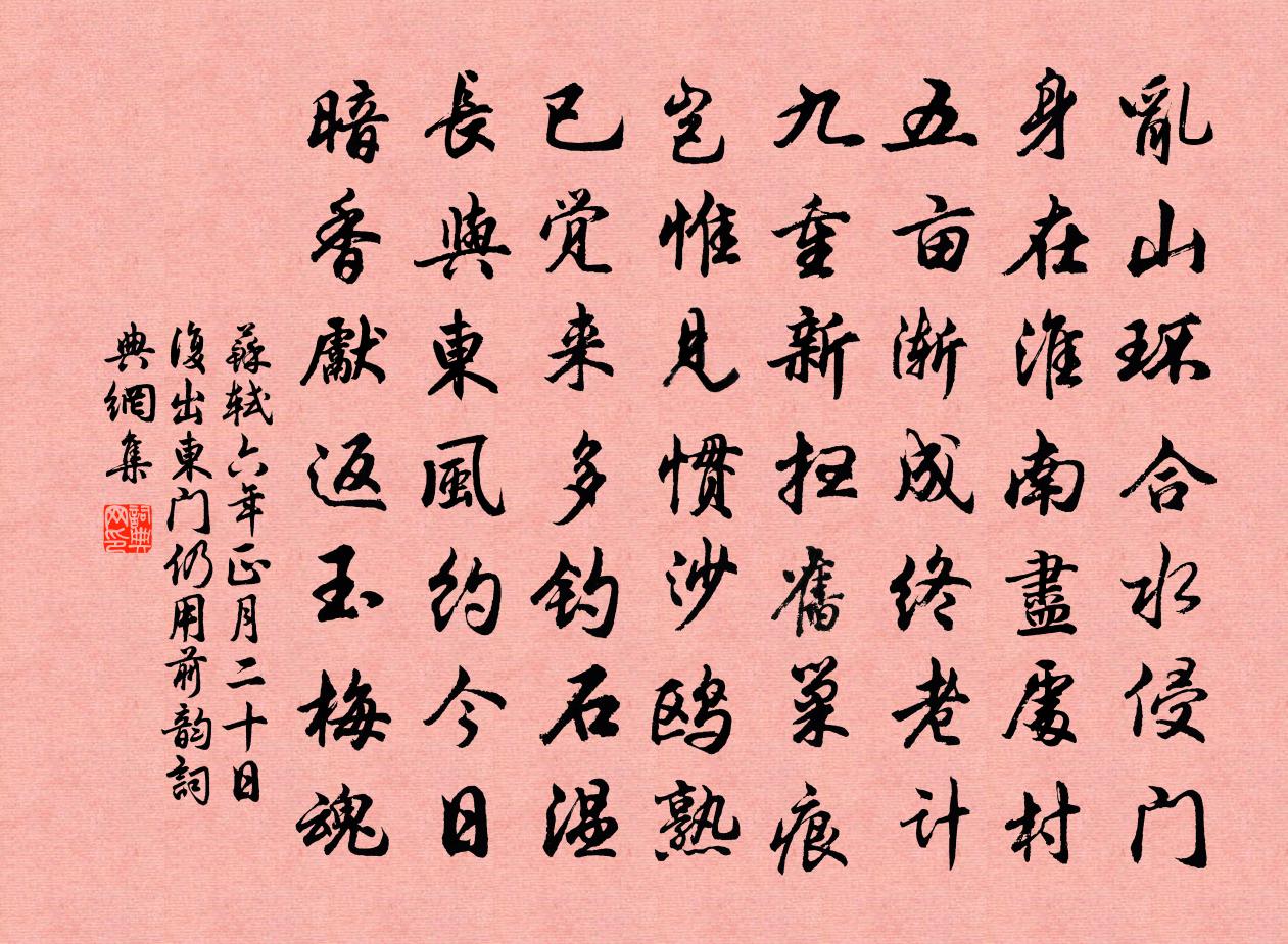 這首詩作於元豐六年(公元1083年),此時蘇軾在黃州。蘇軾在公元1081年(元豐四年),作《正月二十日往岐亭郡人潘古郭三人送余於女王城東禪莊院》。公元1082年(元豐五年),作《正月二十日與潘郭二生出郊尋春忽記去年是日同至女王城作詩乃和前韻》。這年作此詩,仍用前韻,稱“復出東門”,指上一次正月二十日出東門尋春,這年再出東門尋春,在尋春里有希望朝廷再起用他的含意。