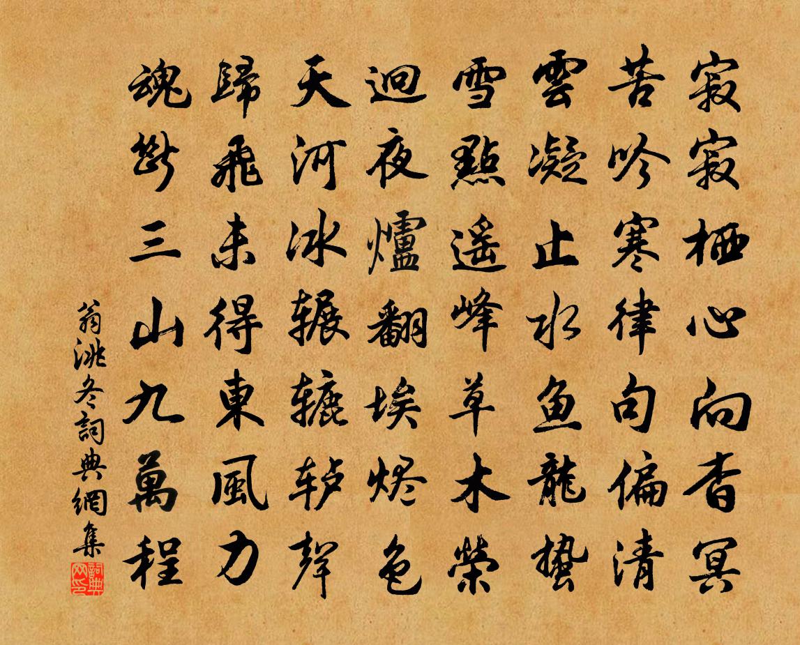 詩詞名句歷史字典書法欣賞書法字典國語詞典說文解字康熙字典古漢語字典標 題 作 者 詩 句 冬作者:翁洮 朝代:唐代冬原文寂寂棲心向杳冥,苦吟寒律句偏清。雲凝止水魚龍蟄,雪點遙峰草木榮。迥夜爐翻埃燼色,天河冰輾轆轤聲。歸飛未得東風力,魂斷三山九萬程。詩詞問答問:冬的作者是誰?答:翁洮問:冬寫於哪個朝代?答:唐代問:冬是什麼體裁?答:七律翁洮冬書法欣賞冬書法作品注釋全唐詩:卷667-36詩詞推薦啄木兒 啄木兒共五首,第一首前多出數句似王哲〔元代〕自知自知。只此分明是。自此自此。得一併無四。在虛空里。撒金蕊。萬道霞光通表里。復元初、見本始。要練正聲聲慢仇遠〔宋代〕藏鶯院靜,浮鴨池荒。綠陰不減紅芳。高臥虛堂。南風時送微涼。游韉踐香未遍,怪青春、別我堂堂。閒里好,有和酒歌趙希逢〔宋代〕安得鏡湖分一曲,寧可不受千鍾錄。百年三萬六千場,認取醉鄉去路熟。猖狂莫學少年時,身心早已偃鼓旗。速營繡婦嘆白居易〔唐代〕連枝花樣繡羅襦,本擬新年餉小姑。自覺逢春饒悵望,誰能每日趁功夫。針頭不解愁眉結,線縷難穿淚臉珠。雖憑次韻王定國得晉卿酒相留夜飲蘇軾〔宋代〕短衫壓手氣橫秋,更著仙人紫綺裘。使我有名全是酒,從他作病且忘憂。詩無定律君應將,醉有真鄉我可侯。且倒上元日劉筠〔宋代〕漢典久傳祠太乙,竺墳亦說會夫人。蟾蜍吐耀祥輪滿,菡萏凝華寶檠新。風轉相竽來帝樂,香焚夾道雜車塵。承平詩二首施清臣〔宋代〕花里蝶,花里休。蓼中蟲,蓼中死。人生甜苦皆是緣,法中可隨順應之。雜曲歌辭。長安少年行十首李廓〔唐代〕金紫少年郎,繞街鞍馬光。身從左中尉,官屬右春坊。剗戴揚州帽,重熏異國香。垂鞭踏青草,來去杏園芳。追逐書事趙蕃〔宋代〕山溪急宵舂,野市赴朝糴。人言非踴貴,富者猶露積。豐年且不飽,惡歲真可豐。懸釜以待炊,衾裯寧許直。遼西作(一作關西行)崔顥〔唐代〕燕郊芳歲晚,殘雪凍邊城。四月青草合,遼陽春水生。胡人正牧馬,漢將日徵兵。露重寶刀濕,沙虛金鼓鳴。寒衣雜興張鎡〔宋代〕達士樂貧賤,本非沽激心。豈真昧生死,而計樂淺深。辛勤畢婚嫁,塵慮寧更侵。高蹤五嶽游,乘風擬相尋。次玩鞭亭小詩韻陳造〔宋代〕竊祿未辭官九品,歸田止欠屋三間。著書他日藏岩穴,或繼淮南大小山。山中胡仲弓〔宋代〕世情紛醉夢,抱獨入山林。有竹堪翳俗,無弦誰賞音。松蘿青嶂合,雞犬白雲深。未必幽居者,能賡梁甫吟。送心非庵釋心月〔宋代〕是是金鱗猶滯水,非非獅子又翻身。蜀山佳處是非外,佛法憑誰作主人。贈常州院僧姚合〔唐代〕一住毗陵寺,師應只信緣。院貧人施食,窗靜鳥窺禪。古磬聲難盡,秋燈色更鮮。仍聞開講日,湖上少魚船。洛陽詠古(一作胡曾詩)司空圖〔唐代〕石勒童年有戰機,洛陽長嘯倚門時。晉朝不是王夷甫,大智何由得預知。覺報和蒲溪方丈送友歸顧逢〔宋代〕汶陽詩板在,拂拭劍池前。欲識無由得,相逢豈偶然。溪蒲涼雨後,塞雁斷雲邊。又作家山計,巴陵有便船。排悶陸游〔宋代〕老去知心少,流塵鎖斷弦。尊空問字酒,囊罄作碑錢。掃葉供朝爨,和泥補漏船。胸中元浩浩,白眼望青天。歸舟大雪中入運河,過萬家湖楊萬里〔宋代〕雪漫水面淡模糊,釀出羔兒酒一壺。已被膻腴翳醽醁,更添牛乳點春酥。銷金帳下有此否,藥玉船中不用酤。忽見感興陳造〔宋代〕如鏡江流去,賓士合自羞。病容霜後葉,歸興浪前漚。岐路三生債,風埃一飽謀。山田饒芋栗,珍重故園秋。名句推薦傷心秦漢,生民塗炭,讀書人一聲長嘆。張可久《賣花聲·懷古》 今日獨來香徑里,更無人跡有苔錢。韓偓《寒食日重遊李氏園亭有懷》 窗含西嶺千秋雪,門泊東吳萬里船。杜甫《絕句》 金柳搖風樹樹,系彩舫龍舟遙岸。柳永《破陣樂·露花倒影》 酒伴來相命,開尊共解酲。孟浩然《春中喜王九相尋 / 晚春》 執子之手,與子偕老。詩經《擊鼓》 祁祁傷豳歌,萋萋感楚吟謝靈運《登池上樓》 迴廊四合掩寂寞,碧鸚鵡對紅薔薇。李商隱《日射》 客子光陰詩卷里,杏花訊息雨聲中。陳與義《懷天經智老因訪之》 守職而不廢,處義而不回。黃石公《素書·正道》