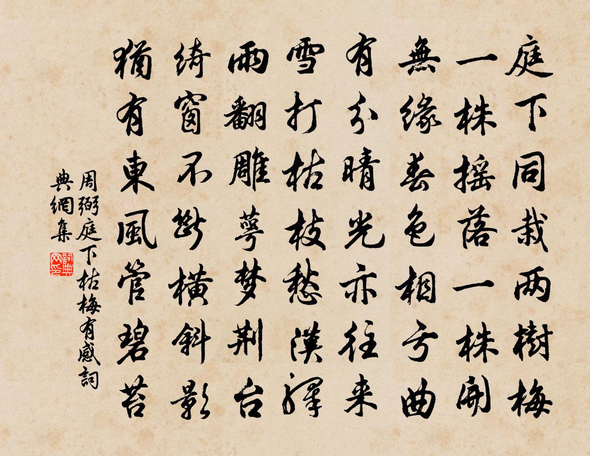 詩詞名句歷史字典書法欣賞書法字典國語詞典說文解字康熙字典古漢語字典標 題 作 者 詩 句 庭下枯梅有感作者:周弼 朝代:宋代庭下枯梅有感原文庭下同栽兩樹梅,一株搖落一株開。無緣春色相虧曲,有分晴光亦往來。雪打枯枝愁漢驛,雨翻雕萼夢荊台。綺窗不斷橫斜影,猶有東風管碧苔。詩詞問答問:庭下枯梅有感的作者是誰?答:周弼問:庭下枯梅有感寫於哪個朝代?答:宋代周弼庭下枯梅有感書法欣賞庭下枯梅有感書法作品詩詞推薦題伏龜山北隅徐鉉〔唐代〕茲山信岑寂,陰崖積蒼翠。水石何必多,宛有千岩意。孰知近人境,旦暮含佳氣。池影搖輕風,林光澹新霽。支頤望江南/憶江南李綱〔宋代〕清晝永,幽致夏來多。遠岸參差風揚柳,平湖清淺露翻荷。移棹釣煙波。涼一霎,飛雨灑輕蓑。滿眼生涯千傾浪,送東川馬逢侍御使回十韻元稹〔唐代〕風水荊門闊,文章蜀地豪。眼青賓禮重,眉白眾情高。思勇曾吞筆,投虛慣用刀。詞鋒倚天劍,學海駕雲濤。南郡乙丑元日口號十首劉克莊〔宋代〕遵新天子法永阜,為先皇帝服通喪。初元年素幄視草,千萬世青史有光。送別羅堅文度正〔宋代〕共席勝冠日,分頭既仁年。許身要到聖,論德未能賢。歲月於何駐,工夫在力肩。有言堪記憶,隨處是耕佃。台州四詩尤袤〔宋代〕百病瘡痍費撫摩,官供仍愧拙催科。自憐鞅掌成何事,贏得霜毛一倍多。東屯莊監秤六言三首劉學箕〔宋代〕讀書不執箋注,治生奚用豐財。詩吟一首兩首,酒飲三杯五杯。石田茅屋無恙,不與亂生蒼苔。山居雜詩九十首曹勛〔宋代〕早年困胡虜,驚痛失方寸。居常雖勉勉,臨事輙悶悶。作字每誤墨,裁詩或失韻。老來疾益侵,薾然誰可論。偈頌一百三十六首釋惟一〔宋代〕飛雪亭前,宜春台上。物有萬殊,春無兩樣。住不雇去底,猶欠劈面拳。去不雇住底,好與攔腮掌。直饒去住兩忘憶舊遊(過故園有感)張炎〔宋代〕記凝妝倚扇,笑眼窺簾,曾款芳尊。步屧交枝徑,引生香不斷,流水中分。忘了牡丹名字,和露撥花根。甚杜牧重禪人寫真求贊釋正覺〔宋代〕說時不藉口,用處不依身。天寒絕飛鳥,潭淨無游鱗。點活眼,著精神,野草閒華自在春。相和歌辭。神弦曲李賀〔唐代〕西山日沒東山昏,旋風吹馬馬踏雲。畫弦素管聲淺繁,花裙繂(糹蔡)步秋塵。桂葉刷風桂墜子,青狸哭血寒狐死寄題盧君斗齋秦觀〔宋代〕俠氣軒軒翰墨場,邅迥世路鬢成霜。出從車馬行千里,歸與琴書寄一方。鳥囀入簾春欲破,爐香侵夢日初長。扁舟同年鄭貴溫寺丞直華文閣致仕次韻為賀樓鑰〔宋代〕先生久矣愛吾廬,絕勝揚雄宅一區。賸有珠宮來海石,不妨茅屋繞畦蔬。來書已許尋前諾,同社方將約並驅。更欲湘妃怨曹勛〔宋代〕委瓊佩兮重淵,稅鸞車兮深山。望蒼梧兮不極,與流水而潺湲。都梁北鄉士多好學有向君敏衡者一日訪予語甚牟巘五〔宋代〕廉崖千仞孰能幹,一見令人毛髮寒。可以人而不如石,我當為石共衣冠。送雍陶入蜀賈島〔唐代〕江山事若諳,那肯滯雲南。草色分危磴,杉陰近古潭。日斜褒谷鳥,夏淺巂州蠶。吾自疑雙鬢,相逢更不堪。食竹{左鼠右留}黃榦〔宋代〕北山何嗟峨,猛虎之所藏。咆哮一震怒,百獸不敢當。有竹山之阿,挺挺青琳琅。威鳳鳴且棲,眾鳥空回皇。彼{寄西弟六首劉黻〔宋代〕向上工夫肯憚難,須知簣上可為山。若還志力無迴轉,直透龍門亦等閒。酹江月舒頔〔元代〕三槐氏胄,早榮升大府,展施才調。應欲濡須兵革後,幾度愁紆懷抱。翦燭寒更,催科春晚,諸事安排了。簿書叢名句推薦送客自傷身易老,不知何處待先生。劉滄《贈道者》 今夜月明人盡望,不知秋思落誰家。王建《十五夜望月寄杜郎中》 落葉聚還散,寒鴉棲復驚。李白《三五七言 / 秋風詞》 恩疏寵不及,桃李傷春風。李白《上之回》 泉眼無聲惜細流,樹陰照水愛晴柔楊萬里《小池》 橫看成嶺側成峰,遠近高低各不同。蘇軾《題西林壁》 誰知江上酒,還與故人傾。周紫芝《臨江仙·送光州曾使君》 一郡官閒唯副使,一年冷節是清明。王禹偁《清明日獨酌》 粽包分兩髻,艾束著危冠。陸游《乙卯重五詩》 至長反短,至短反長,天之道也。呂不韋《呂氏春秋·論·似順論》