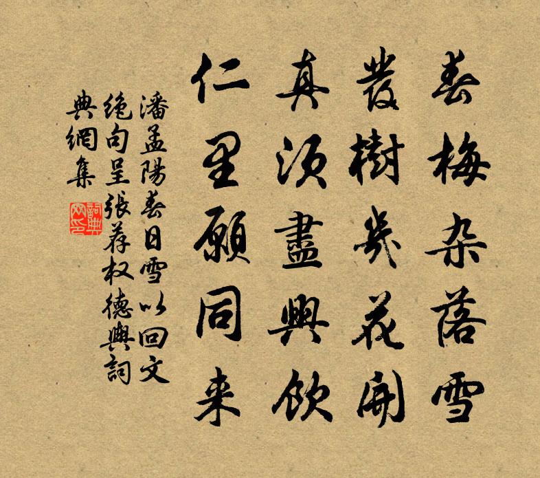 詩詞名句歷史字典書法欣賞書法字典國語詞典說文解字康熙字典古漢語字典標 題 作 者 詩 句 春日雪以回文絕句呈張薦權德輿作者:潘孟陽 朝代:唐代原文春梅雜落雪,發樹幾花開。真須盡興飲,仁里願同來。詩詞問答問:《春日雪以回文絕句呈張薦權德輿》的作者是誰?答:潘孟陽問:該詩寫於哪個朝代?答:唐代問:該詩是什麼體裁?答:五絕書法欣賞春日雪以回文絕句呈張薦權德輿書法作品注釋全唐詩:卷330-15詩詞推薦菊花十二首史鑄〔宋代〕一夜新霜著瓦輕,照窗寒菊近人清。勝收芳蕊浮卮酒,白髮年年不負盟。霖雨苦多江湖暴漲塊然獨望因題北亭白居易〔唐代〕自作潯陽客,無如苦雨何。陰昏晴日少,閒悶睡時多。湖闊將天合,雲低與水和。籬根舟子語,巷口釣人歌。霧鳥齊天樂 壽王伯起張伯淳〔元代〕庭柯一葉炎曦淡,秋光宦情相似。駟馬爭馳,千帆竟送,不羨紛紛時輩。隨緣賦祿,慶官府清明,紀綱興起。暇日賣花聲(閨思)康與之〔宋代〕蹙損遠山眉。幽怨誰知。羅衾滴盡淚胭脂。夜過春寒愁未起,門外鴉啼。惆悵阻佳期。人在天涯。東風頻動小桃枝浣溪沙韋莊〔唐代〕惆悵夢余山月斜,孤燈照壁背窗紗,小樓高閣謝娘家。暗想玉容何所似,一枝春雪凍梅花,滿身香霧簇朝霞。李昭象雲與二三同人見訪有寄杜荀鶴〔唐代〕得君書後病顏開,雲拉同人訪我來。在路不妨沖雨雪,到山還免踏塵埃。吟瀋水閣何宵月,坐破松岩幾處苔。貧舍四安道中所見牟巘五〔宋代〕亭亭明月無一伴,一意孤行天地間。憐我扁舟連夜發,肯分清影到蒼灣。黃鶴洞中仙 繼重陽韻馬鈺〔元代〕因遇出囂塵,終日常顛耍。狂舞狂歌任自然,無意馬。收得靈靈帕。。真水湧來高,真火降來下。黃鶴洞中仙要成對仙華雪懷方鳳〔宋代〕仙華萬仞石離離,山上嶄嶄萬壑危。雪與梅花俱在望,琴攜野鶴轉相隨。清如和靖西湖夜,興如王猷剡上時。我欲黃鶴洞中仙王哲〔元代〕你待堅心走。我待堅心守。栗子甘甜美芋頭。翁母同張口。開取四時花,綻取三春柳。一性昭然全得他,玉液瓊漿喜雨賀鑄〔宋代〕終春久旱暵,涉夏俄溽暑。垢汗浼衣襟,梅津蒸柱礎。黃霾閉赤景,測候錯辰午。沙燕逐風鳶,翻飛遡來雨。紛紛鄭侍郎送蠟梅次韻三首曾幾〔宋代〕江梅難以蠟妝成,女手雖工未必能。香氣惱人眠不著,若為學得定中僧。舟行得風晚至靈洲楊萬里〔宋代〕春盡儂隨去,江行興未窮。時煩數點雨,輕灑一孤篷。岸樹蒼茫外,人家點綴中。海神能餞我,借與半帆風。歸城中再用前韻邵雍〔宋代〕乘興龍山訪盡幽,恰如人在畫圖游。恨無美酒酬佳景,正欲留時不得留。張道宗比部輓詩三首文同〔宋代〕學富詞章妙,才高志力強。帝方知可用,官欲漸難量。始得西原使,才終石省郎。念公今止此,無語問蒼蒼。頌古三十三首釋師觀〔宋代〕漢既不管,秦亦不收。人平不語,水平不流。山居晚步周南〔宋代〕步擔腰鎌急,平疇瀝稻稀。水雲漫白道,烓灶起青霏。縫塔隨煙暝,巢烏擇木飛。年豐閒正少,乘屋匠人歸。夏雨嘆陸游〔宋代〕蝸捨入門楣觸額,黃泥壁作龜兆坼。雨多潦水欲上階,臥聽鳧鴨聲拍拍。日高糴米奴未回,坐知薄飯未容索。仕羞菩薩蠻(秋興)劉辰翁〔宋代〕芭蕉葉上三更雨。人生只合隨他去。便不到天涯。天涯也是家。屏山三五疊。處處飛胡蝶。正是菊堪看。東籬獨自偶得吟邵雍〔宋代〕人間事有難區處,人間事有難安堵。有一丈夫不知名,靜中只見閒揮麈。名句推薦獨自淒涼還自遣,自製離愁。龔自珍《浪淘沙·寫夢》 青林翠竹,四時俱備。陶弘景《答謝中書書》 天不老,情難絕。張先《千秋歲·數聲鶗鴂》 胭脂淚,相留醉,幾時重。李煜《相見歡·林花謝了春紅》 料有牽情處,忍思量、耳邊曾道。時彥《青門飲·寄寵人》 曾把芳心深相許。故夢勞詩苦。史達祖《留春令·詠梅花》 夕陽牛背無人臥,帶得寒鴉兩兩歸。張舜民《村居·水繞陂田竹繞籬》 人情若比初相識,到底終無怨恨心。馮夢龍《醒世恆言·卷一》 玉碗冰寒滴露華,粉融香雪透輕紗。晏殊《浣溪沙·玉碗冰寒滴露華》 凡戰,所謂攻者,知彼者也。佚名《百戰奇略·第四卷·攻戰》
