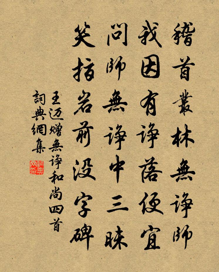 詩詞名句歷史字典書法欣賞書法字典國語詞典說文解字康熙字典古漢語字典標 題 作 者 詩 句 贈無諍和尚四首作者:王邁 朝代:宋代贈無諍和尚四首原文稽首叢林無諍師,我因有諍落便宜。問師無諍中三昧,笑指岩前沒字碑。詩詞問答問:贈無諍和尚四首的作者是誰?答:王邁問:贈無諍和尚四首寫於哪個朝代?答:宋代王邁贈無諍和尚四首書法欣賞贈無諍和尚四首書法作品詩詞推薦夜憂孟郊〔唐代〕豈獨科斗死,所嗟文字捐。蒿蔓轉驕弄,菱荇減嬋娟。未遂擺鱗志,空思吹浪旋。何當再霖雨,洗濯生華鮮。孫常州輓詩戴表元〔宋代〕白髮何人在,青山此老歸。殉攜貧日硯,斂著賜余衣。文物鷗興滅,園林鶴是非。諸公莫惆悵,英爽世間稀。生查子趙師俠〔宋代〕遲遲春晝長,冉冉東風軟。寒食乍晴天,紅紫芳菲遍。前峰積翠橫,新漲挼藍遠。向晚淡煙迷,一段屏山展。高宗皇帝輓詞二首倪思〔宋代〕稽古神文煥,中興武烈光。挈圖親授子,體道妙為皇。萬乘隆尊養,千齡甫壽康。龍湖俄趣駕,遽返白雲鄉。侍親由三山還東陽喻良能〔宋代〕南雪不到地,玄冬偏滿山。春風仍料峭,彩袂正斕斑。廣廈千間靜,虛空一宿閒。此身如羽翼,飛倦始知還。鶴聯句滕宗諒〔宋代〕上霄降靈氣,鍾此千年禽。幽間靖節性,孤高伯夷心。頡頏紫霄垠,飄颻滄浪潯。岳湛有仙姿,多鈞韶無俗音。毛雨中趙蕃〔宋代〕四月梅黃雨易成,夜來猶是十分晴。吳山越嶺渾遮盡,惟見江流面面平。句吳沆〔宋代〕葉稀林脫穎,沙現水分鑣。和興化趙令君二首劉克莊〔宋代〕落筆昔傳九天上,誅茅今老萬山中。殷勤封內種花令,物色畦間拾穗翁。道是單傳曾雪立,元來一字恥雷同。語君首尾吟邵雍〔宋代〕堯夫非是愛吟詩,詩是堯夫代記時。官職固難稱太史,文章卻欲學宣尼。能歸豈謝陶元亮,善聽何慚鍾子期。德若新歲雪霽到西湖作三首宋庠〔宋代〕水華煙熊壓回汀,客至無情亦有情。芳草不須緣短夢,一番新綠滿塘生。送徐君奇入燕方回〔宋代〕貌寢如孫叔,貲單未計然。曾微方朔辯,已過買臣年。插翅能逾海,乘槎可上天。問君何所恃,珠玉富千篇。漁家傲·五月榴花妖艷烘歐陽修〔宋代〕五月榴花妖艷烘。綠楊帶雨垂垂重。五色新絲纏角粽。金盤送。生綃畫扇盤雙鳳。正是浴蘭時節動。菖蒲酒美清尊次韻忠甫初見菊開馮伯規〔宋代〕積雨曉放霽,紅日照我帷。起來步幽蹊,金蕊燦朱扉。芳姿自嫵媚,微香襲人衣。令節無多日,更宜擁培之。三徑廣潤寺新寮釋自南〔宋代〕客不赴齋招,冥心坐寂寥。青山若厭看,白日也難消。鷺起沖荷葉,蟲竹蝕菊苗。何年稱老宿,來住此間寮。偶成曹彥約〔宋代〕惡習起時能自訟,誰知此是天然勇。多少禪流妄詆訶,不如此勇元不動。恩平燈夕憶上都舊遊呈座客黃公度〔宋代〕千尺鰲山面紫宸,豪華曾見夾城春。至今魂夢鈞天奏,投老宦遊窮海濱。隨分尊罍奉佳客,記時燈火照嚴闉。年來苦熱和徐山甫韻金履祥〔宋代〕地卷槁苗盡,人居沸鼎中。何時霖雨相,夢到武丁宮。雨中過沙灘二首楊萬里〔宋代〕煙雨新圖學不成,煙能明晦雨能聲。莫教一點春風起,卷盡空濛寫晚晴。七月初五夜養正堂示諸友戴表元〔宋代〕客裹猶多事,秋來又一旬。青天星斗淨,白露稻梁新。留落空存節,炎涼莫問人。儒堂得佳伴,吟諷動比鄰。名句推薦善惡同,則功臣倦。黃石公《三略·上略》 君馬黃,我馬白。李白《君馬黃》 枯枝無醜葉,涸水吐清泉李白《長歌行》 東家頭白雙女兒,為解挑紋嫁不得。元稹《織婦詞》 誰知道,斷煙禁夜,滿城似愁風雨劉辰翁《永遇樂·璧月初晴》 道同方獲其利,道異惟受其害。來俊臣《羅織經·察奸卷第八》 拜迎長官心欲碎,鞭撻黎庶令人悲。高適《封丘作》 醉後莫思家,借取師師宿。晏幾道《生查子·落梅庭榭香》 春草細還生,春雛養漸成。揭傒斯《畫鴨》 秋色從西來,蒼然滿關中。岑參《與高適薛據同登慈恩寺浮圖》